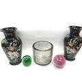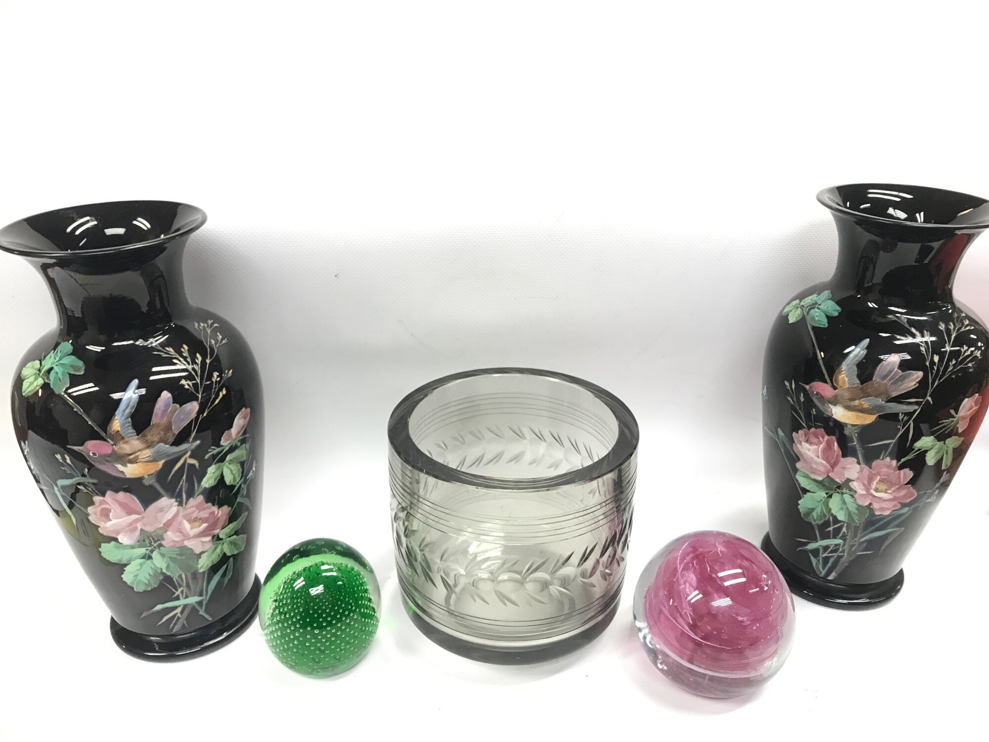 Glass cut vase , a pair of 20th century vases decorated with enamel flowers and bird design and two modern glass paperweights. 7 to 24cm tall