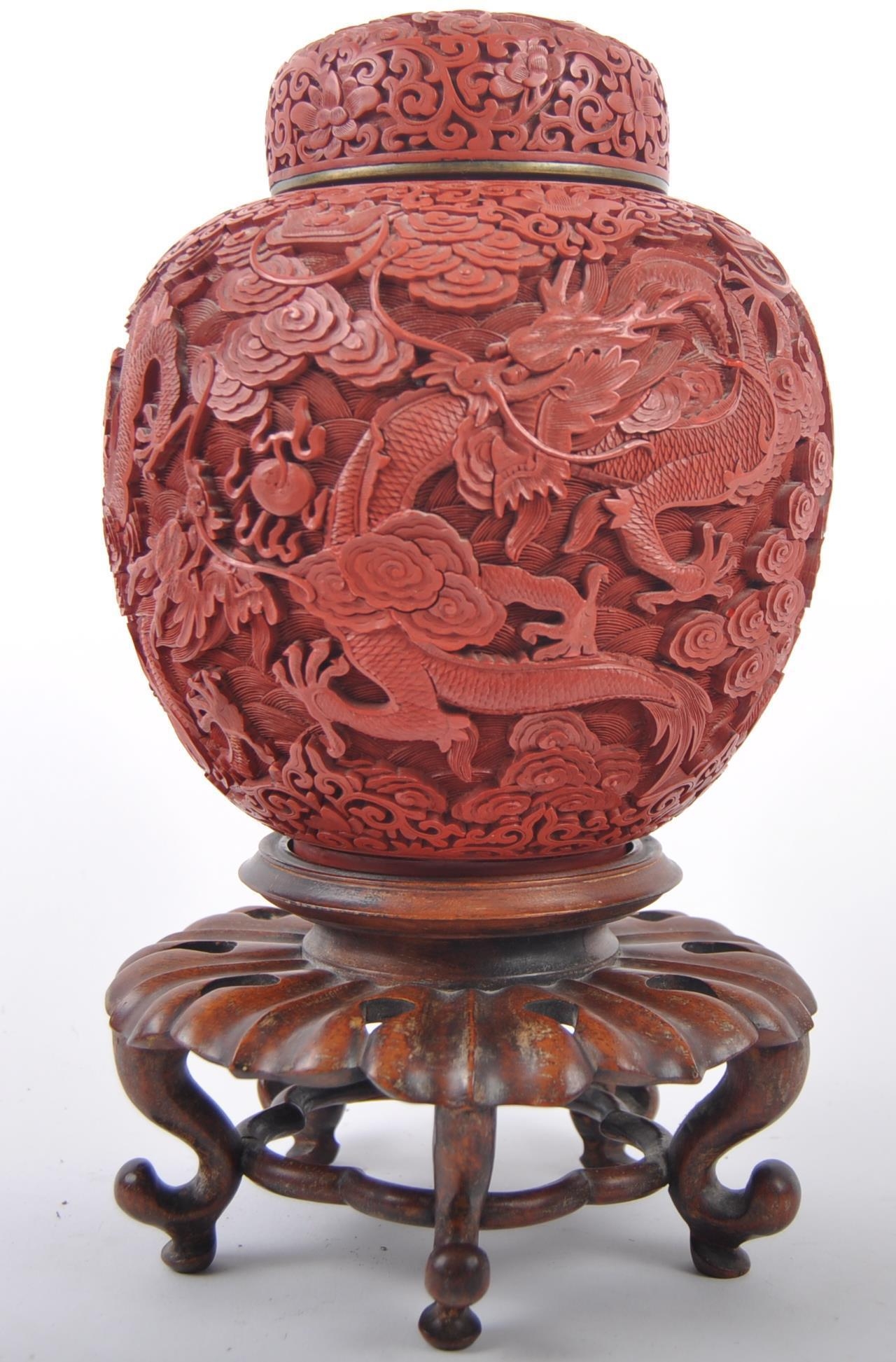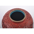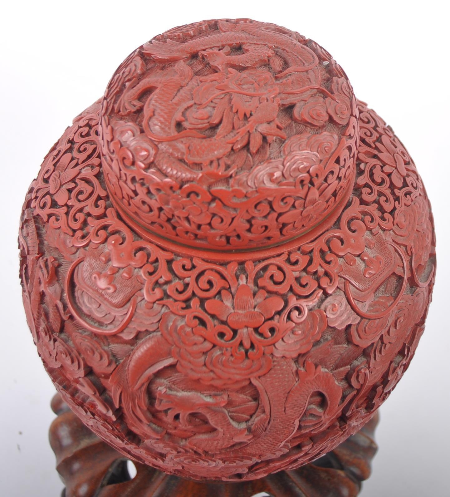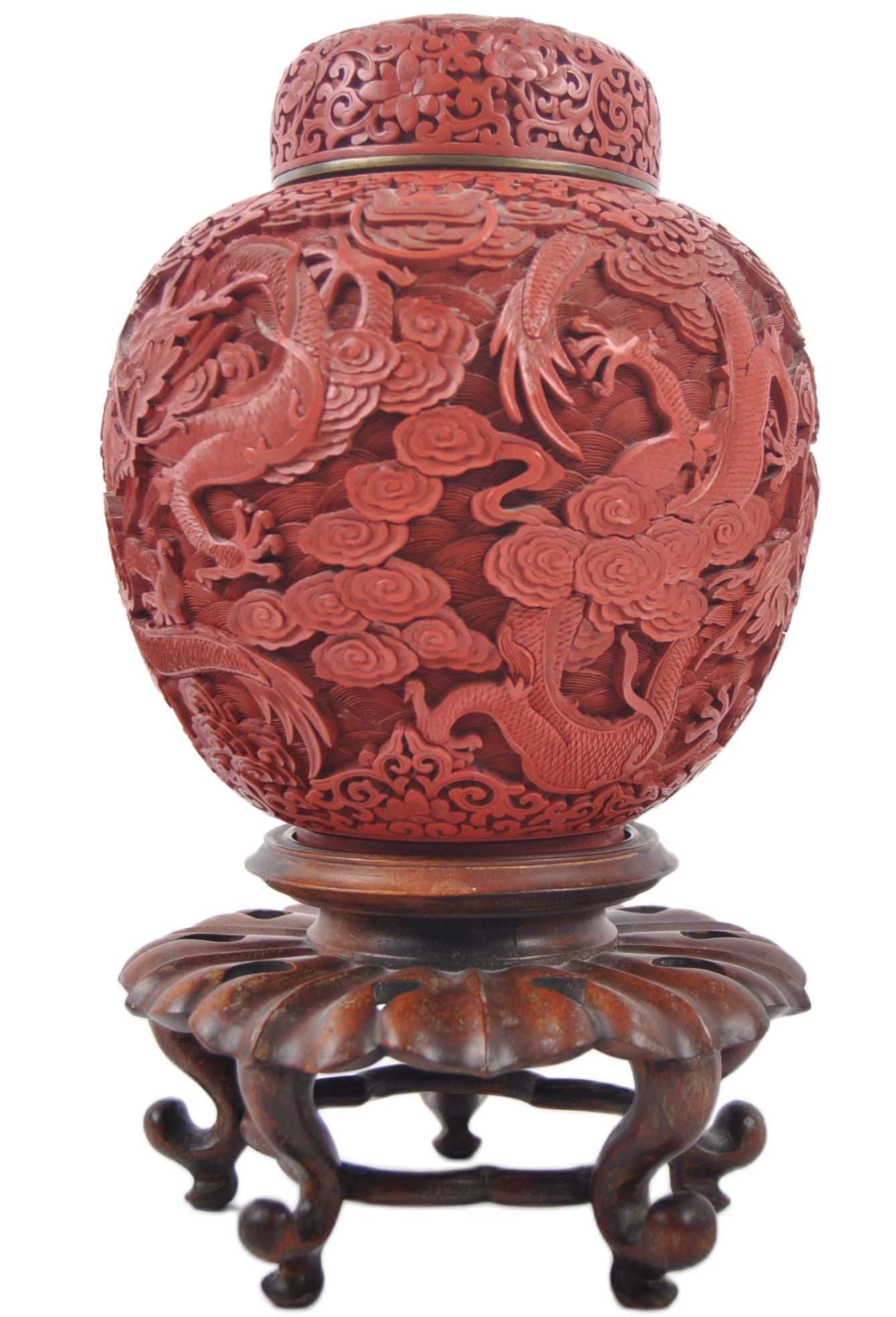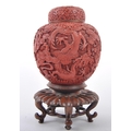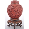 A large Chinese 19th Century Cinnabar red lacquer ginger jar & cover raised on good quality pierced stand. Carved with scenes of dragons and flowers with repeating scrolls. Teal blue ground interior. Measures approx; 31cm tall.