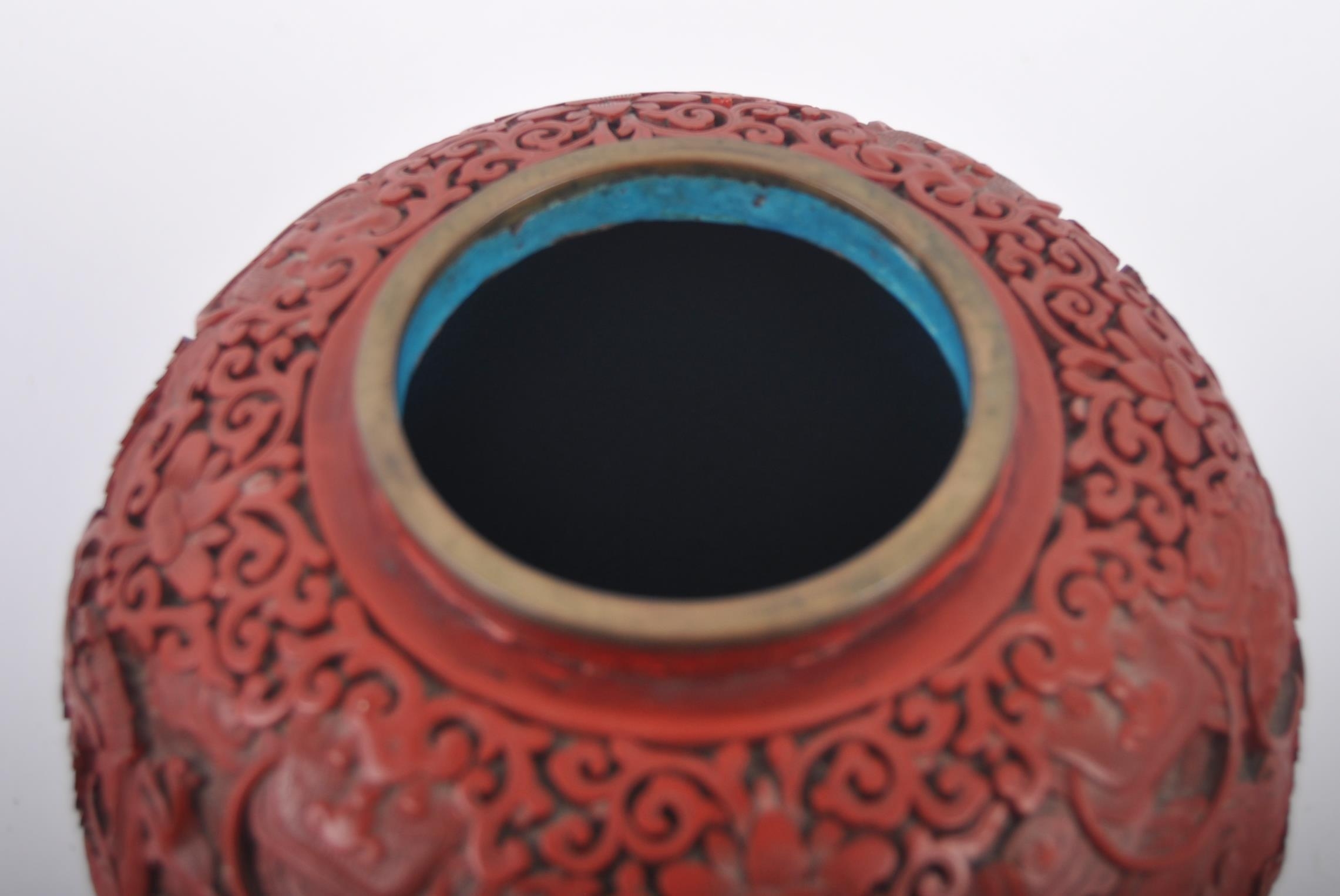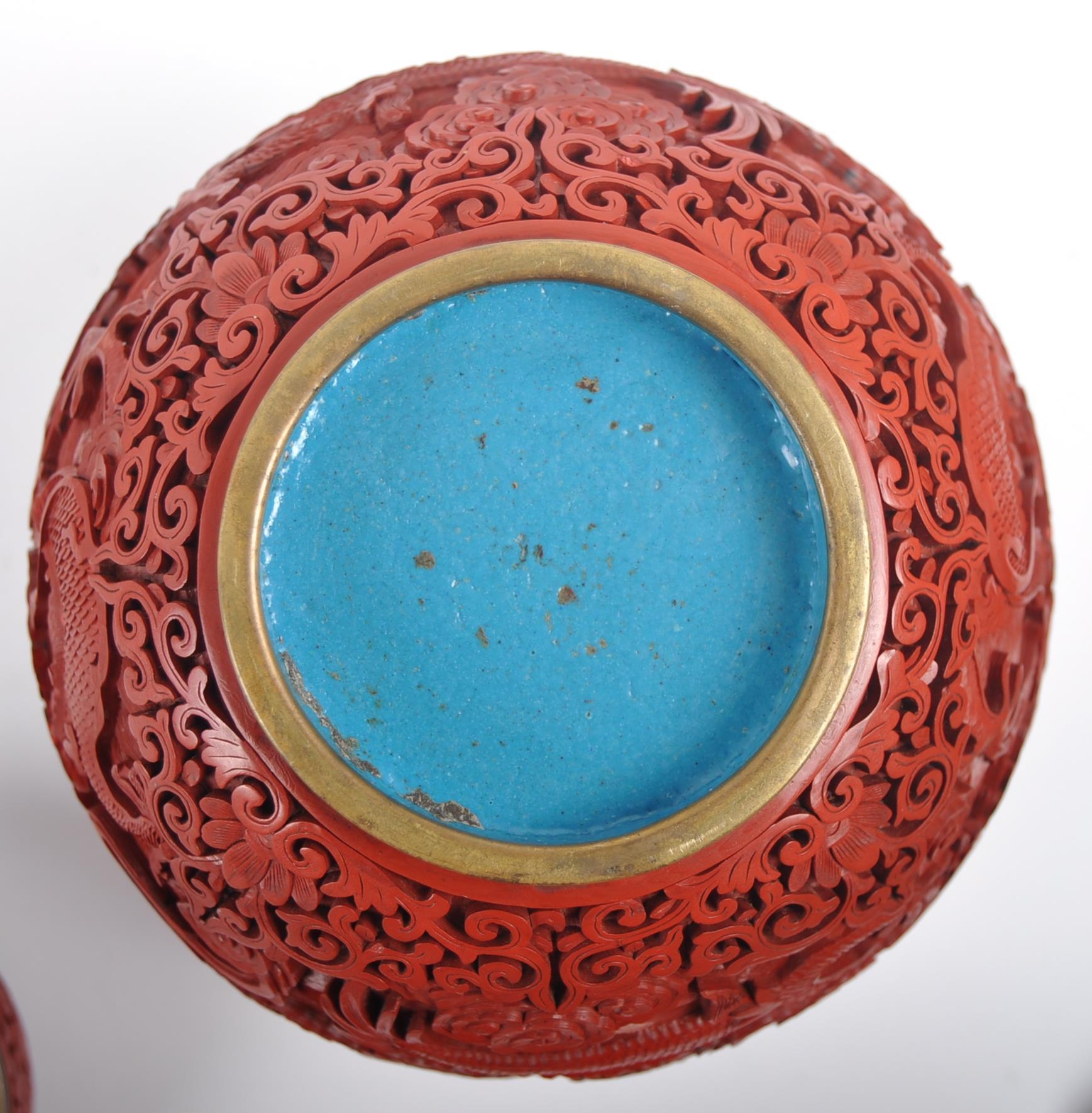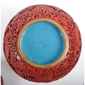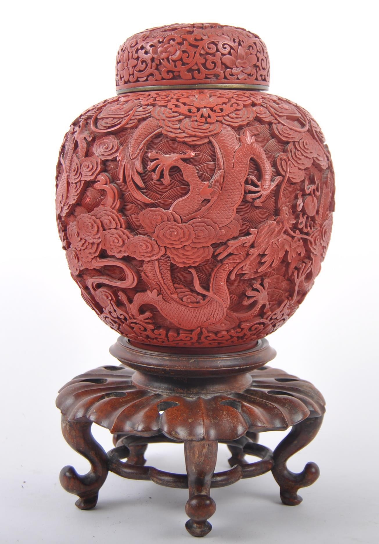 A large Chinese 19th Century Cinnabar red lacquer ginger jar & cover raised on good quality pierced stand. Carved with scenes of dragons and flowers with repeating scrolls. Teal blue ground interior. Measures approx; 31cm tall.