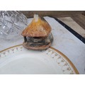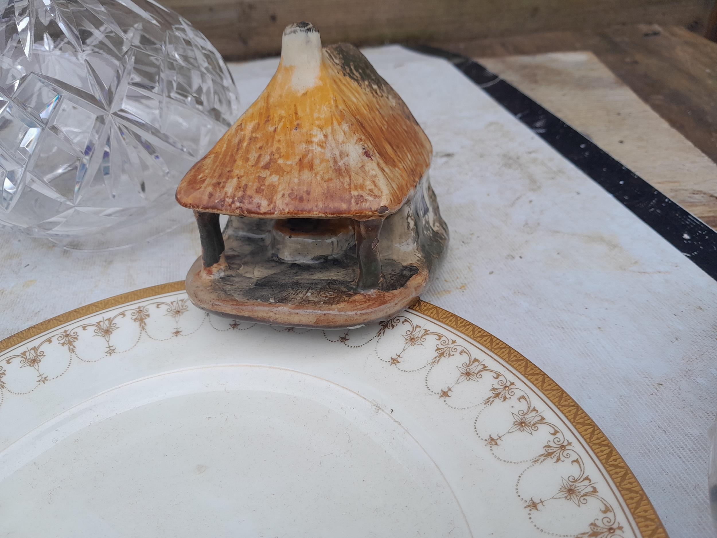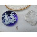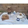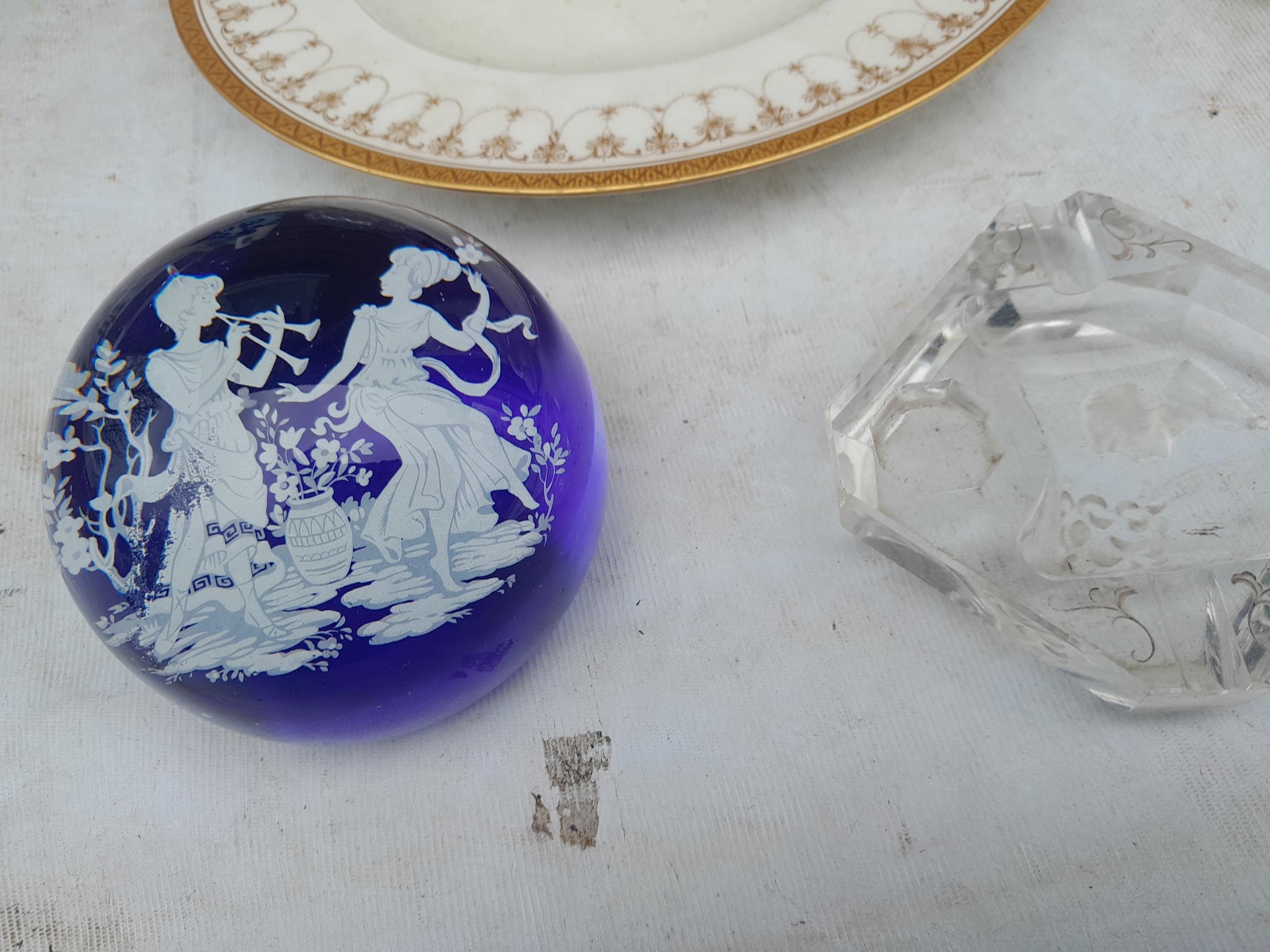 Box of oddments : glass paperweight, chipped Art Deco Baccarat style ashtray, Torquay money bank etc