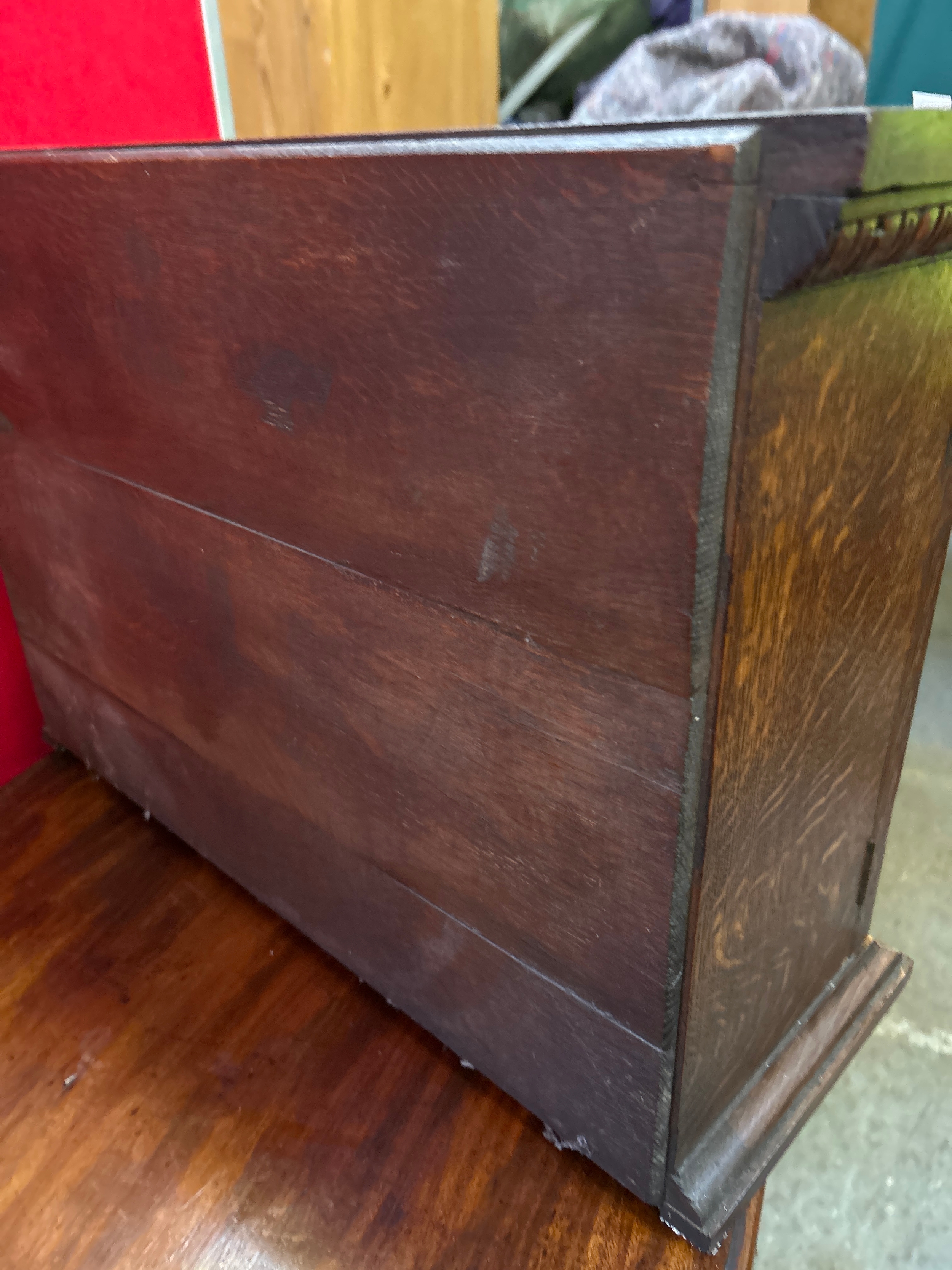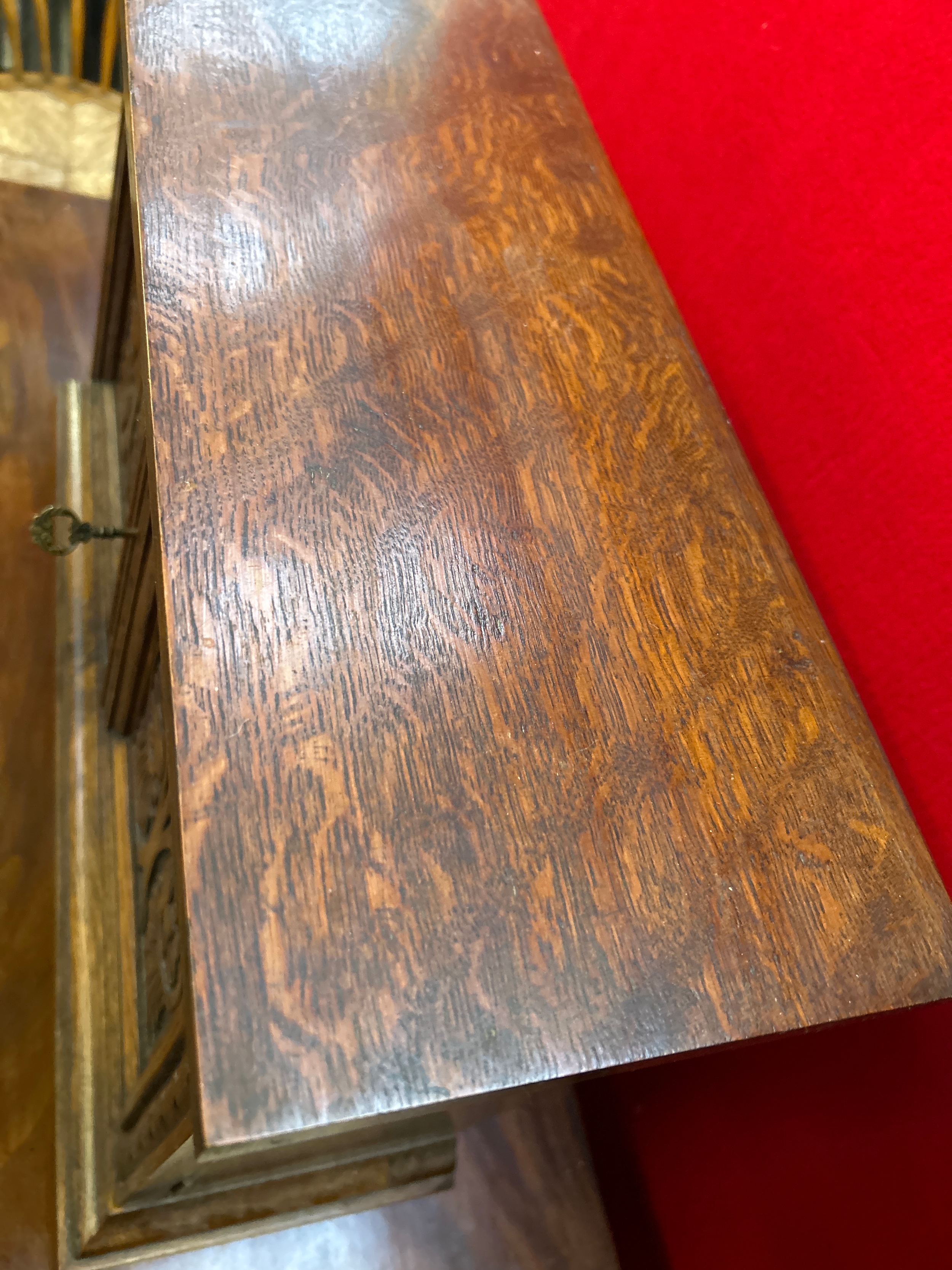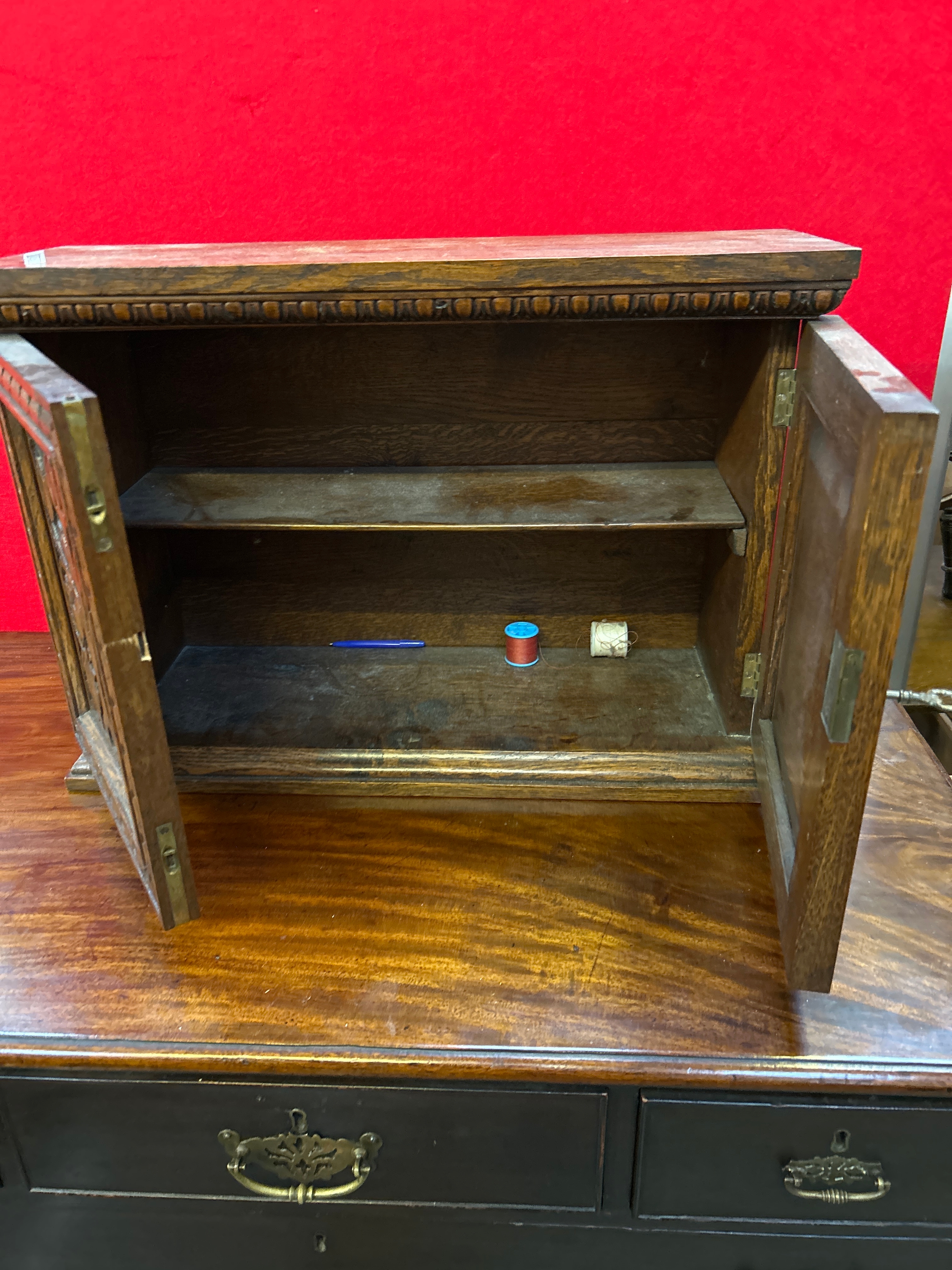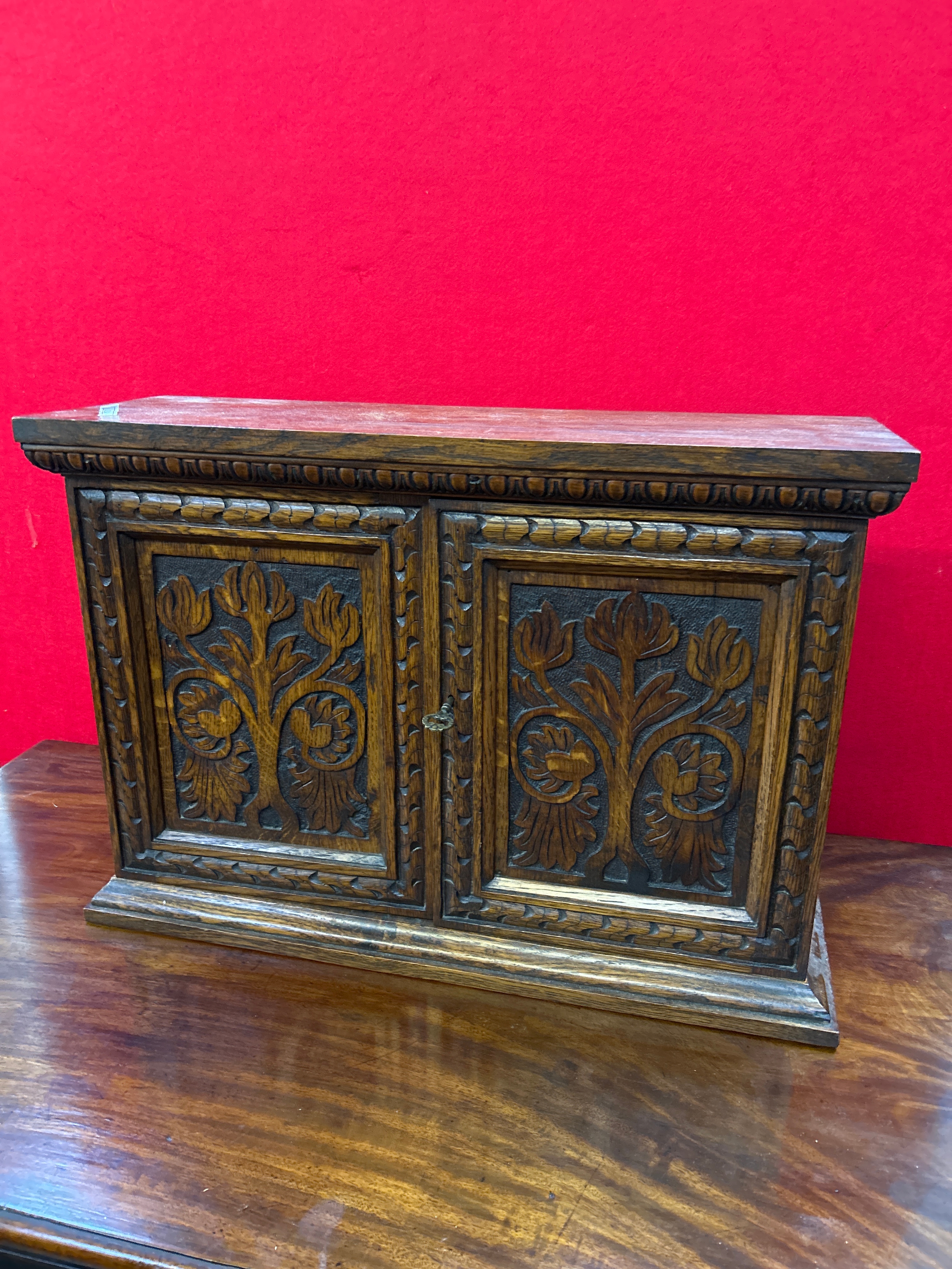 A late 19th small oak cupboard with carved door panels representing the tree of life. Internal shelf & working key.