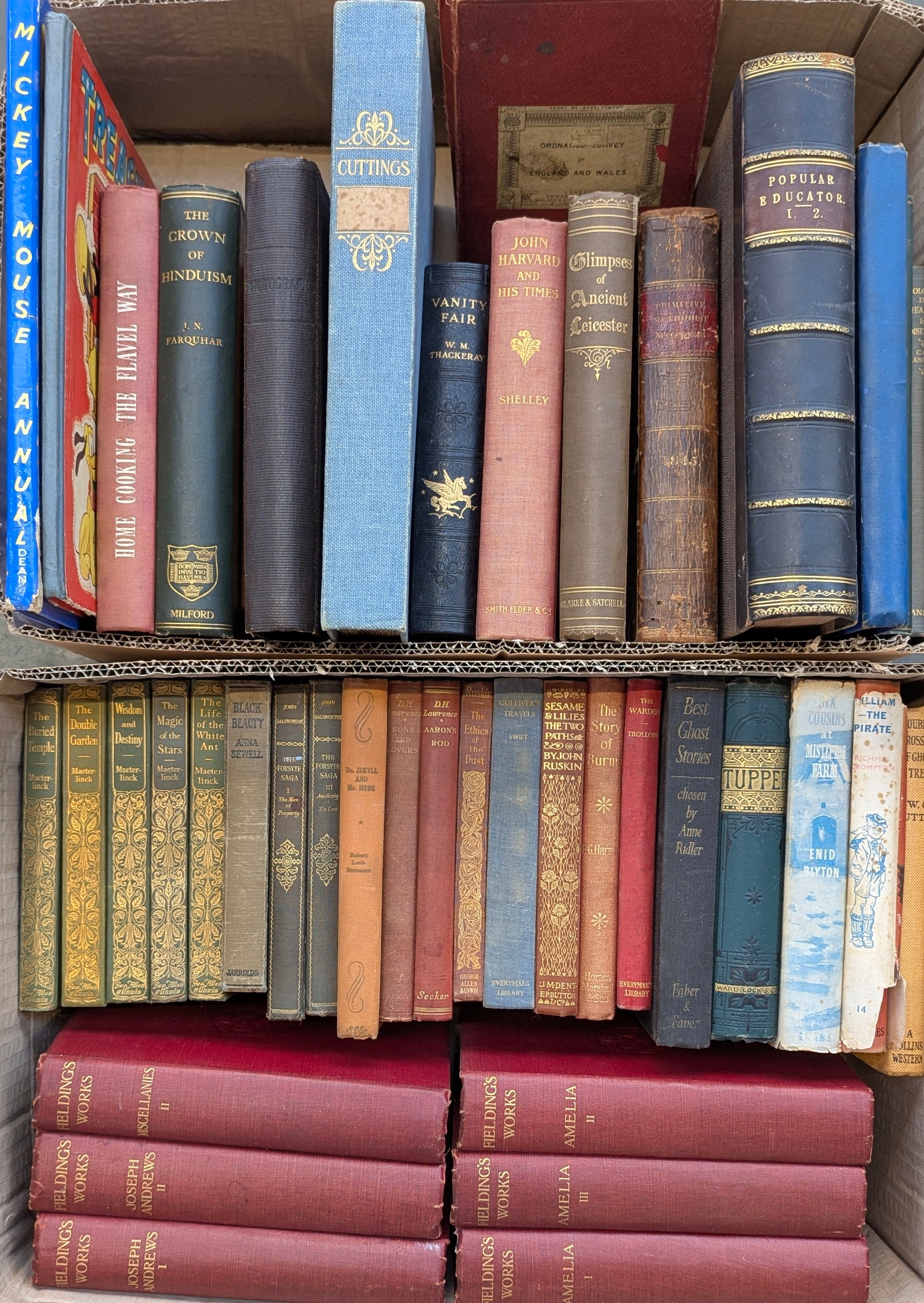 BOOKS, MISCELLANEOUS. Two boxes to include a group of 'pocket classics' and a larger group of Fielding, cookery, cuttings and vintage photograph album, children's books and others.