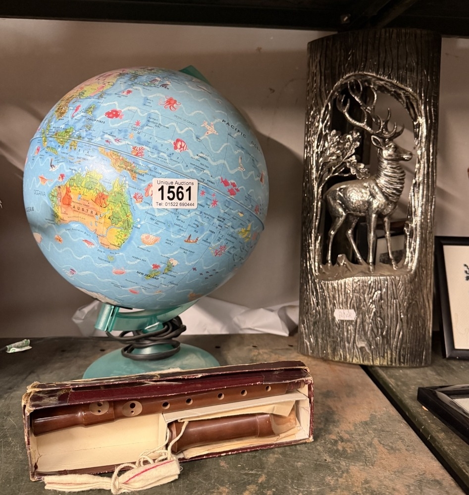 A lighting up globe & A boxed recorder & chrome stag