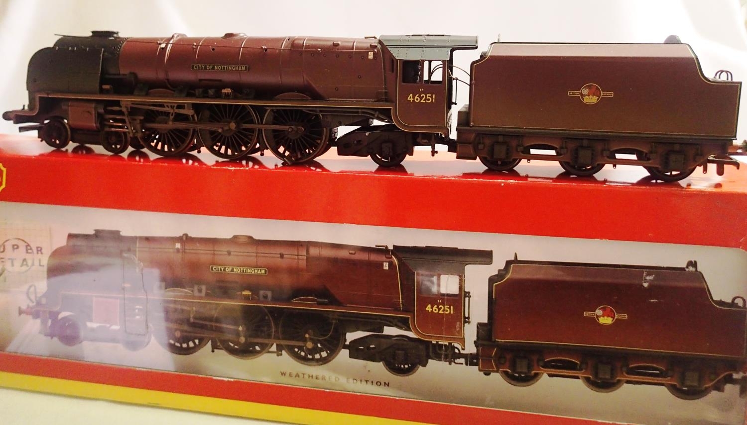 OO scale Hornby R2383 Duchess class, City Of Nottingham BR Maroon, 46251 weathered, in very good condition, no detail pack box is fair to good. P&P Group 1 (£14+VAT for the first lot and £1+VAT for subsequent lots)