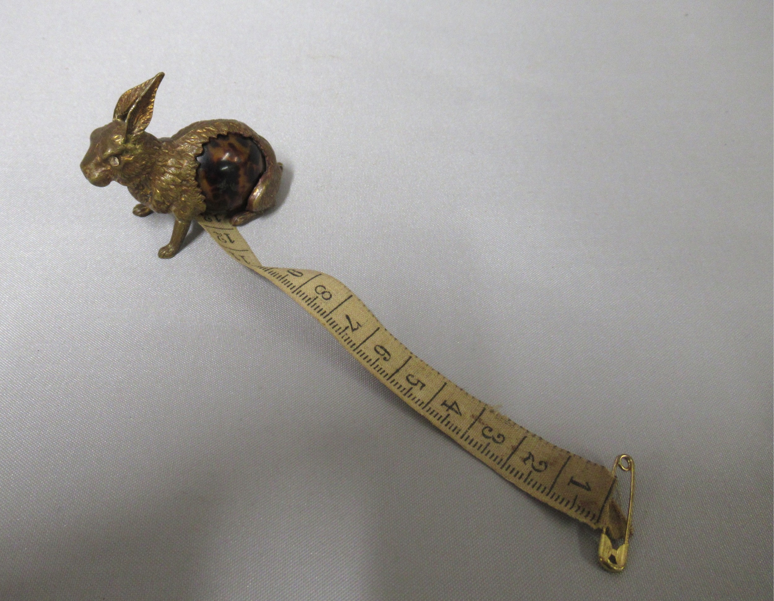 Brass and simulated tortoiseshell tape measure in the form of a rabbit