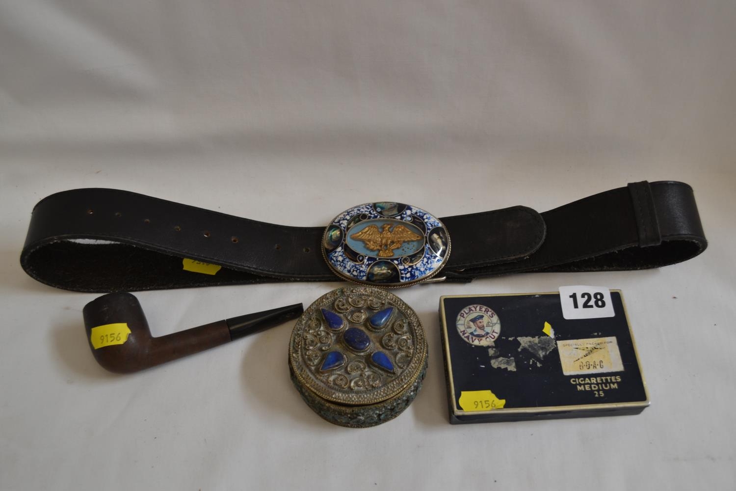 OLD PLAYERS NAVY CUT CIGARETTE TIN, INDIAN BRASS TRINKET BOX AND LEATHER BELT