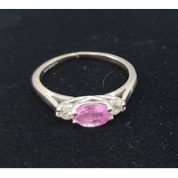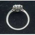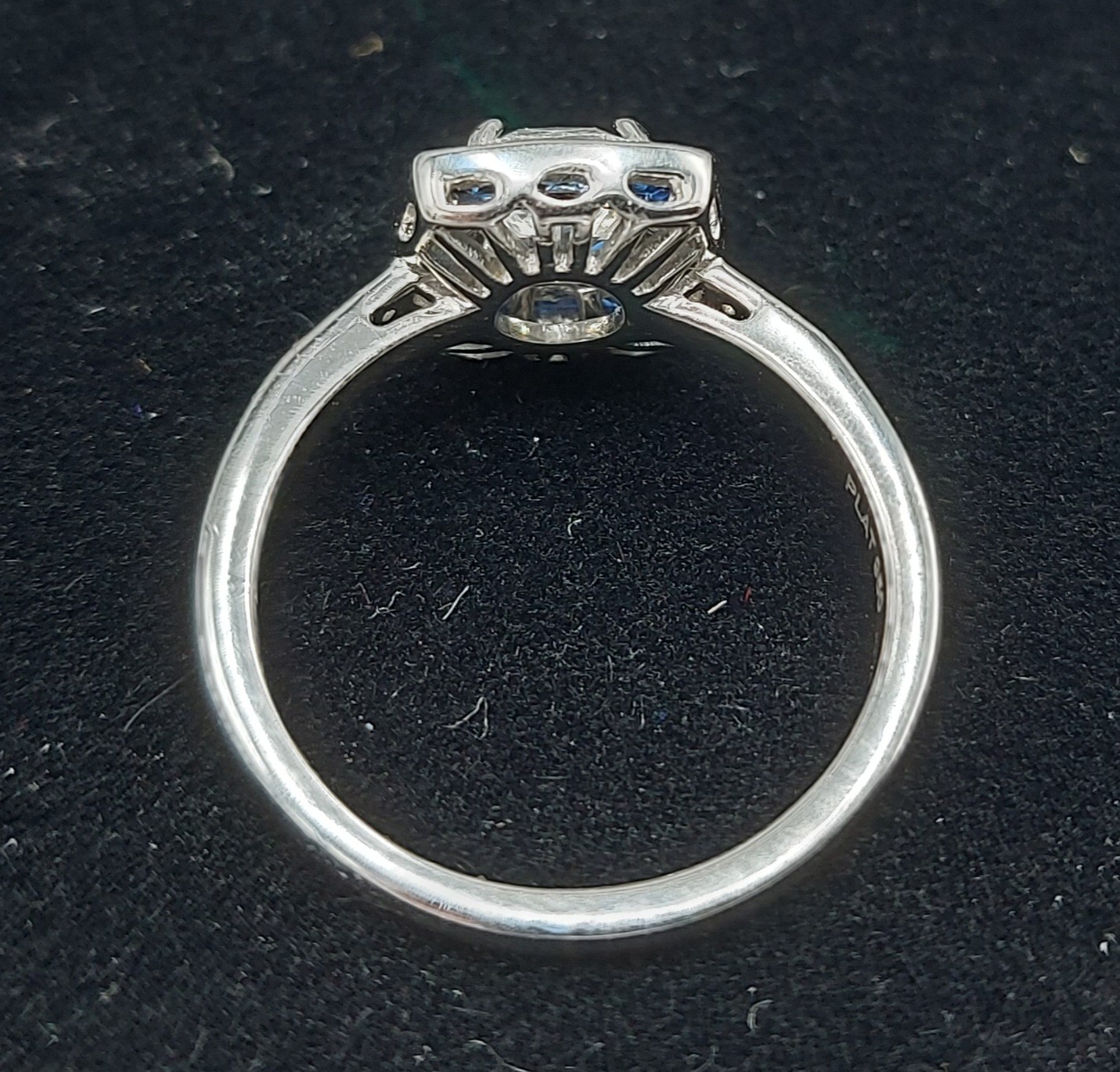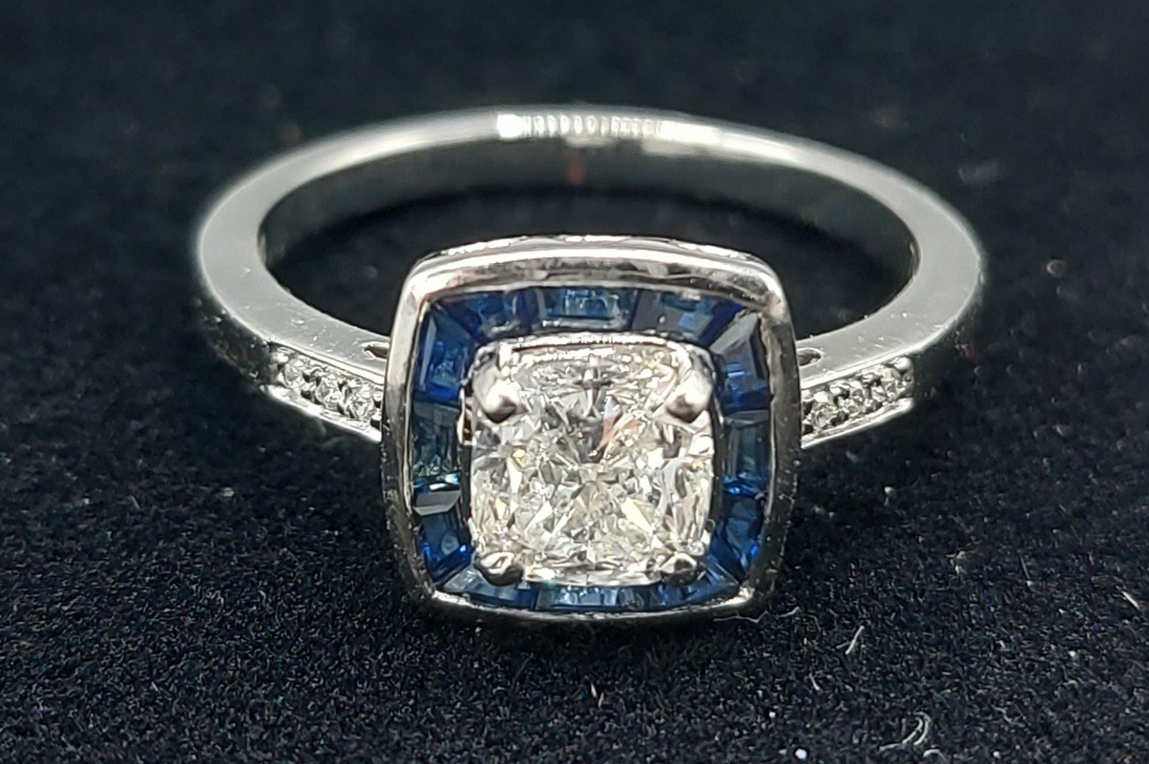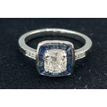 A Platinum Diamond and Sapphire ring set with a central cushion cut Diamond, 1.01ct surrounded by Sapphires with Diamond shoulders, 5gms, ring size L