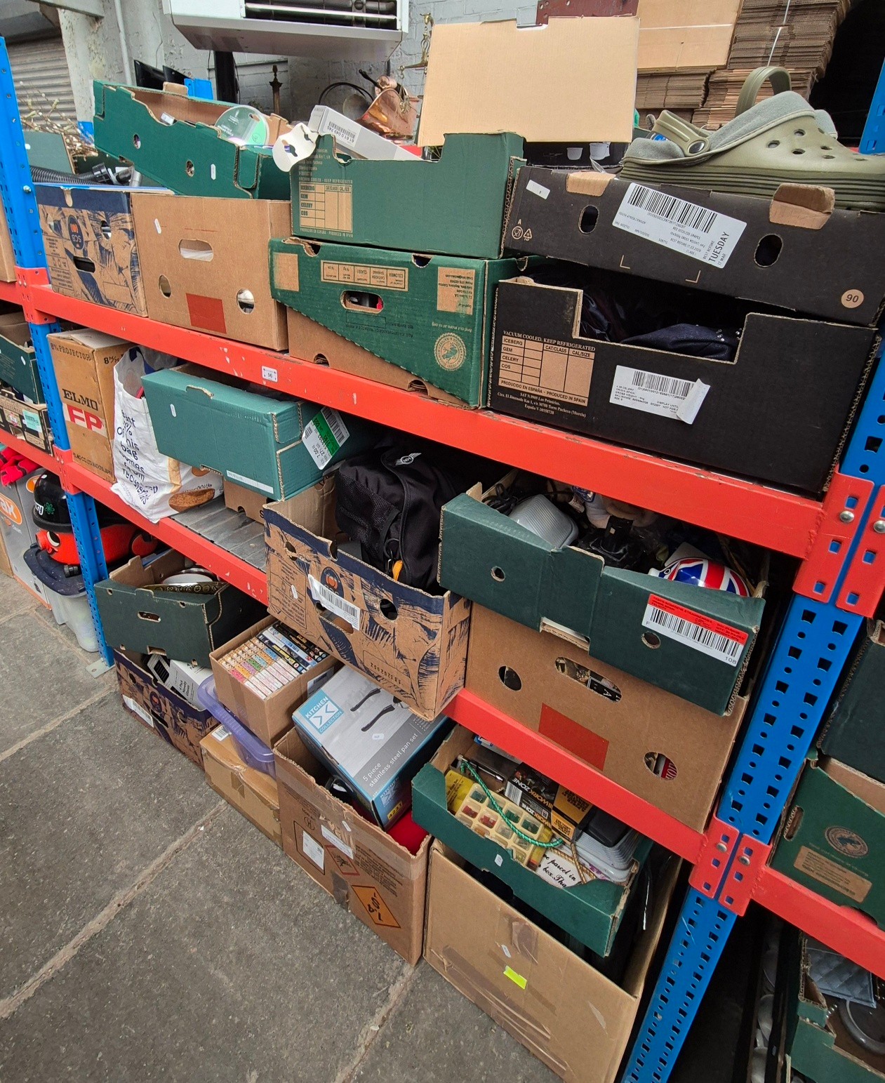 A mixed lot (21 boxes and a carrier bag) including Mini car valet kit, ceramics, 8mm film projector, cosmetics, kitchen mixers, steam cleaner, boxed set of pans, utensils, shoes, scarves/wraps, dvds including box sets, tools, soft toys, etc