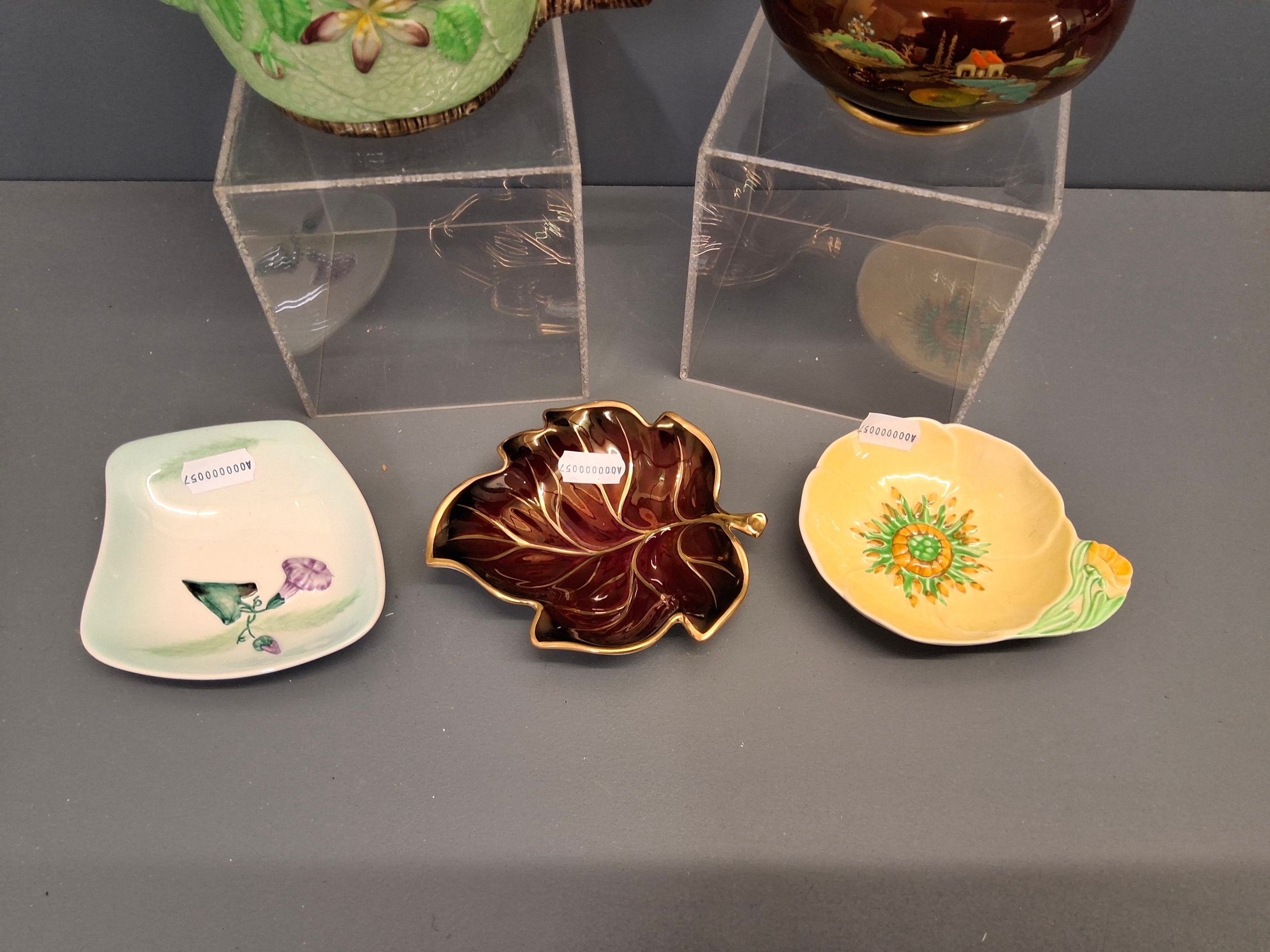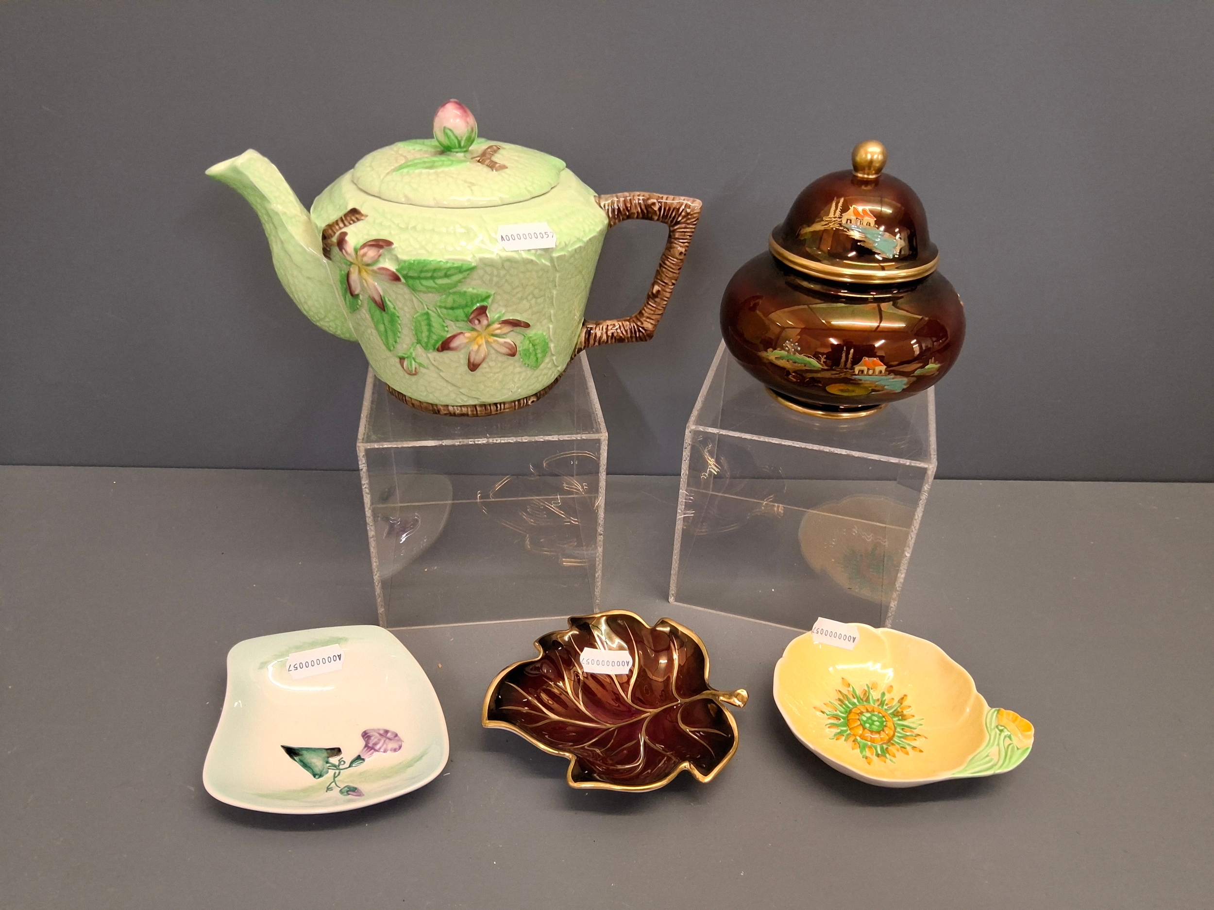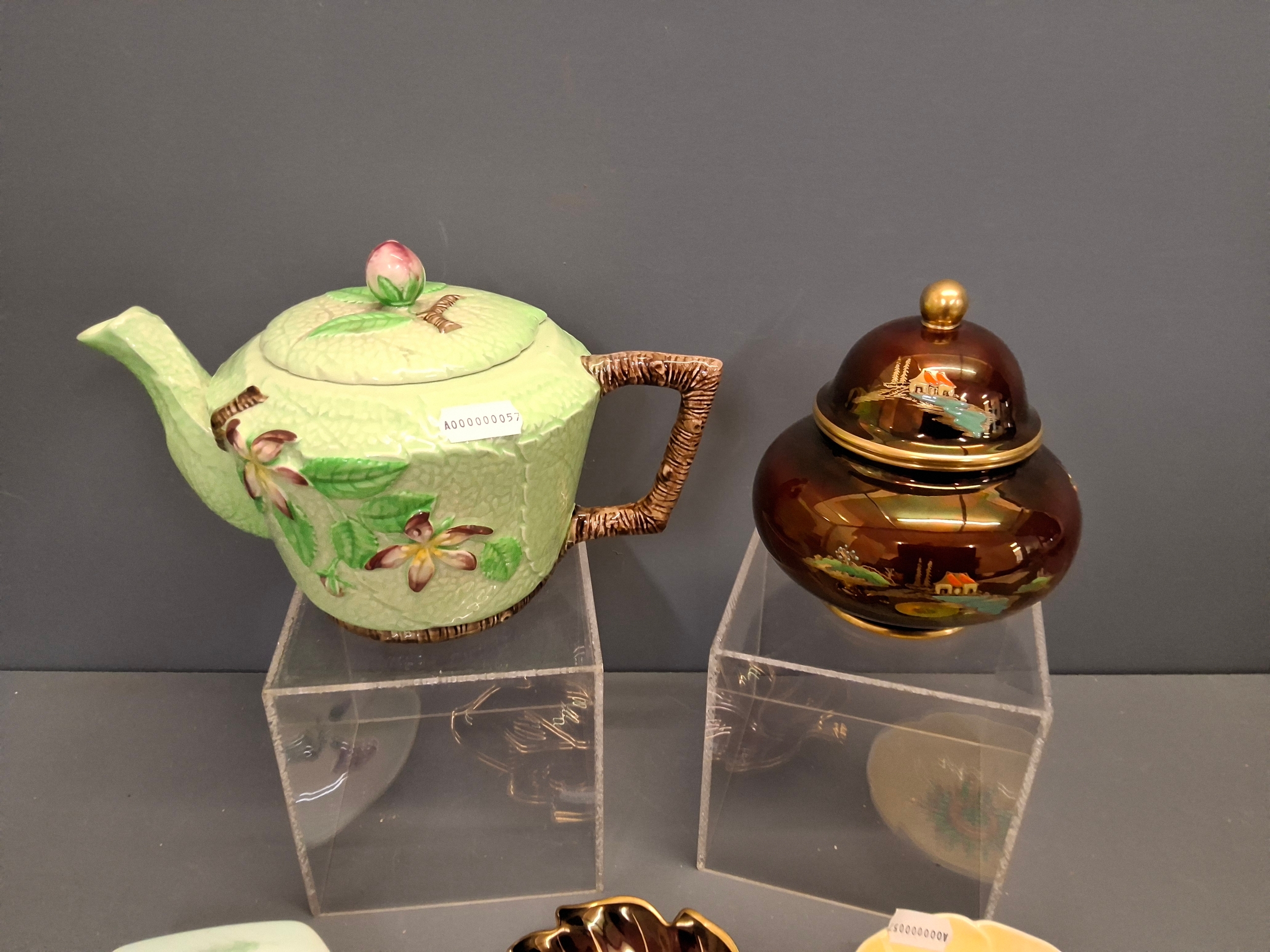 Carlton ware green apple blossom teapot, Rouge Royale Temple jar plus 3 other dishes.