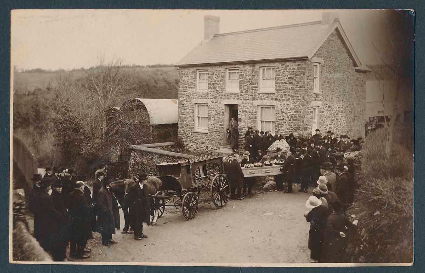 Wales. Misc. coln. filed in 19 flip top photo albums. Newquay coln. incl. better RP and ptd. street scenes, harbour views, events incl. reading the proclamation, Congregational Association at Newquay 1912, carnival, school children, football team, funeral (see photo), bowls match, golf match, lifeboat house and lifeboat, caravan parks etc. Aberayron coln. incl. good selection of RP and ptd. street scenes, G.W.R. buses outside the Feathers Hotel, churches, schools, harbour views, Carriage Bach, beach and general views etc. Llanarth, Ffosyffin, RP and ptd. street scenes. Aeron valley with RPs of Tangarreg Council school, opening of new church at Penuwch, Llangeitho, events, gatherings, general views etc. Few photos noted. Qty. approx. 1600 (B)