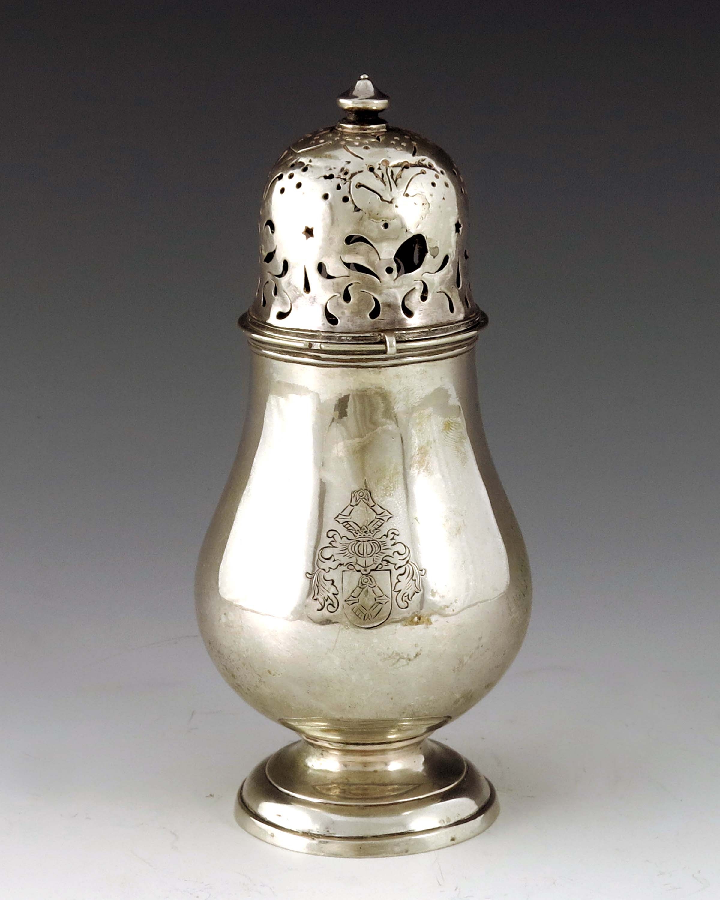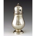 A German silver shaker, Brassler, circa 1810, footed baluster form with pierced lid, 18cm high, 5.42ozt