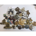 A collection of military badges mainly British and including a CCCP Russian badges a red enamel star. Silver and enamel 1937 Coronation badge.