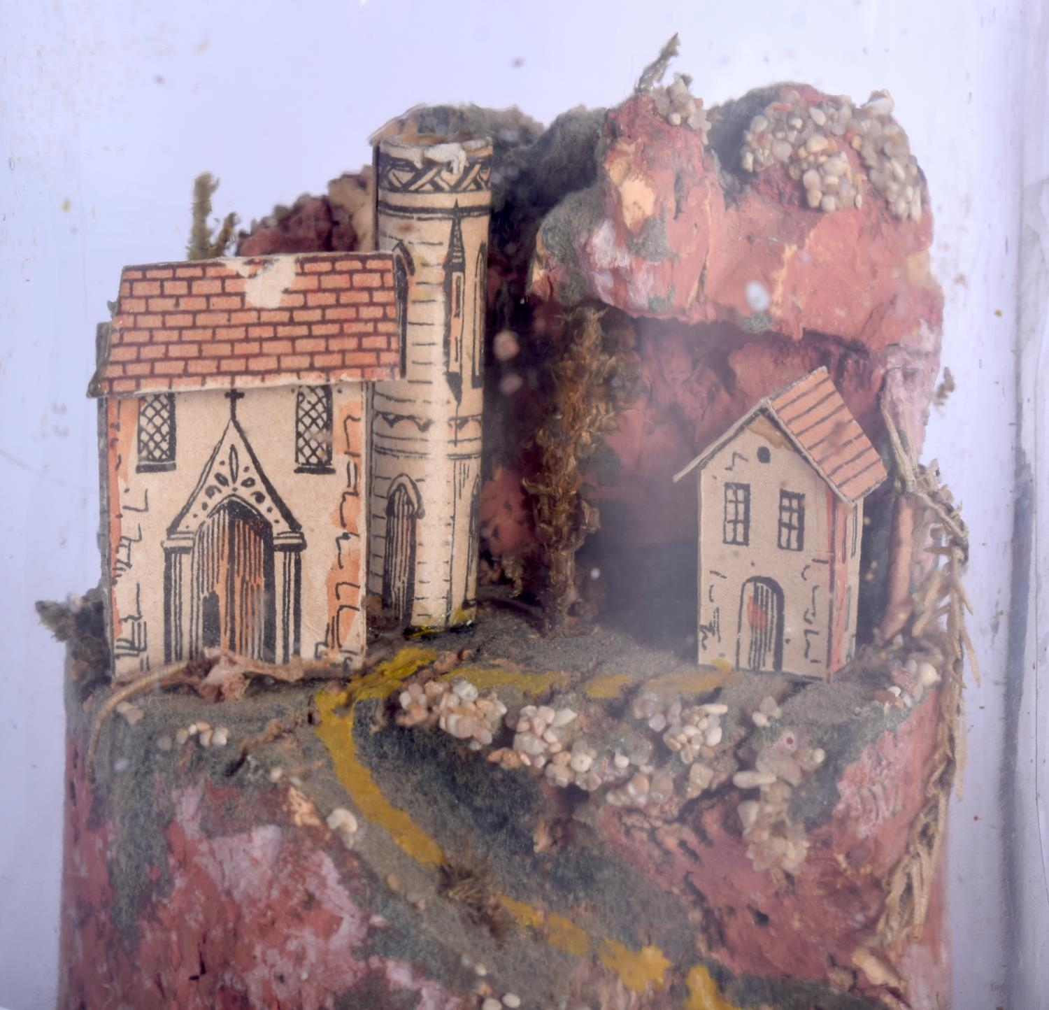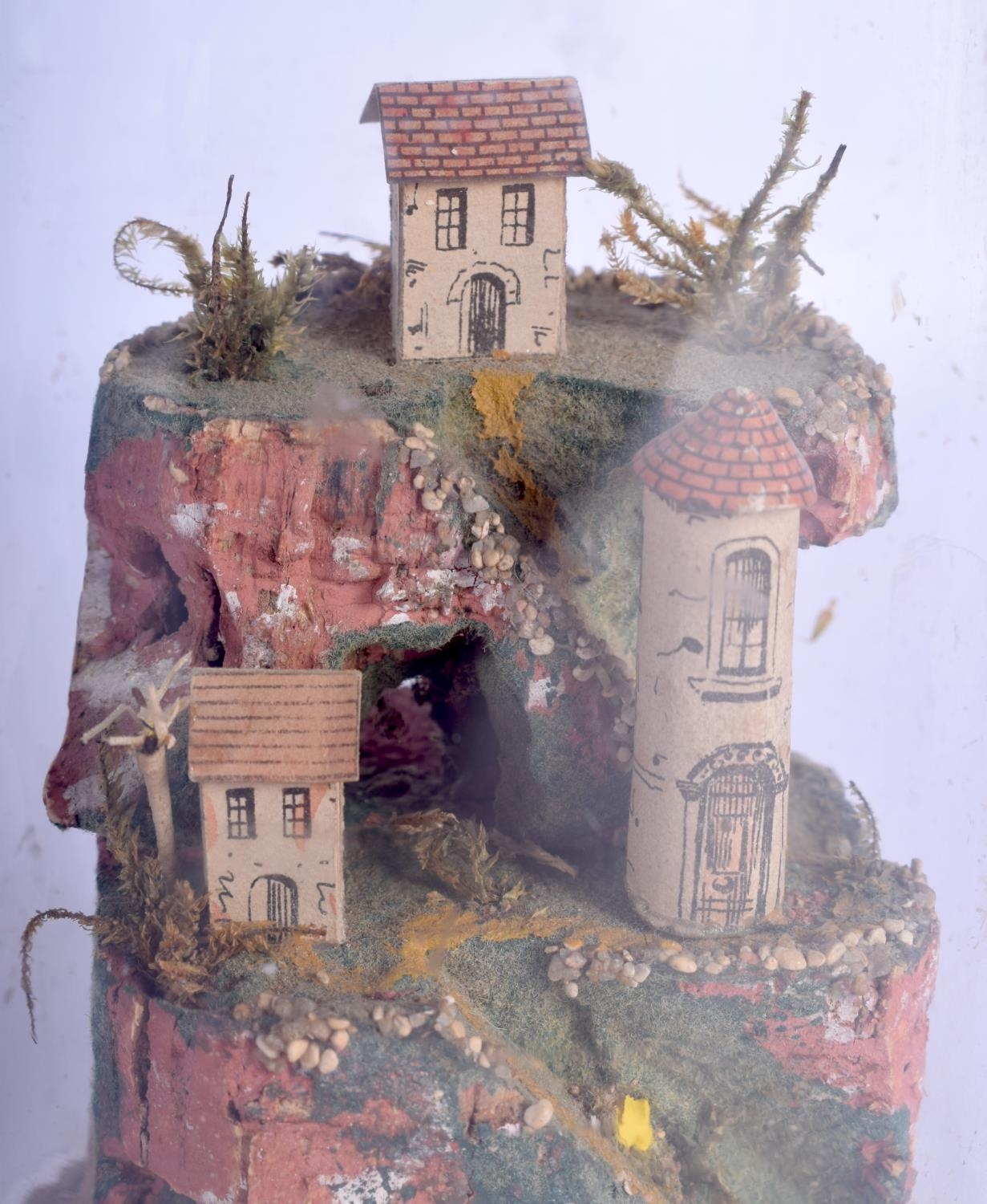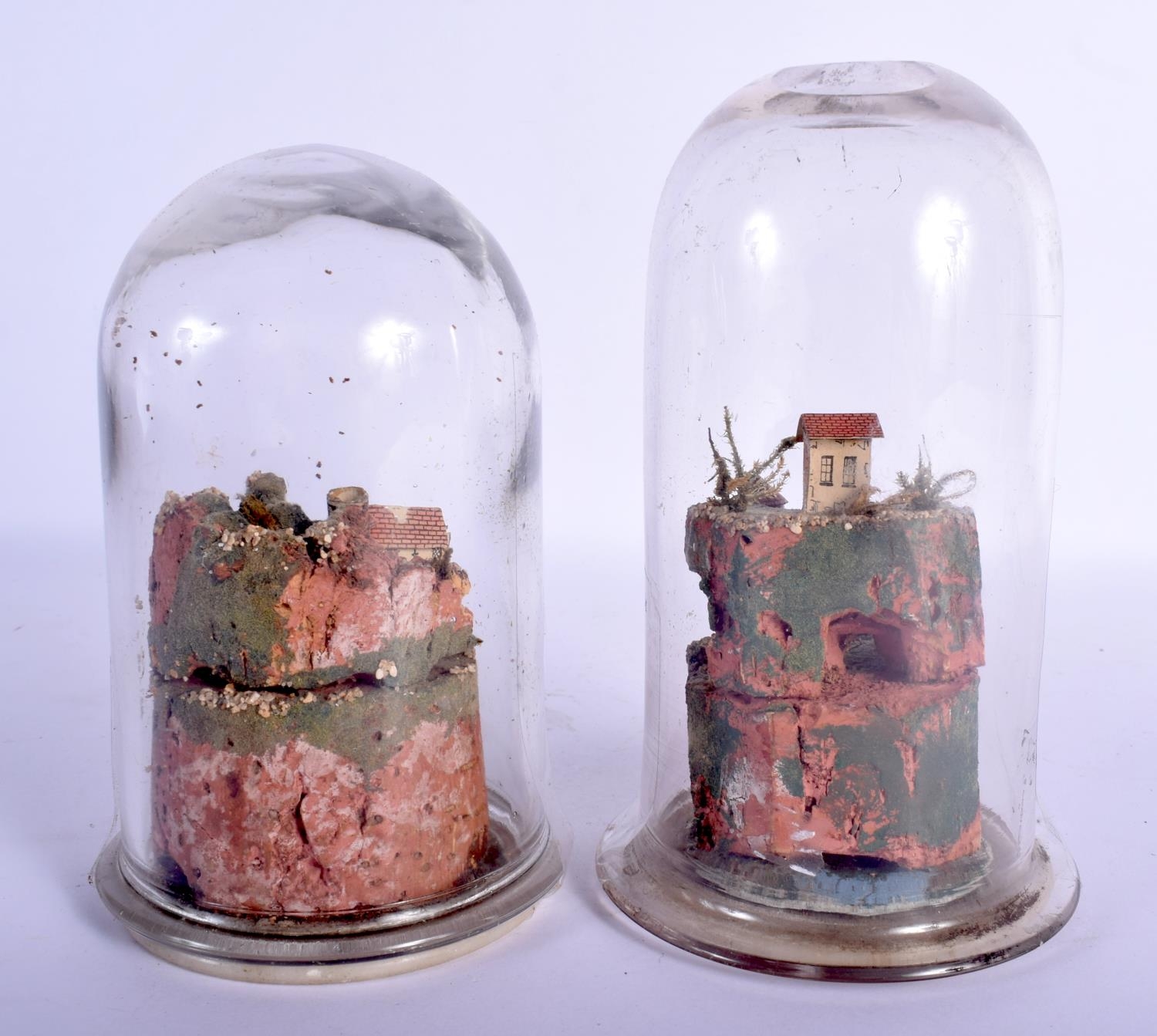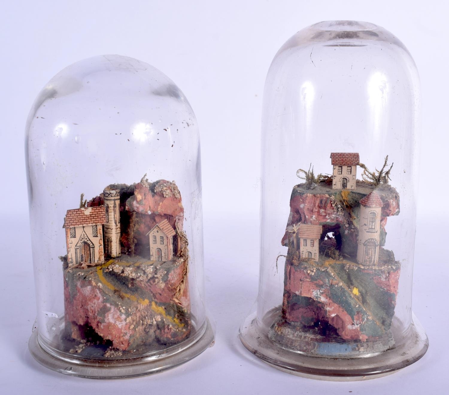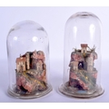 A RARE PAIR OF 19TH CENTURY ROLLED PAPER DIARAMA LANDSCAPES contained within glass domes. Largest 18 cm high.