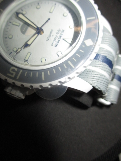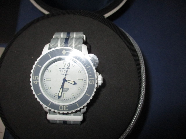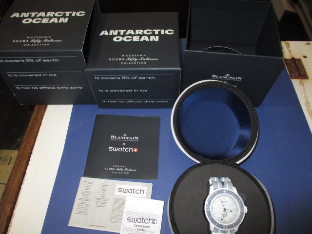 A Blancpain X Swatch scuba watch, Antarctic ocean fifty fathoms in box with paperwork, automatic in working order, looks to be unused