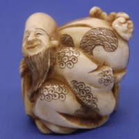 Ivory carved netsuke in the form of a figure reclining with a floral background, L: 55 mm, unsigned. Fine crack to top of head, otherwise good condition. P&P Group 1 (£14+VAT for the first lot and £1+VAT for subsequent lots)