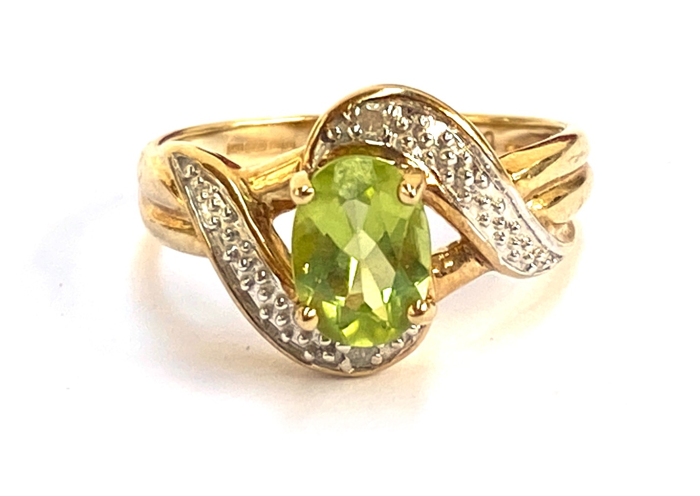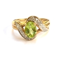A 9ct gold, peridot and diamond ring, size J, 2.2g