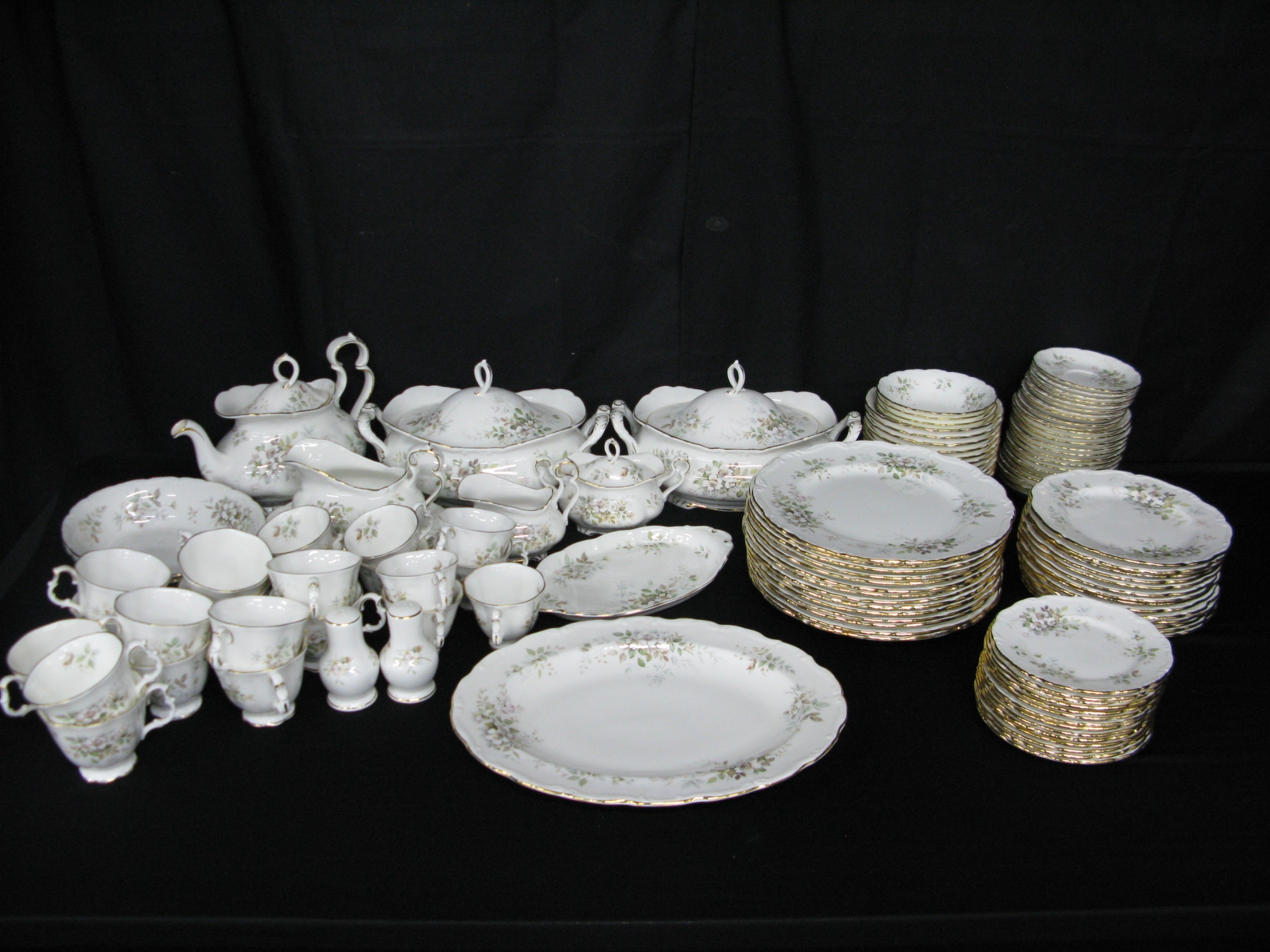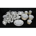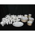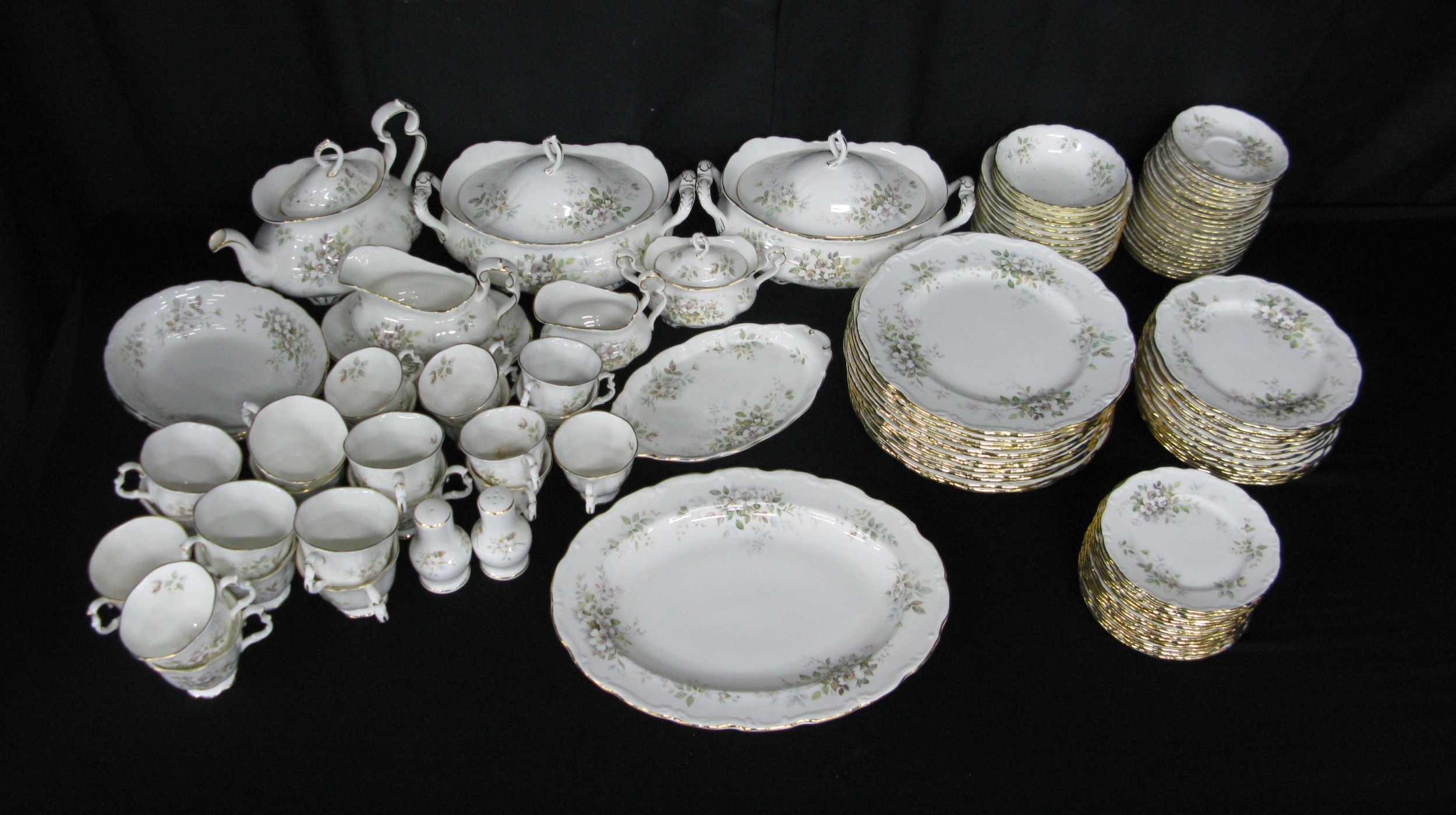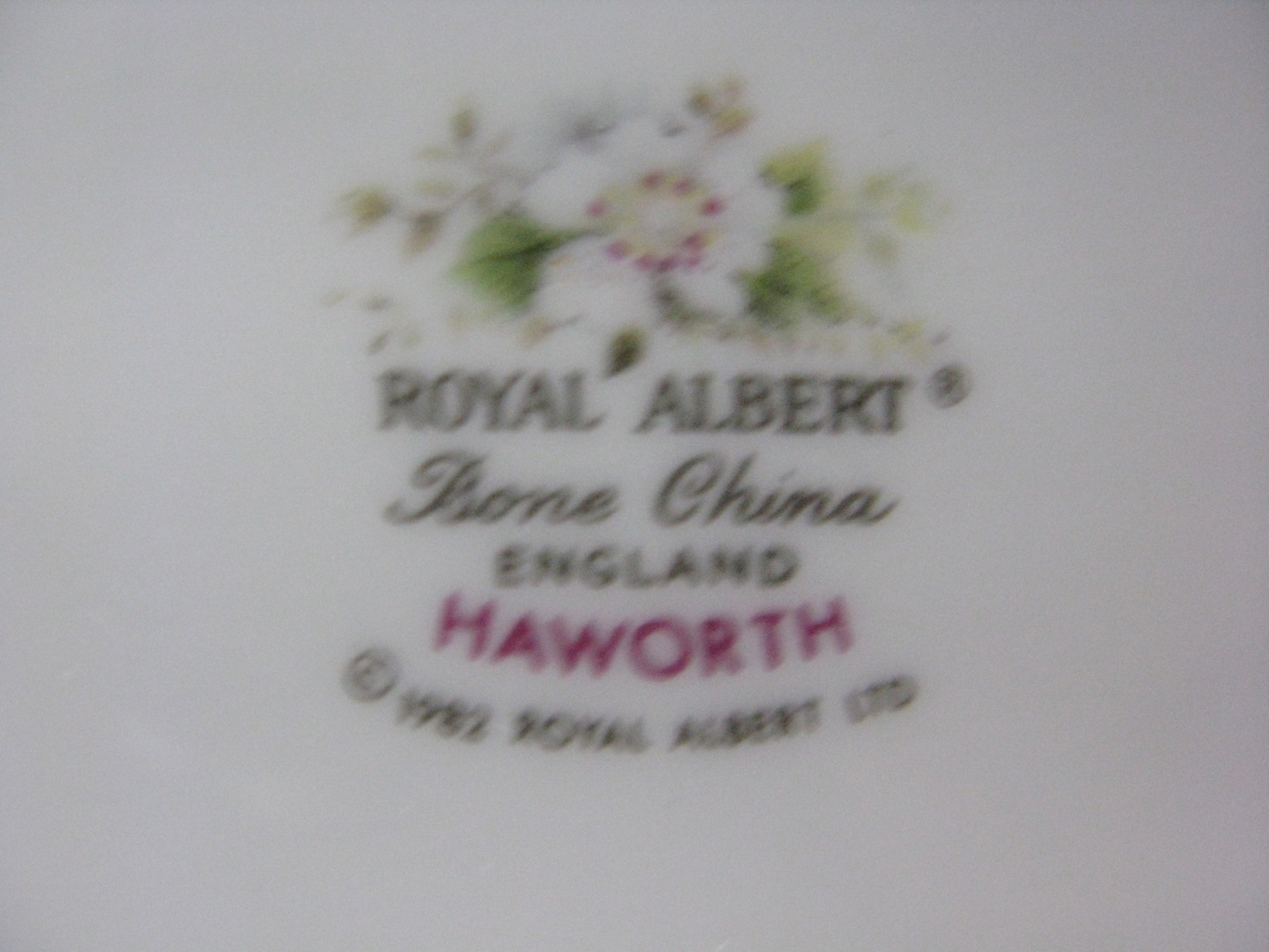 Royal Albert Haworth part tea and dinner ware to comprise: thirteen tea cups, nine coffee cups, ten 12.5cm saucers, fourteen 14cm saucers, milk jug, lidded sugar bowl, fourteen 16cm side plates, fourteen 20.5cm plates, four 14cm bowls, ten 16cm bowls, teapot, fourteen 26.5cm plates, two lidded tureens, two 23cm serving bowls, salt & pepper pot, 34.5cm serving plate, 25.5cm serving dish, gravy boat & stand