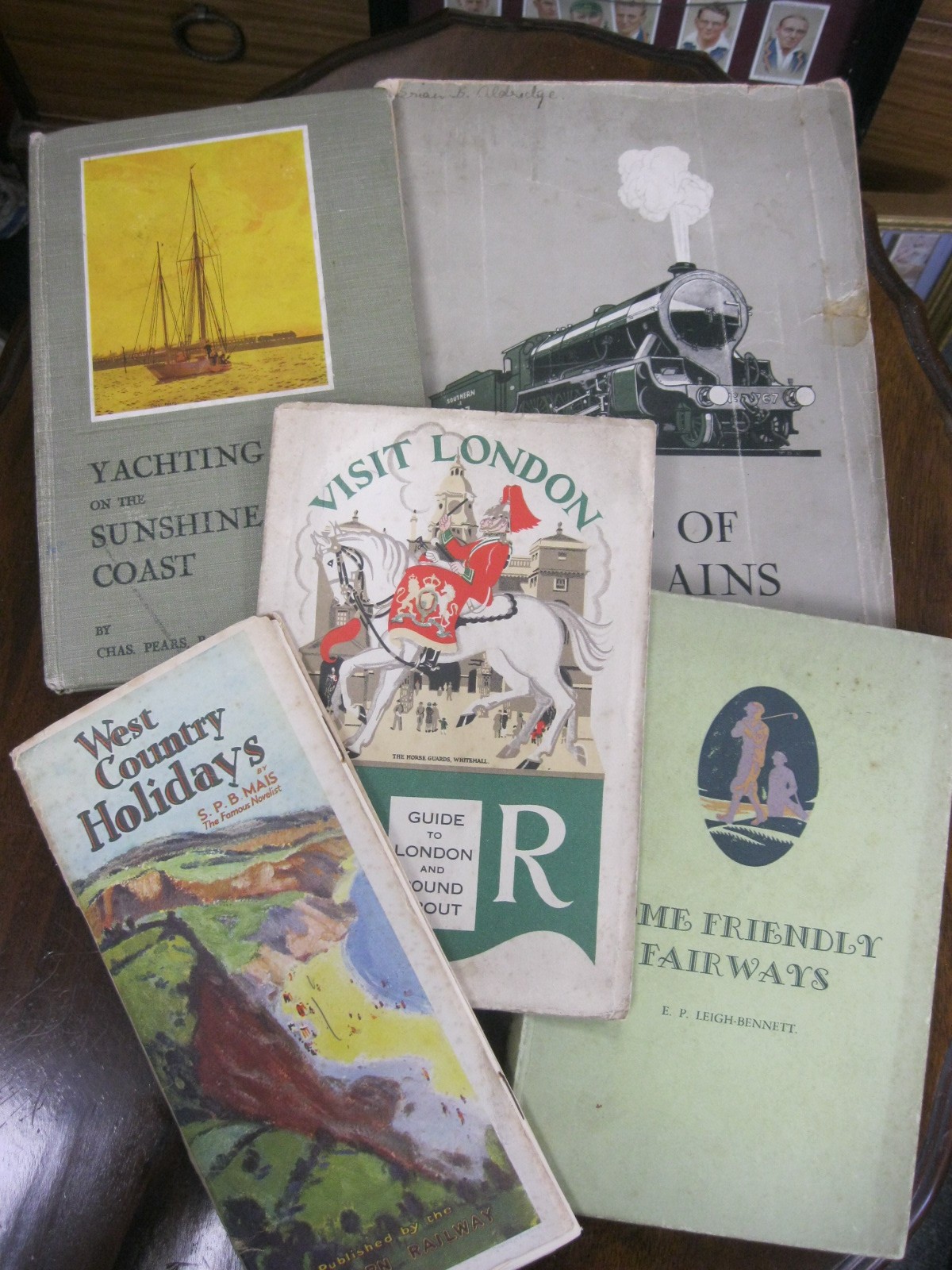 A small assortment of books and pamphlets published by Southern Railway comprising West Country Holidays by SPB Main, A Guide to London & Round About, Some Friendly Fairways by EP Leigh-Bennett (hardback), Yachting on the Sunshine Coast by Chas. Pears ROI (hardback) and Tales of the Trains by EP Leigh-Bennett