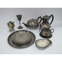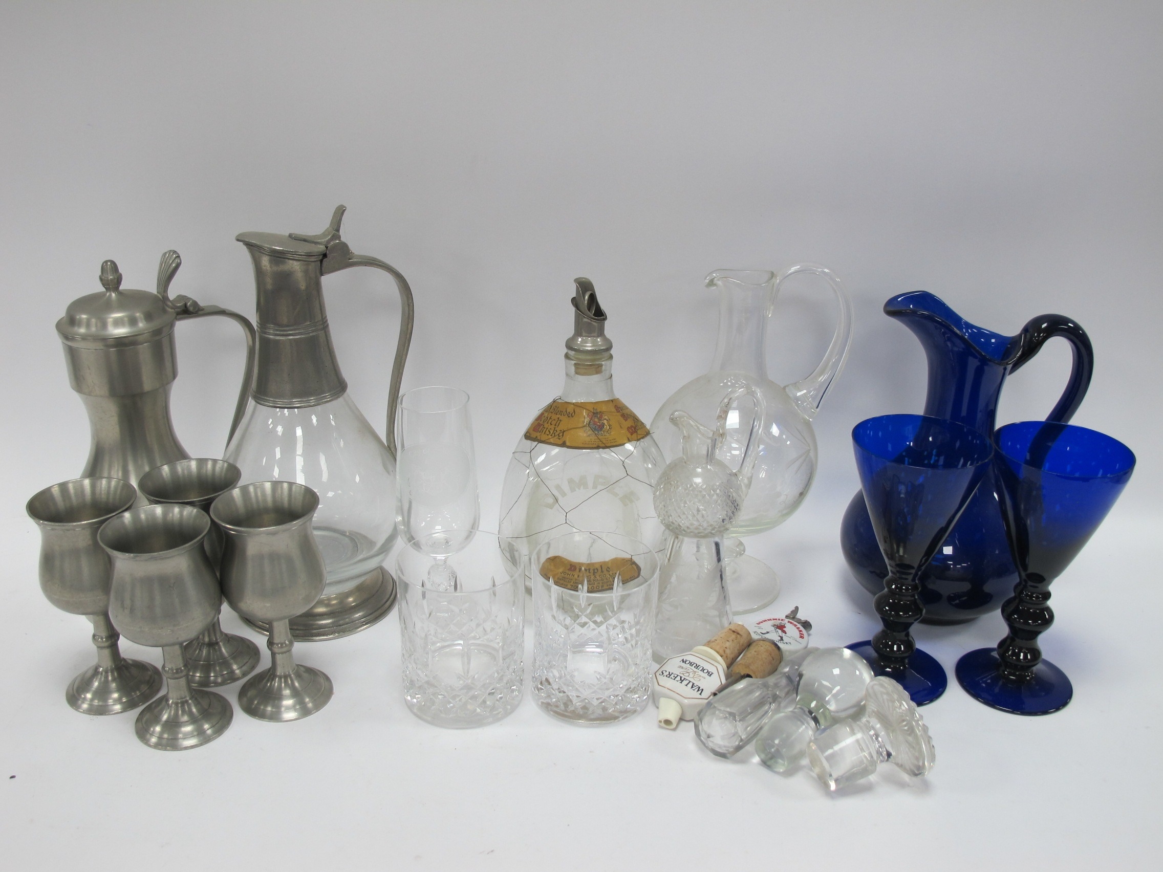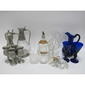 Blue Glass Jug and Two Goblets - decanters, pewter jug and goblets, etc:- One Tray.