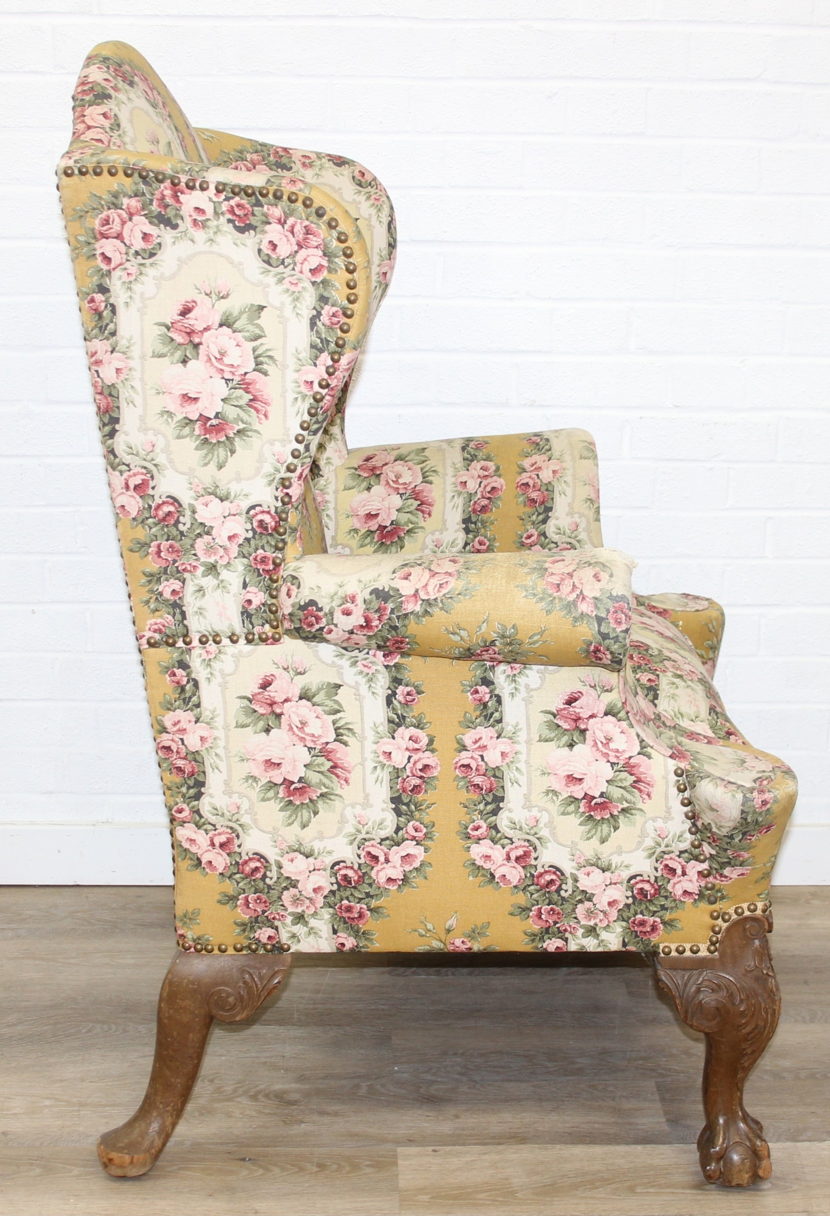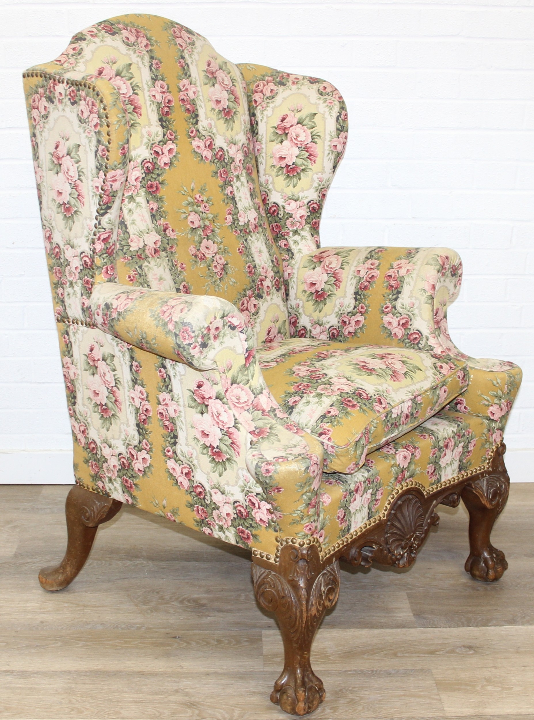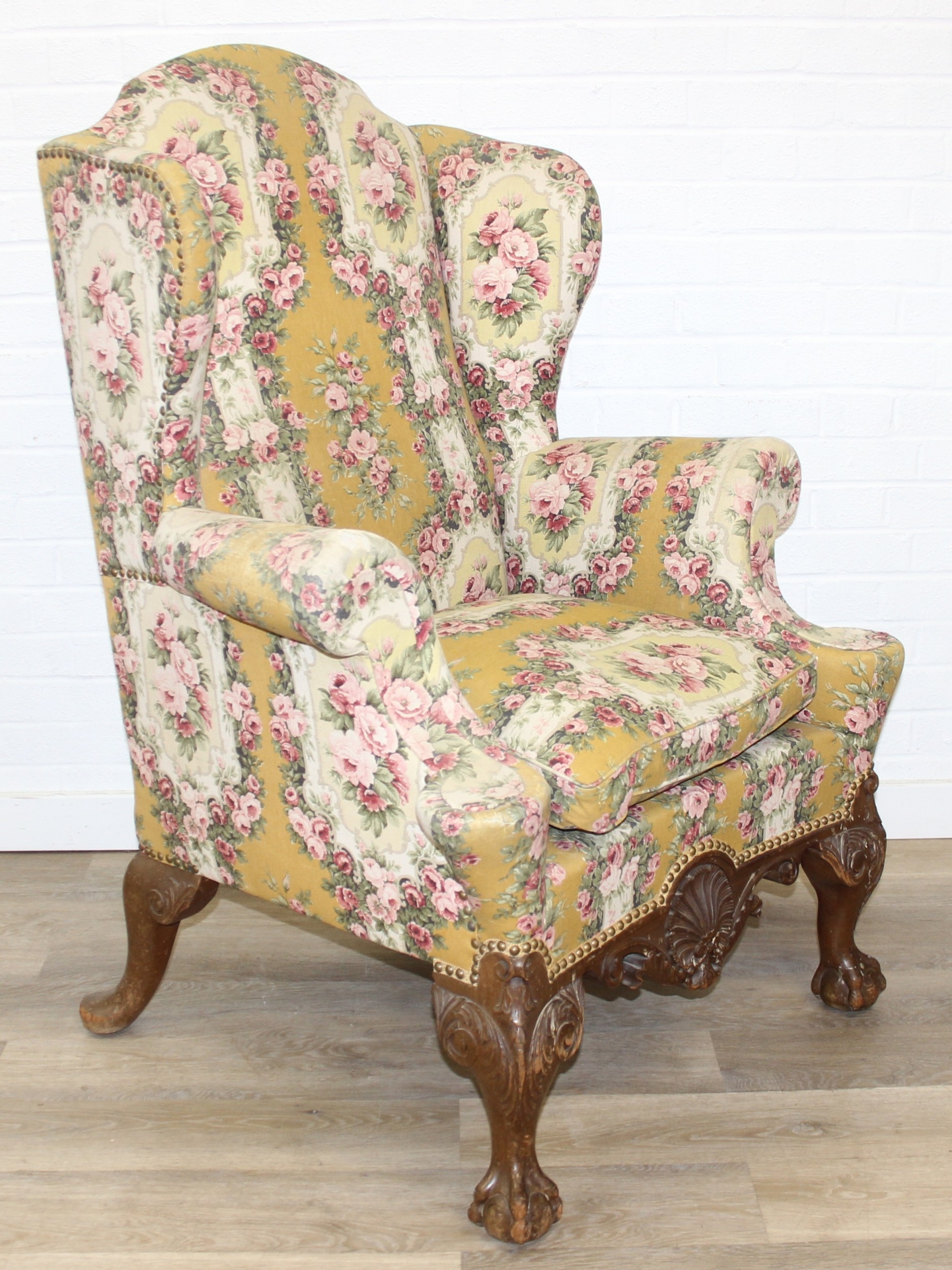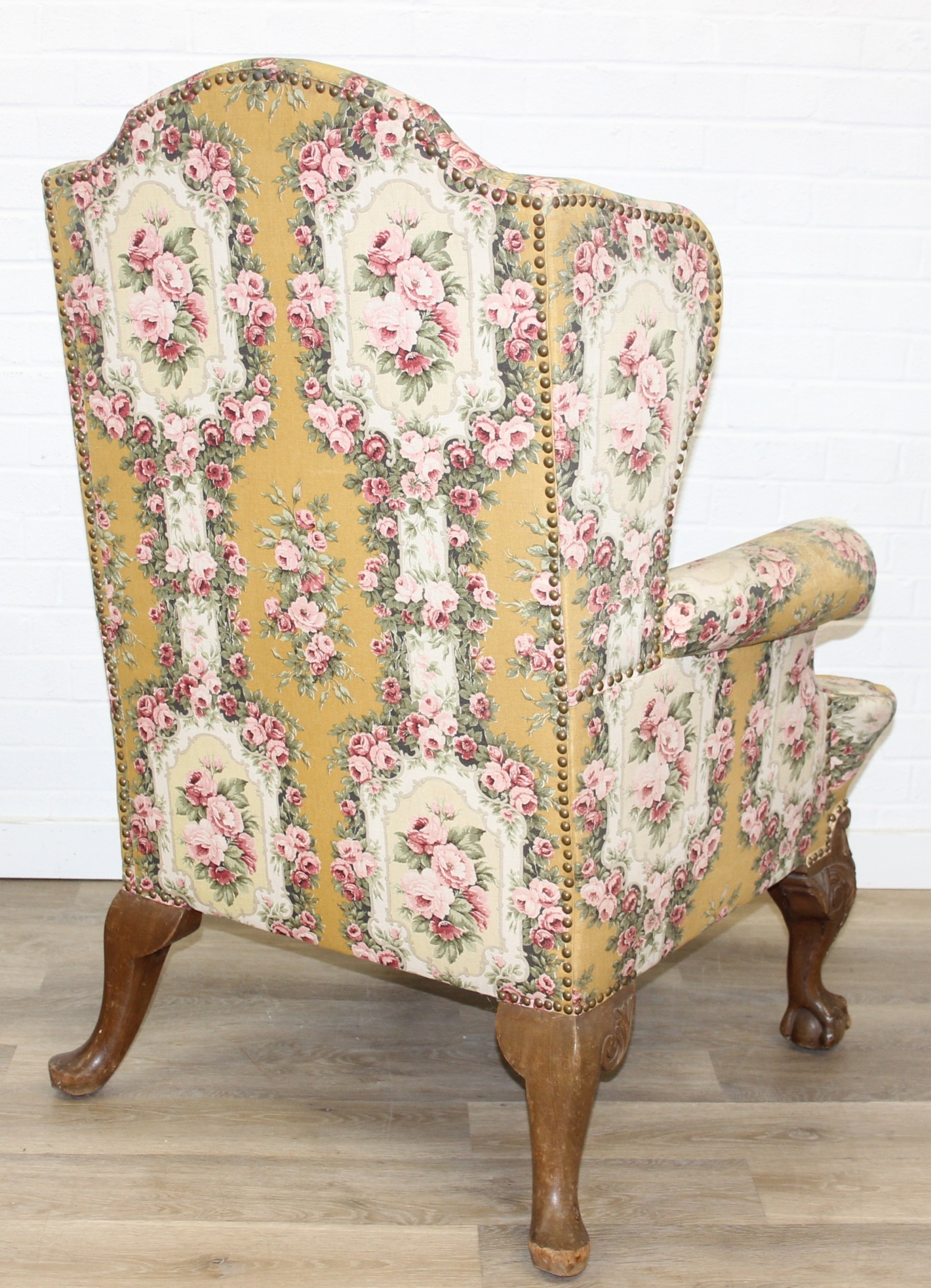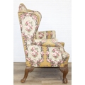 Vintage Georgian style wingback armchair with highly decorative floral patterned upholstery and ball & claw feet, 87cm wide x 125cm high