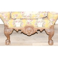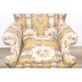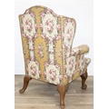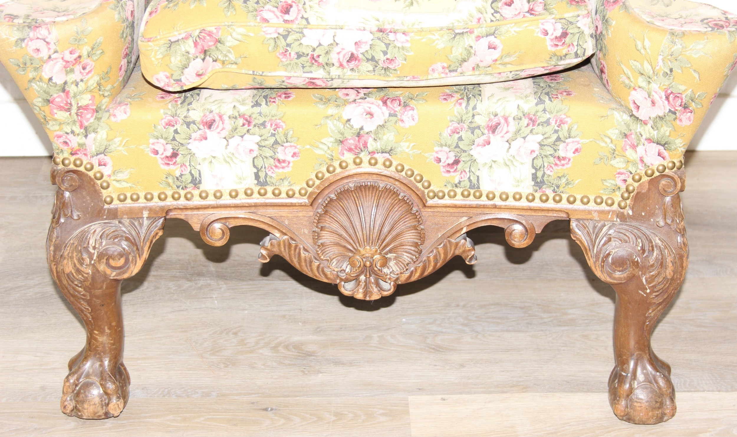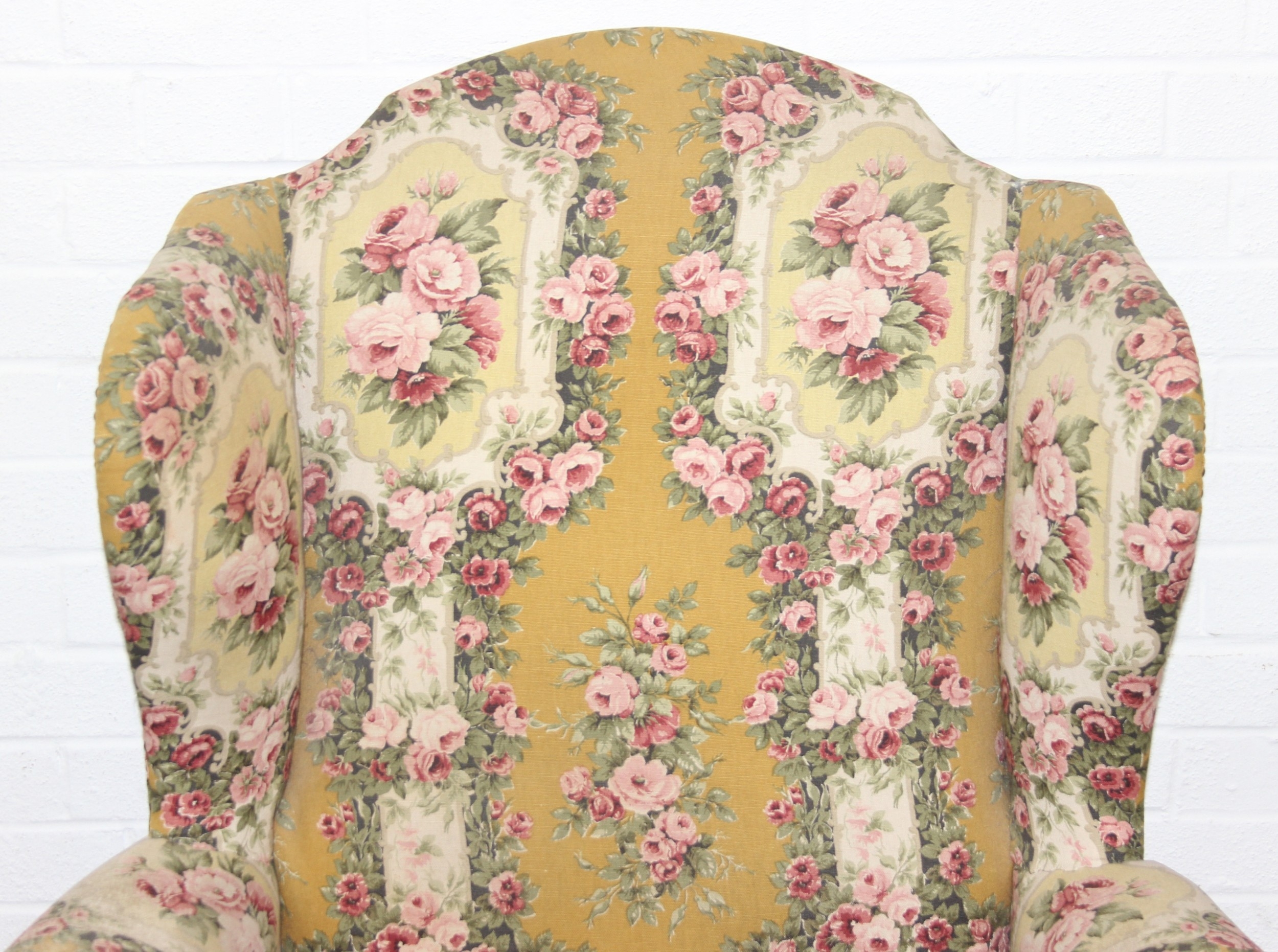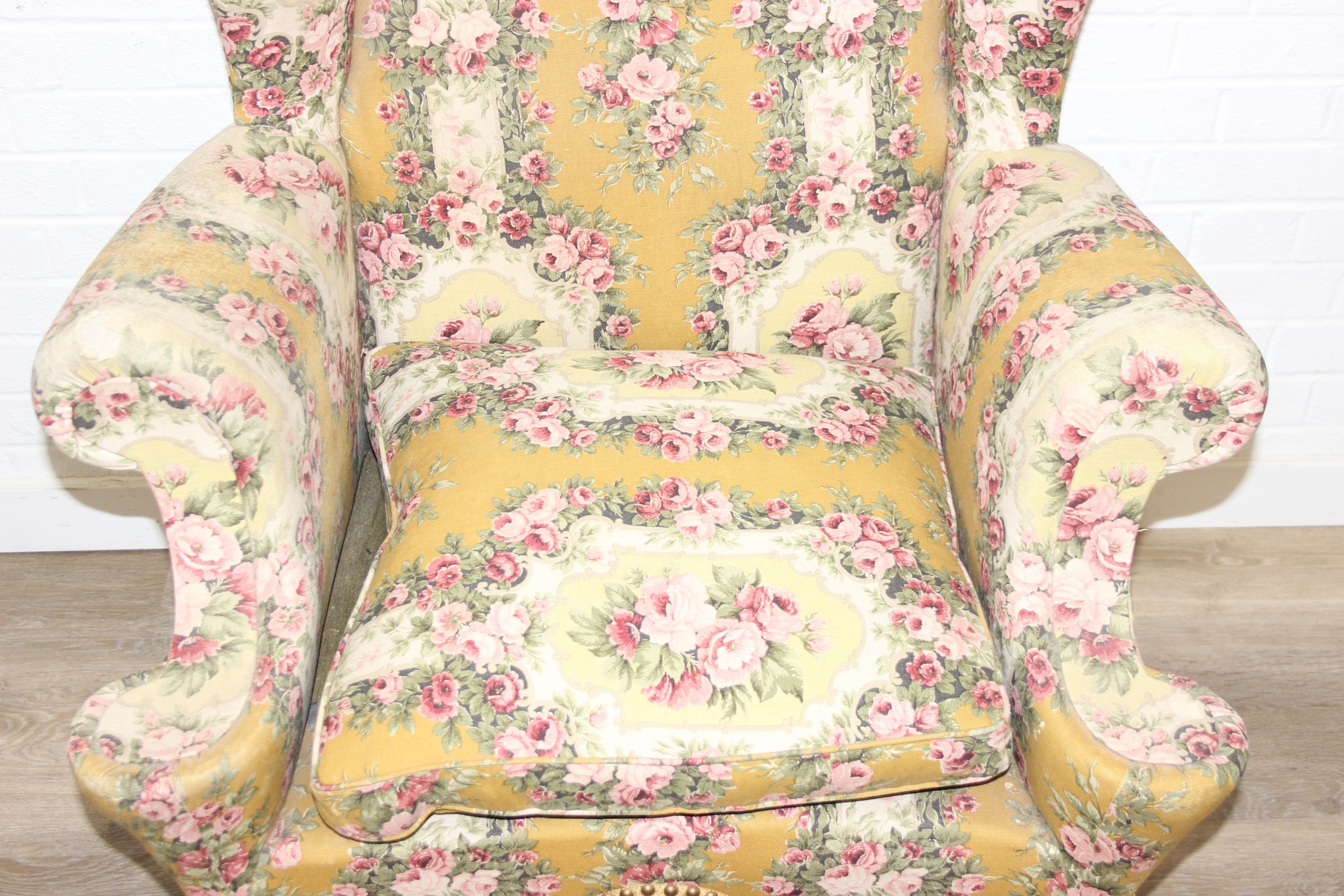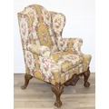 Vintage Georgian style wingback armchair with highly decorative floral patterned upholstery and ball & claw feet, 87cm wide x 125cm high