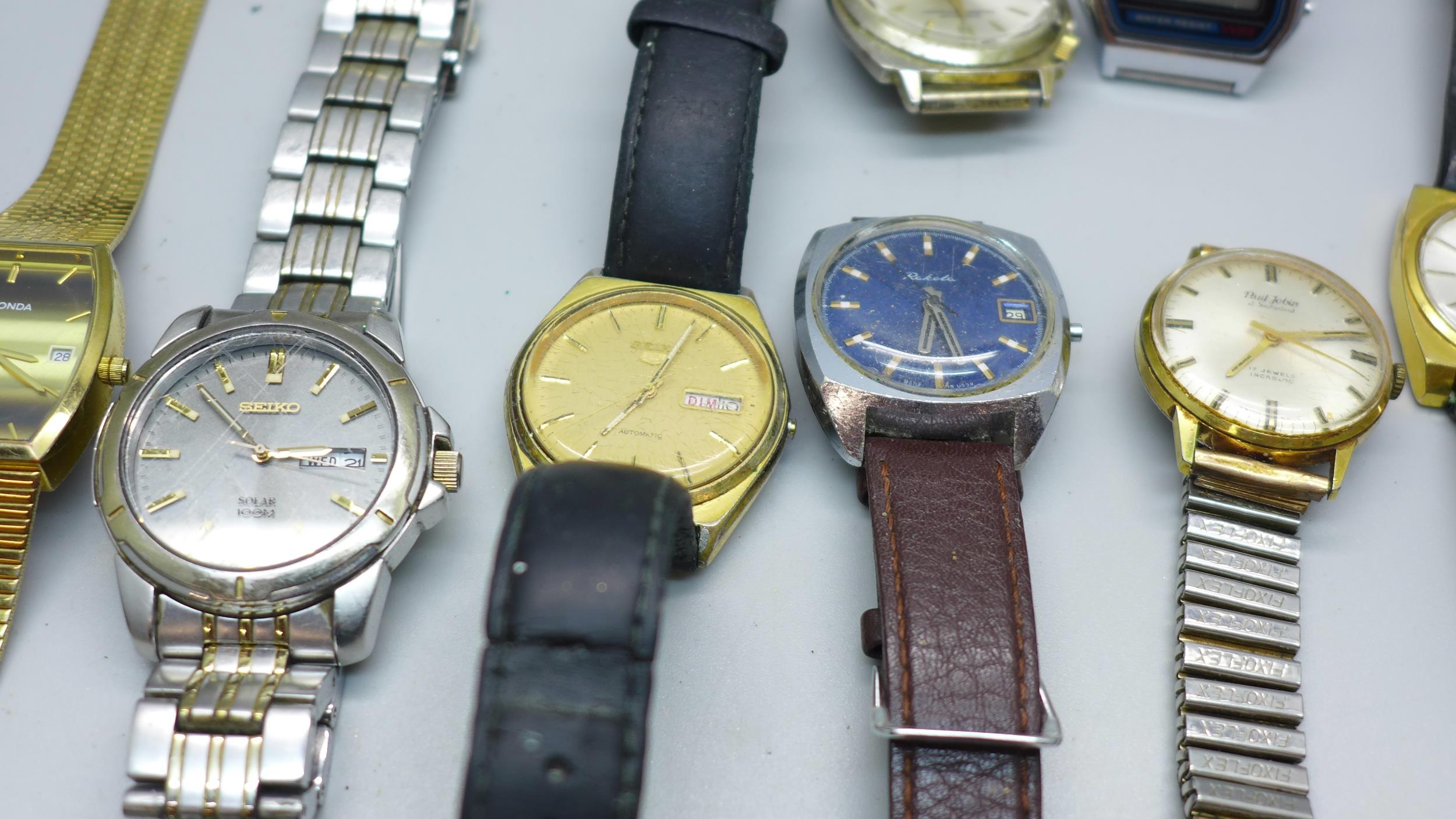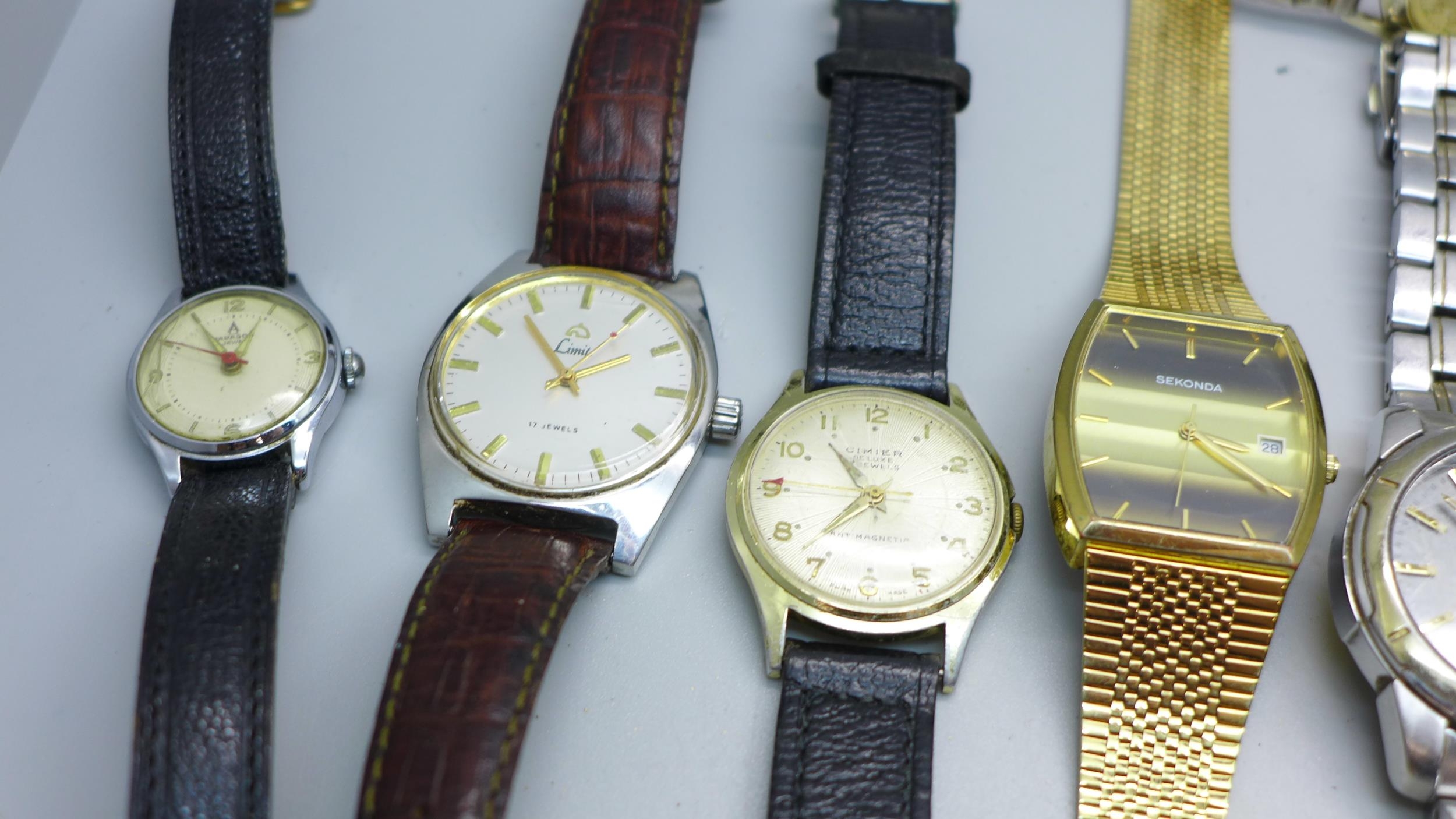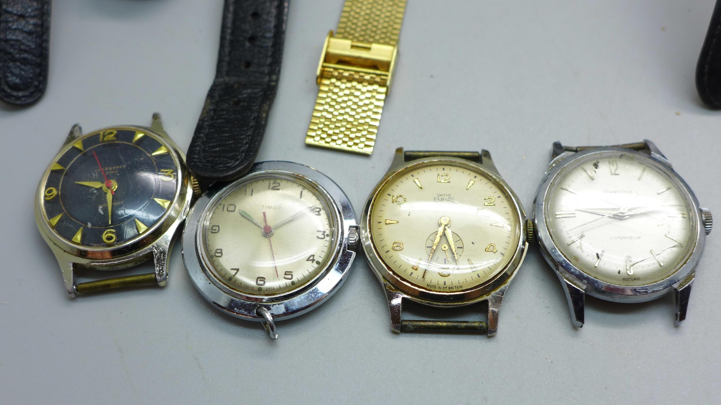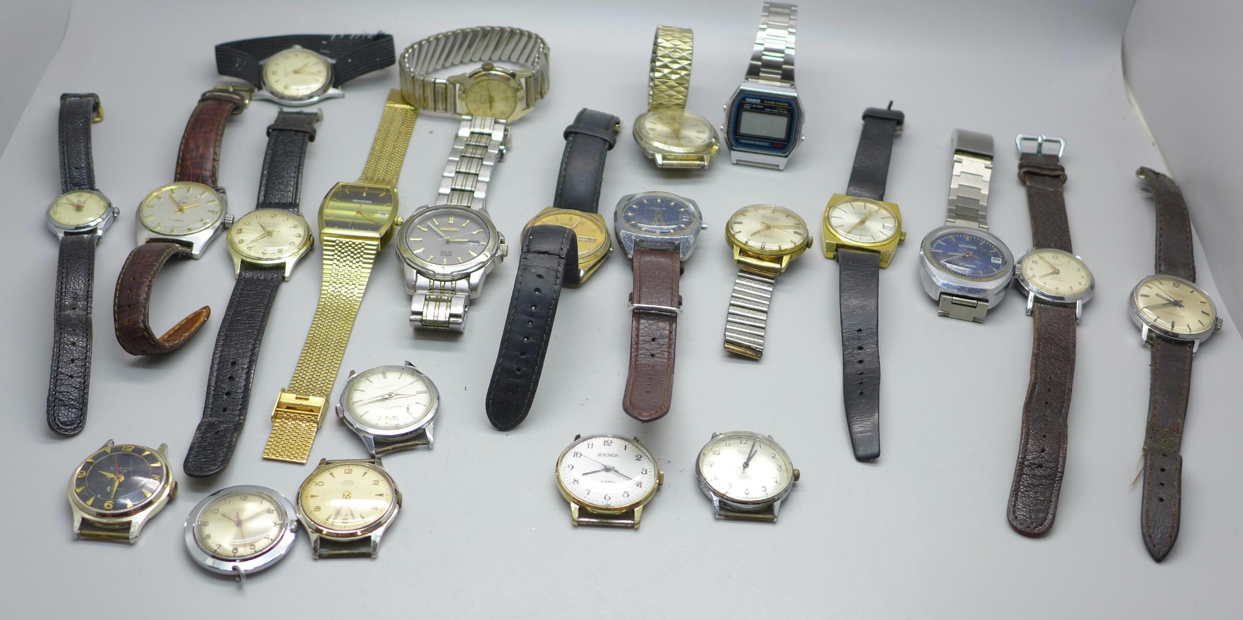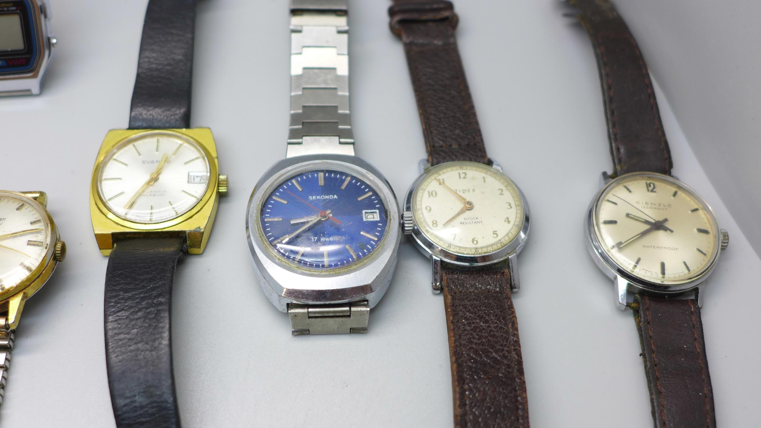 A collection of wristwatches including Ingersoll, Timex, Kienzle, Junghans, Sekonda, Seiko, Smiths Empire, etc.