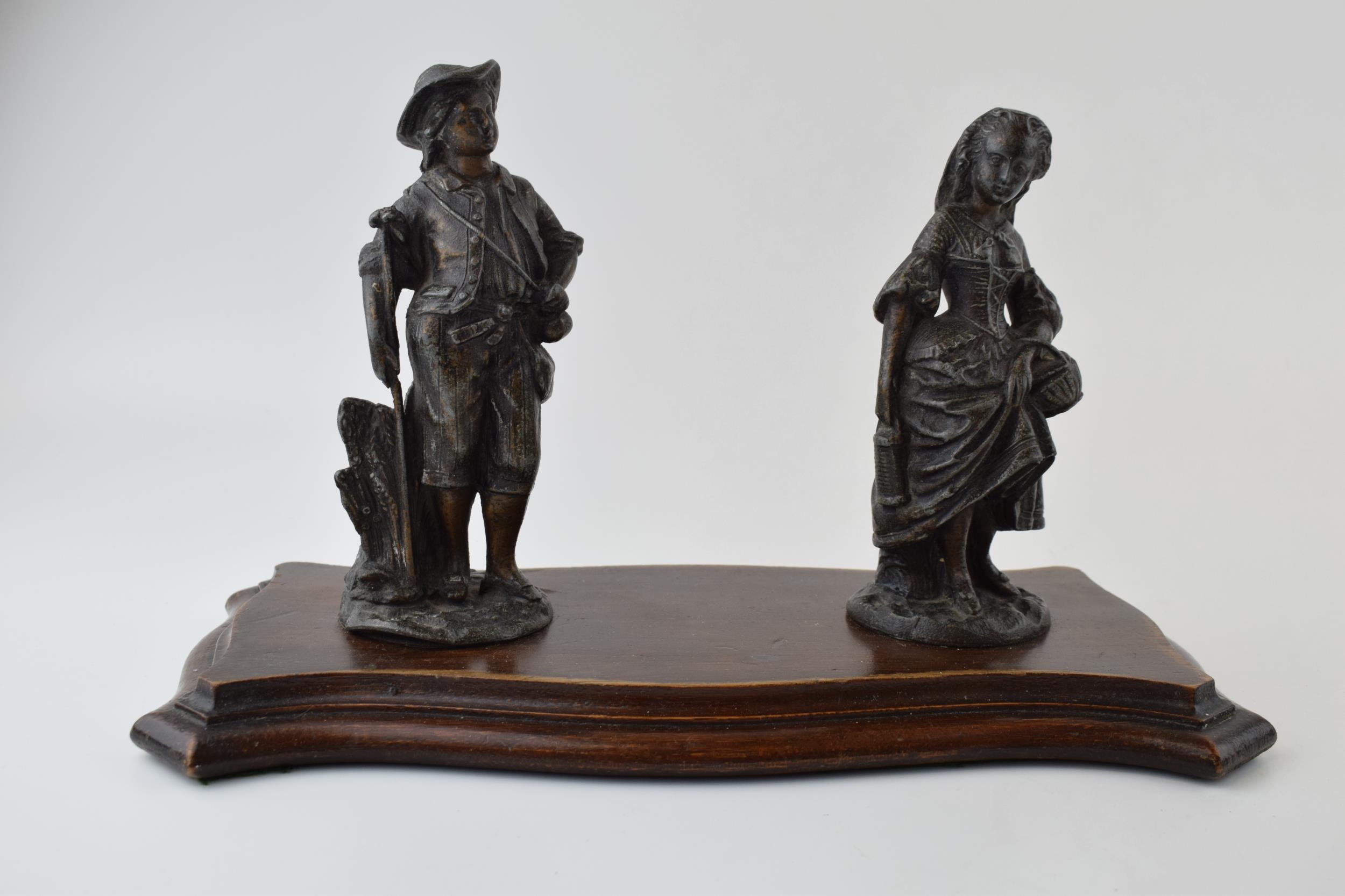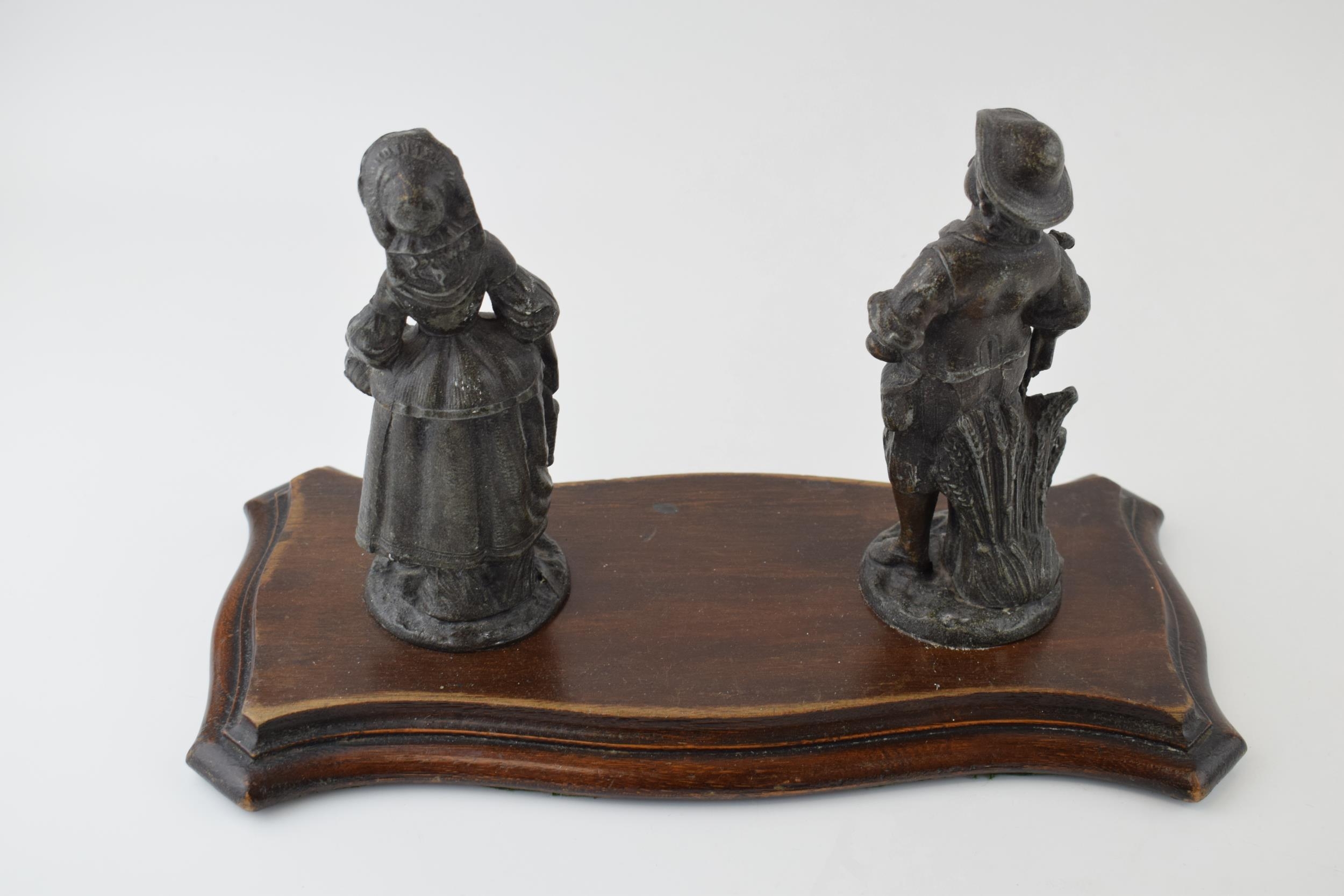 Two spelter figures mounted on a wooden base. Height 19cm.