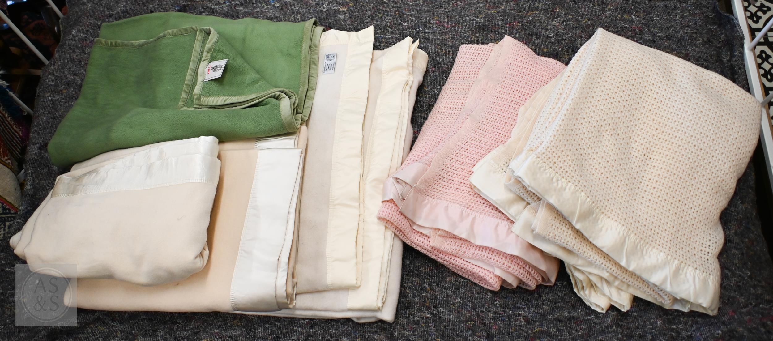 A selection of pink and cream woollen cellular and solid weave blankets, some with satin edging, various sizes and including one by John Atkinson of Hainsworth (2 boxes)