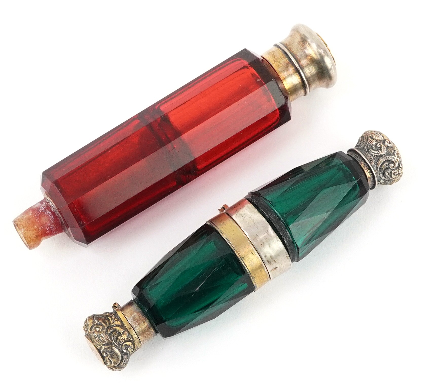 Two Victorian double ended facetted glass scent bottles with white metal mounts, the largest 12cm in length.