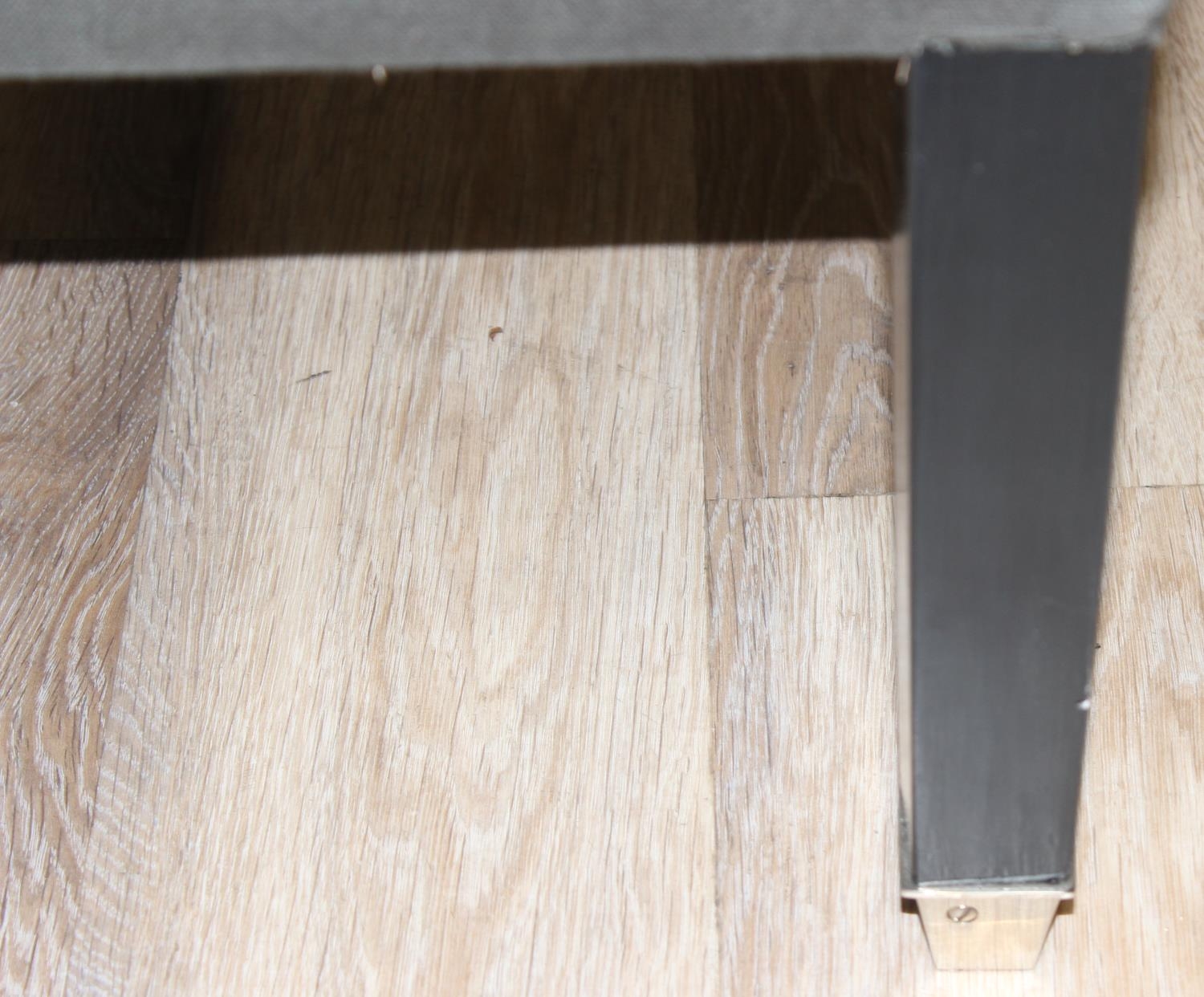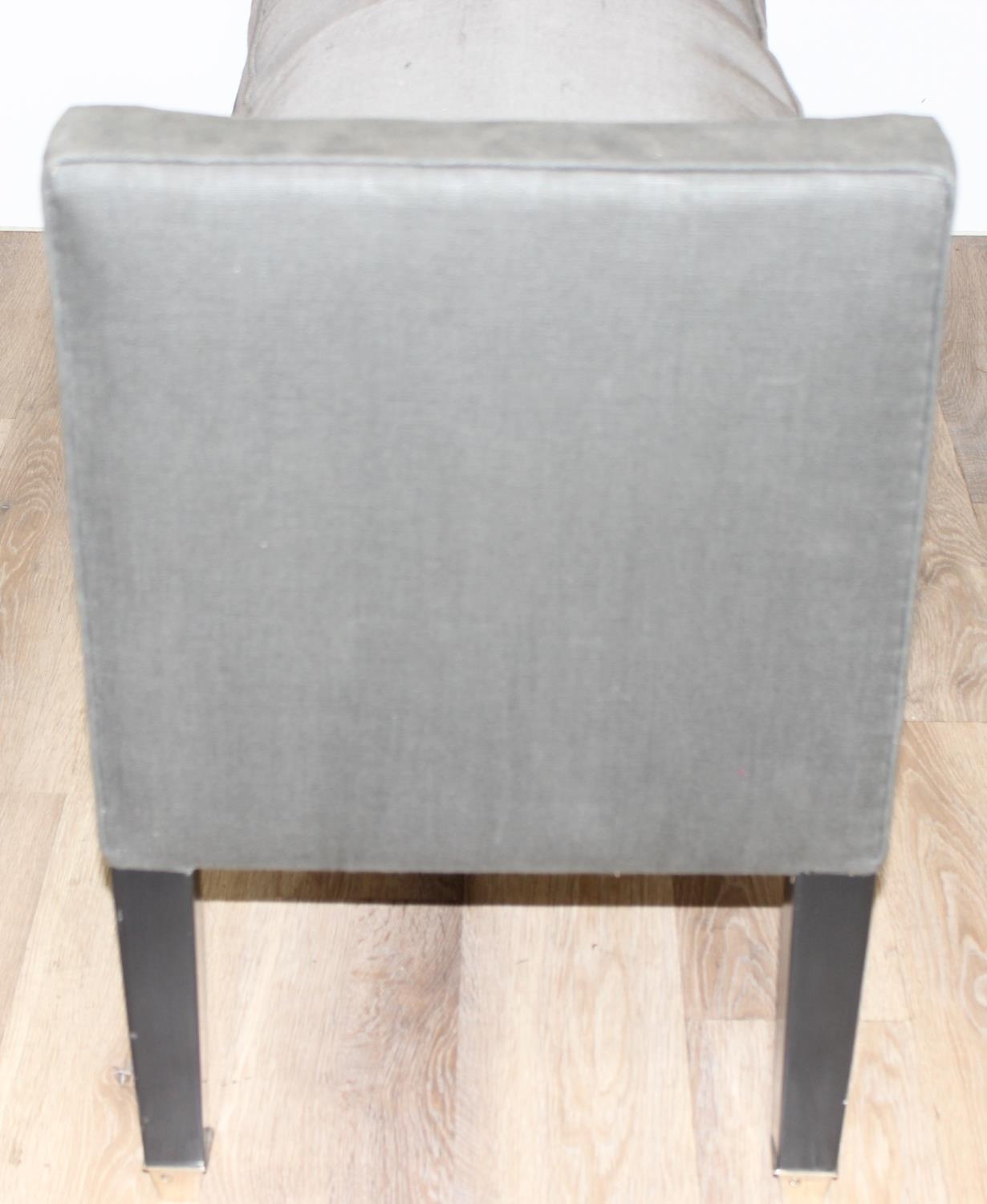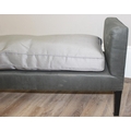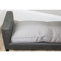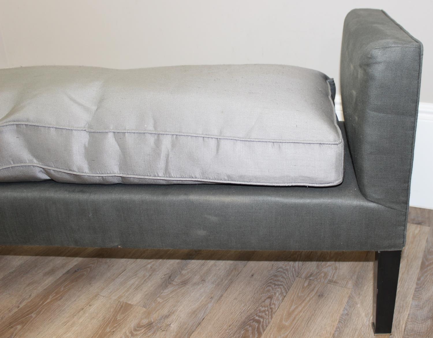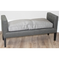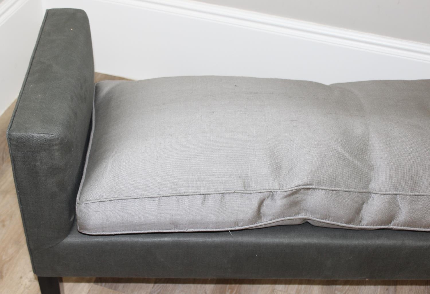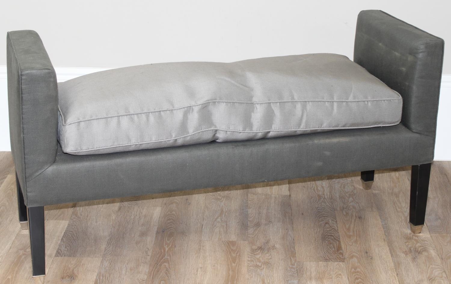 A modern two seater upholstered bench or window seat in grey with cushion, approx 130cm wide x 44cm deep x 68cm tall