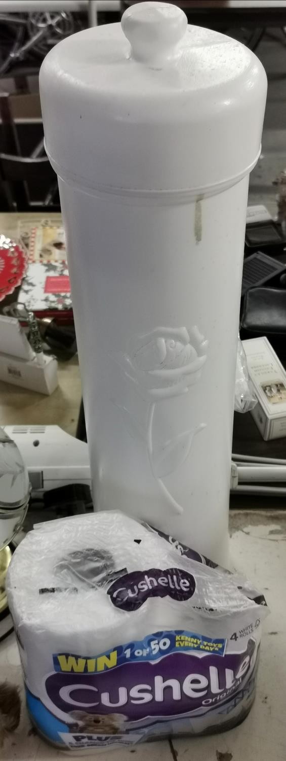 Approx 2 ft tall plastic toilet roll holder full of toilet rolls & open 4 pack of Cushelle toilet rolls