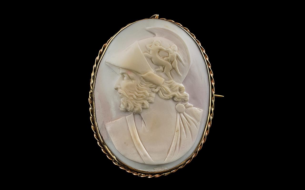 Victorian Period - Fine Quality 9ct Gold Mounted Oval Shaped Carved Cameo - Depicting ' Menelaus ' King of Sparta, After the Antique. Can by Worn as a Brooch or Pendant. Marked 9ct Gold. Beautiful Quality Carved Cameo, Dates About 1860's. Height 2 Inches - 5 cms. Excellent Condition In All Aspects. Provenance - From a Ladies Private Collection.