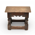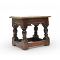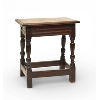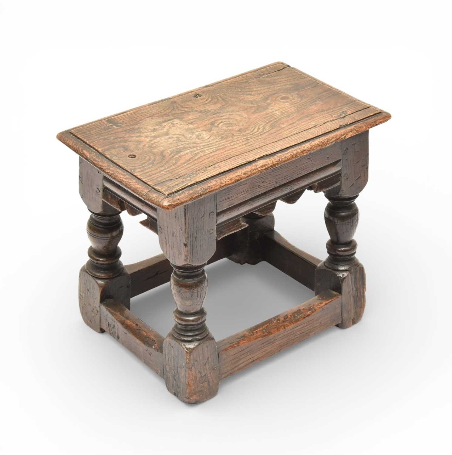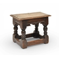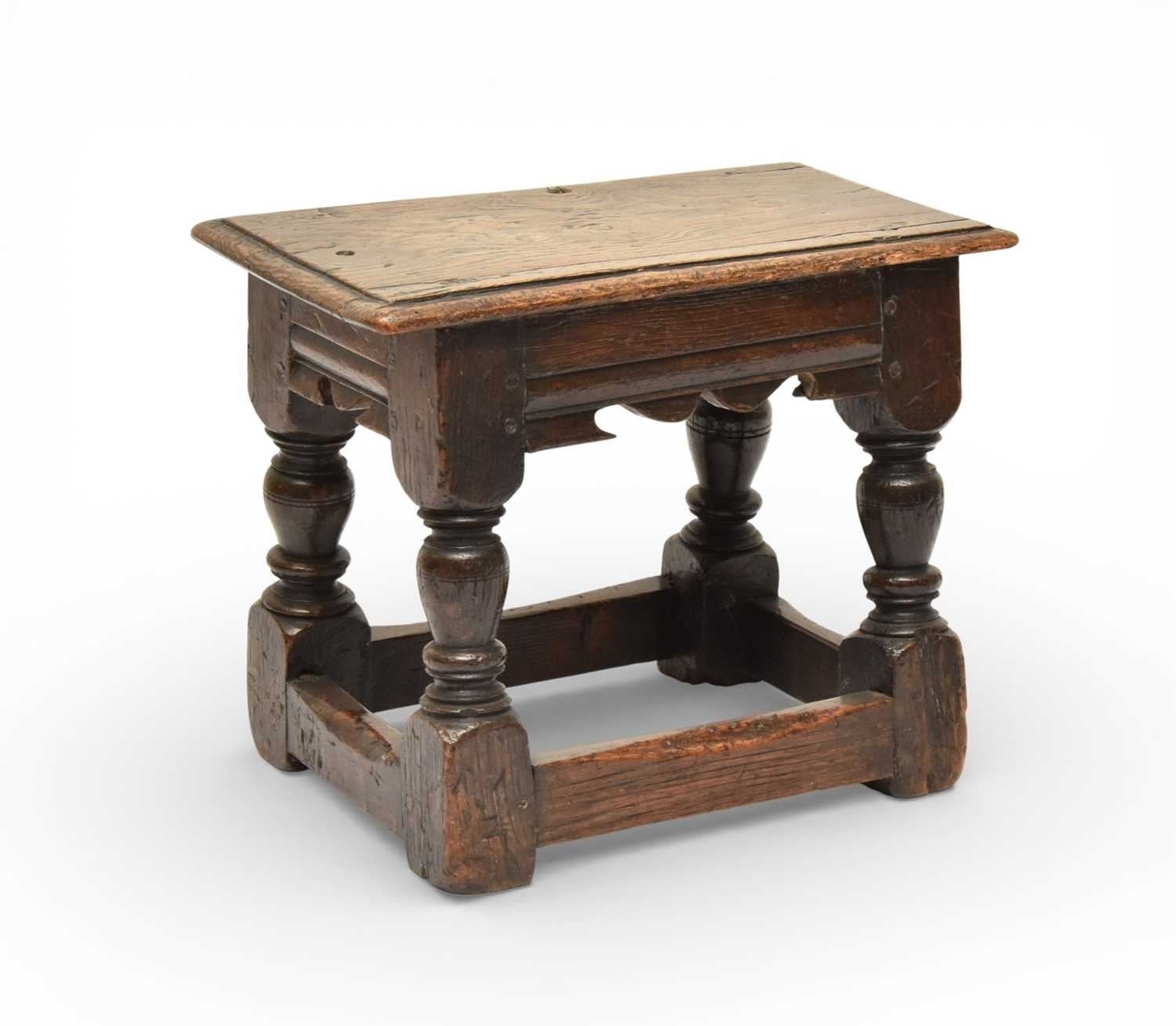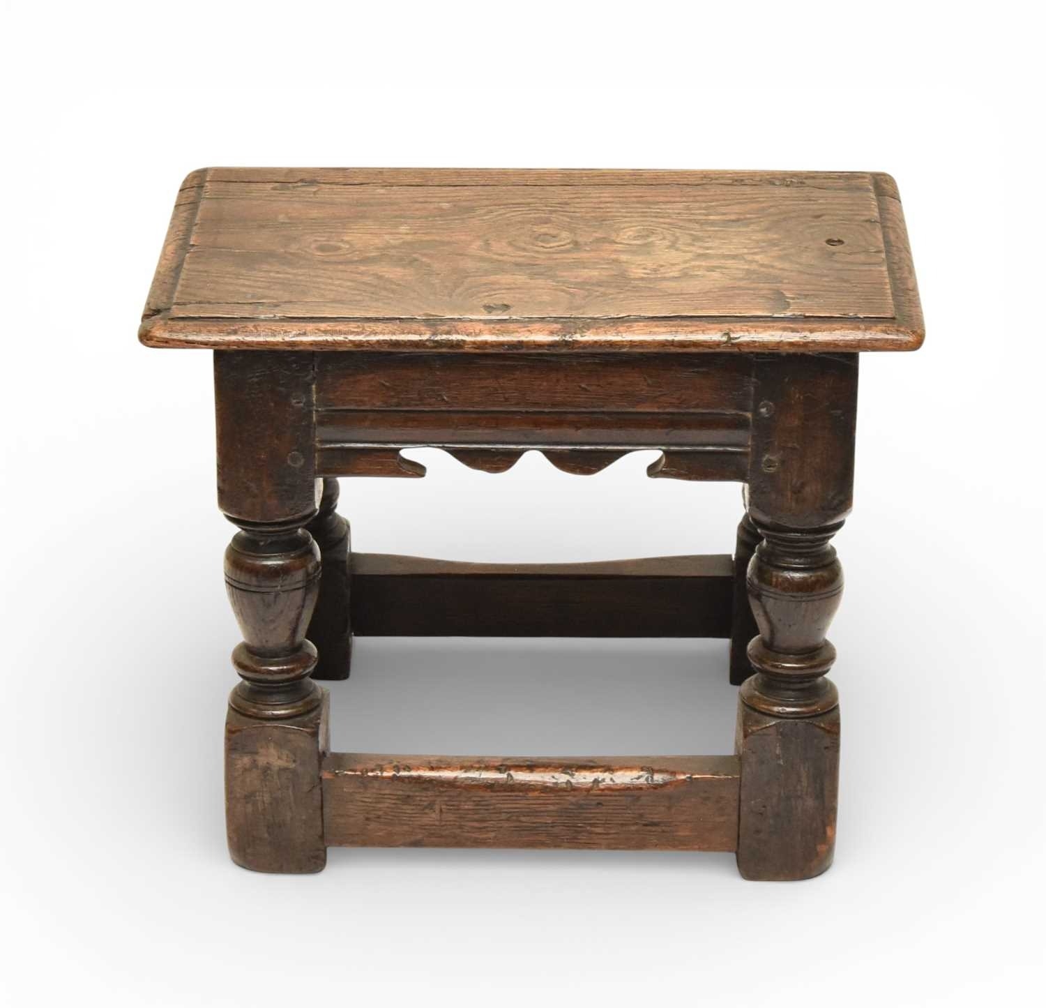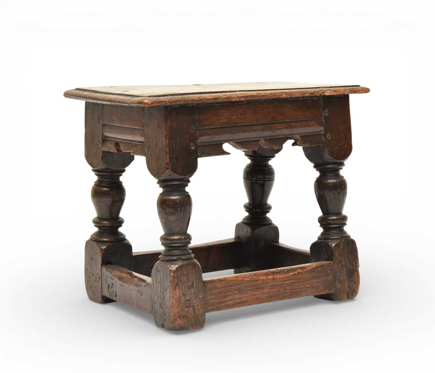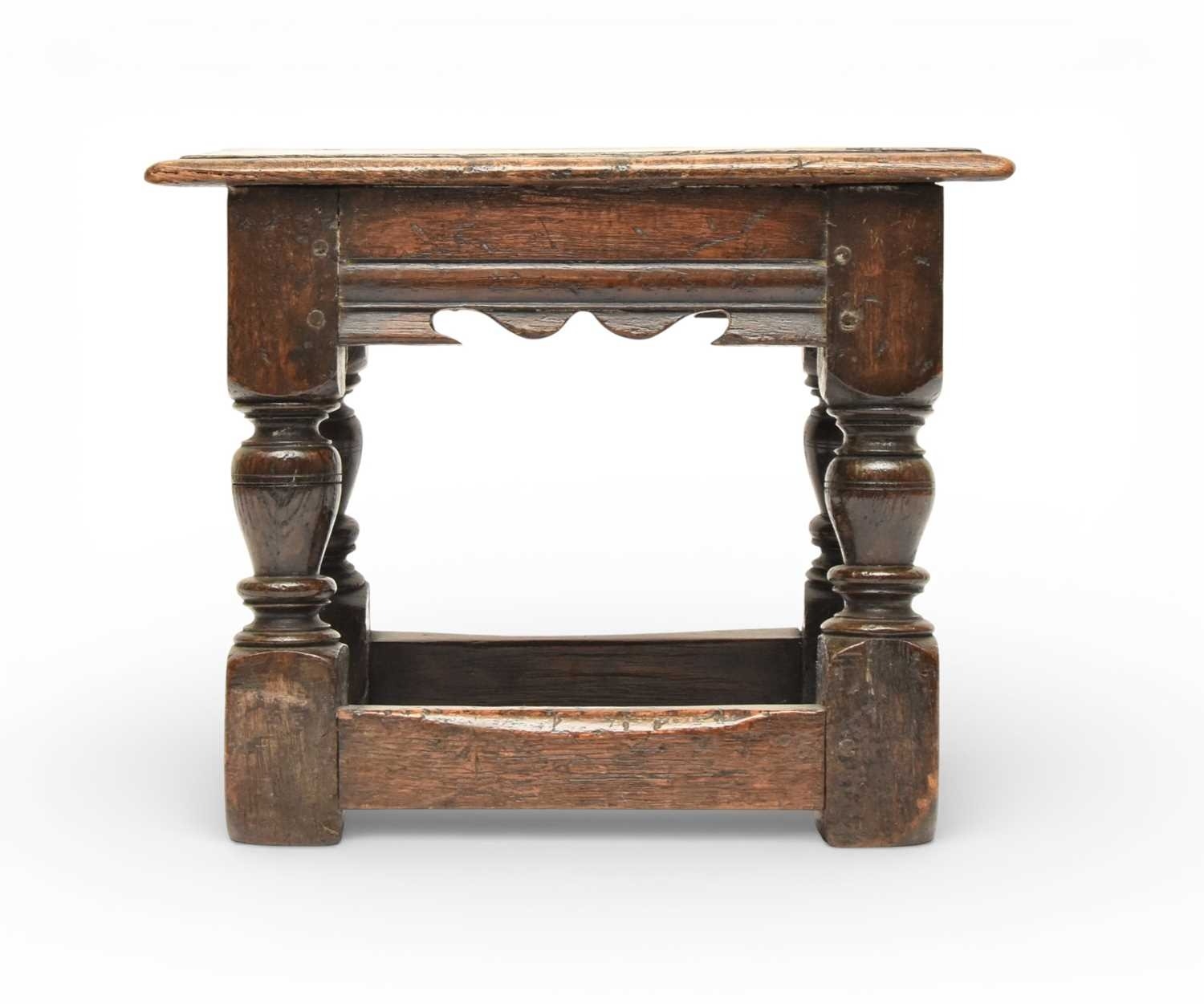 A 17th century oak low joint stool The moulded seat above a channel-moulded frieze with shaped apron, raised on turned baluster supports and block feet united by plain stretchers. 42cm wide x 25cm deep x 33cm high