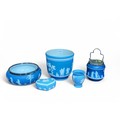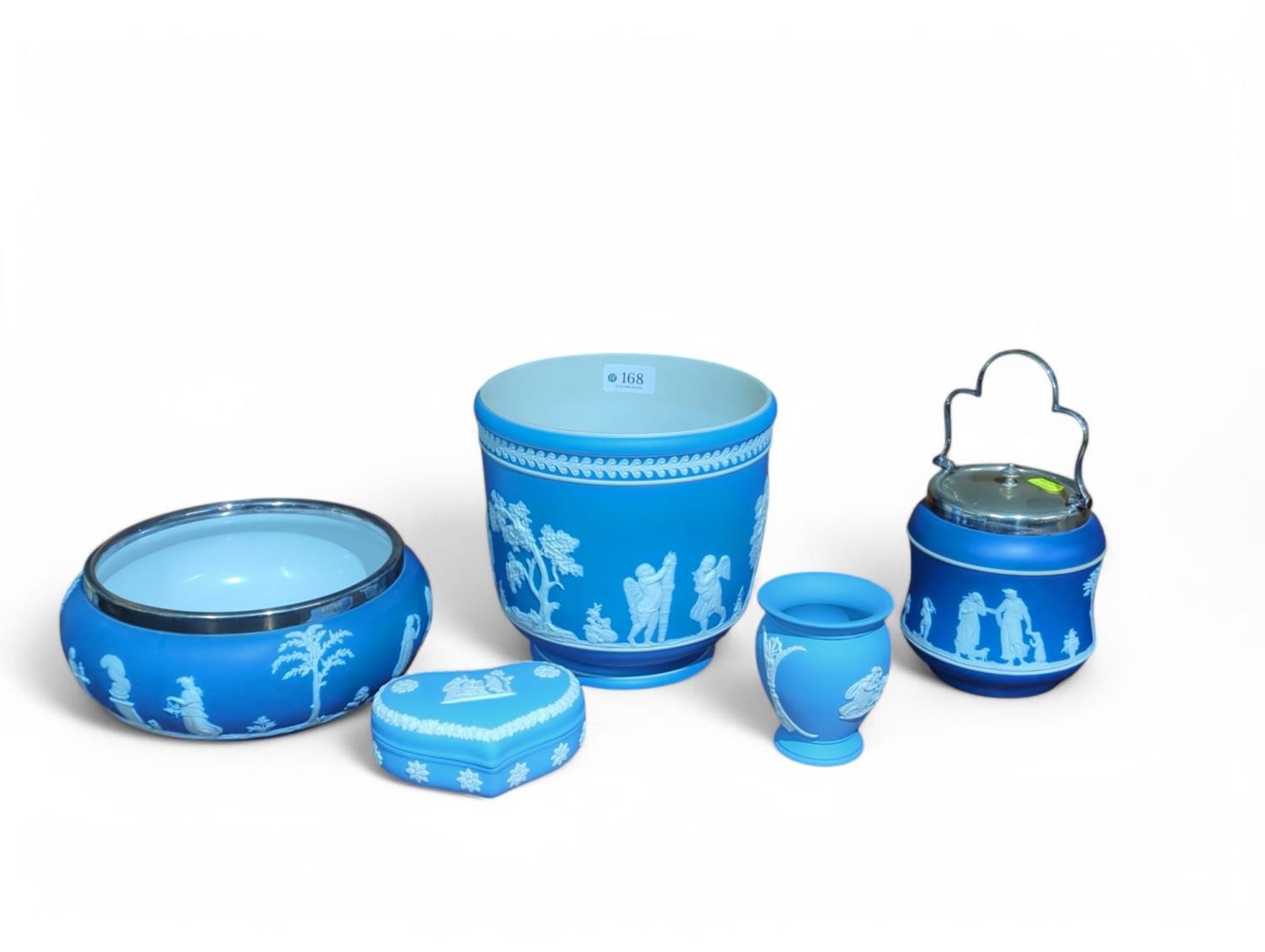 5 Pieces of Blue Wedgewood Jasperware including Jardiniere. H19cm. D19cm.