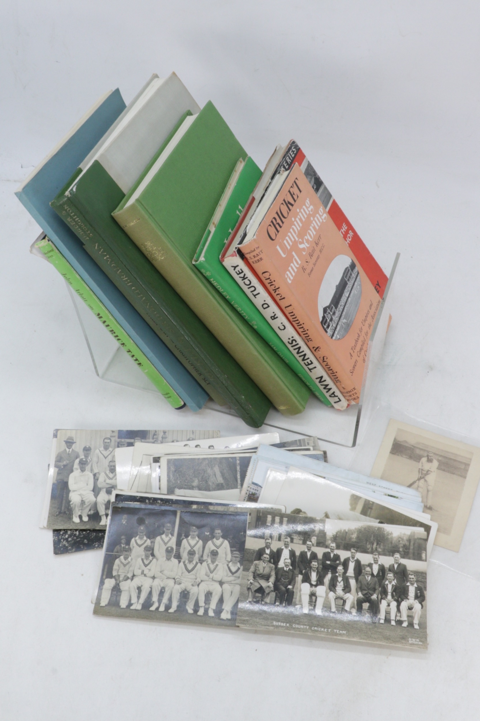 A quantity of vintage cricket interest postcards, together with cricket interest books to include Sort of A cricket person, Headly Verity, How to bowl them out, Cricketing Lives, The Art of Cricket etc