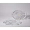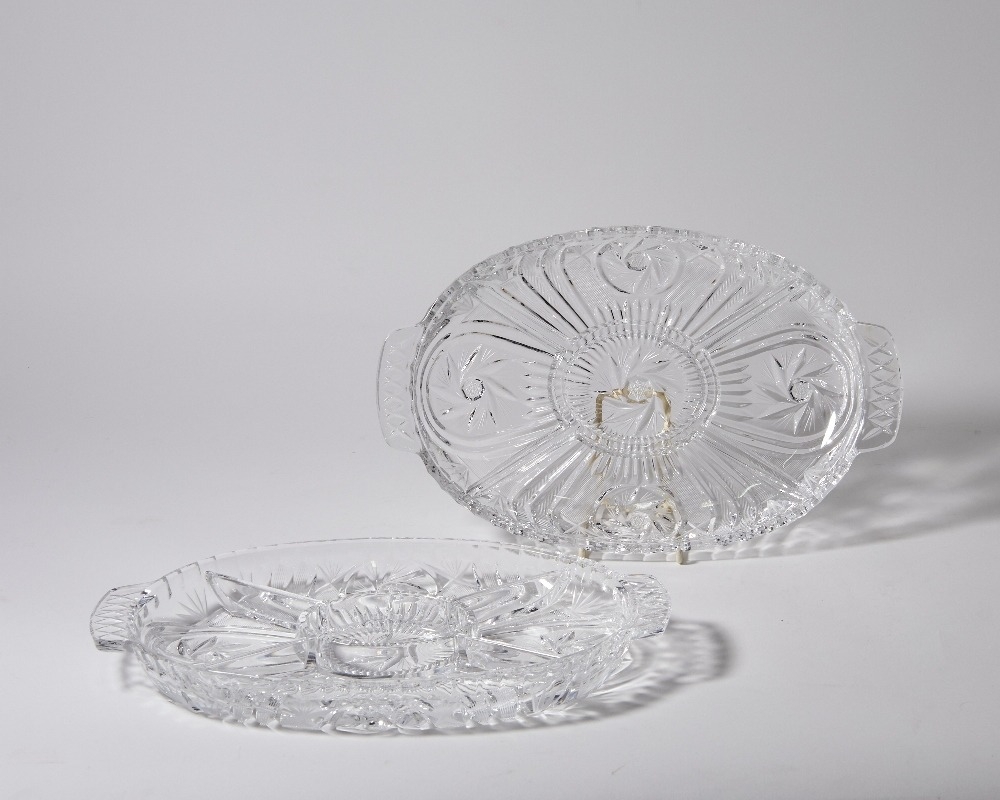 A pair of modern Polish Julia Crystal glass serving platters, each of oval twin-handled form with five compartments, the undersides with cut pinwheel design, 35.2cm long (2)