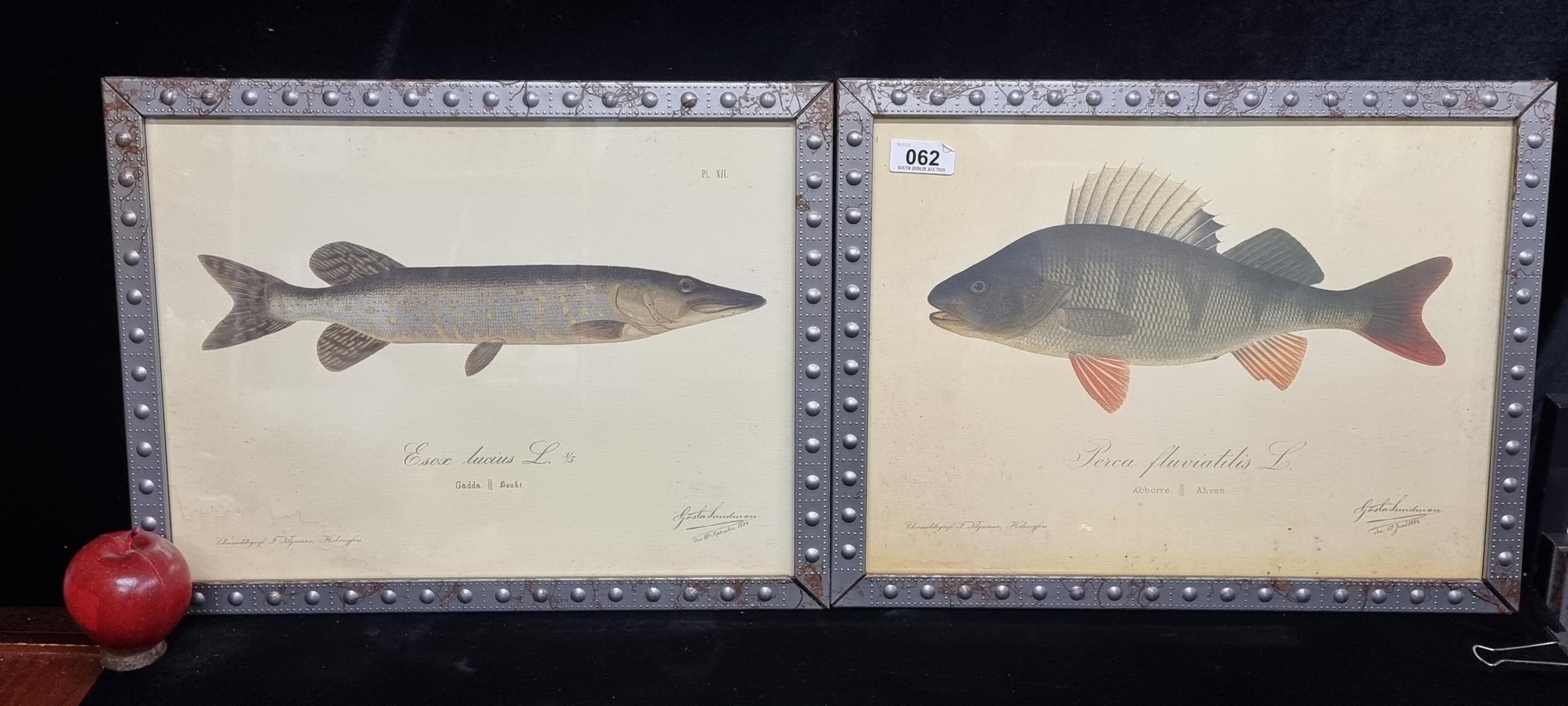 A fabulous pair of natural history prints originally by Finnish artist Gösta Sundman. Features a colourful Perch fish and a Northern Pike. Housed in metal frames.
