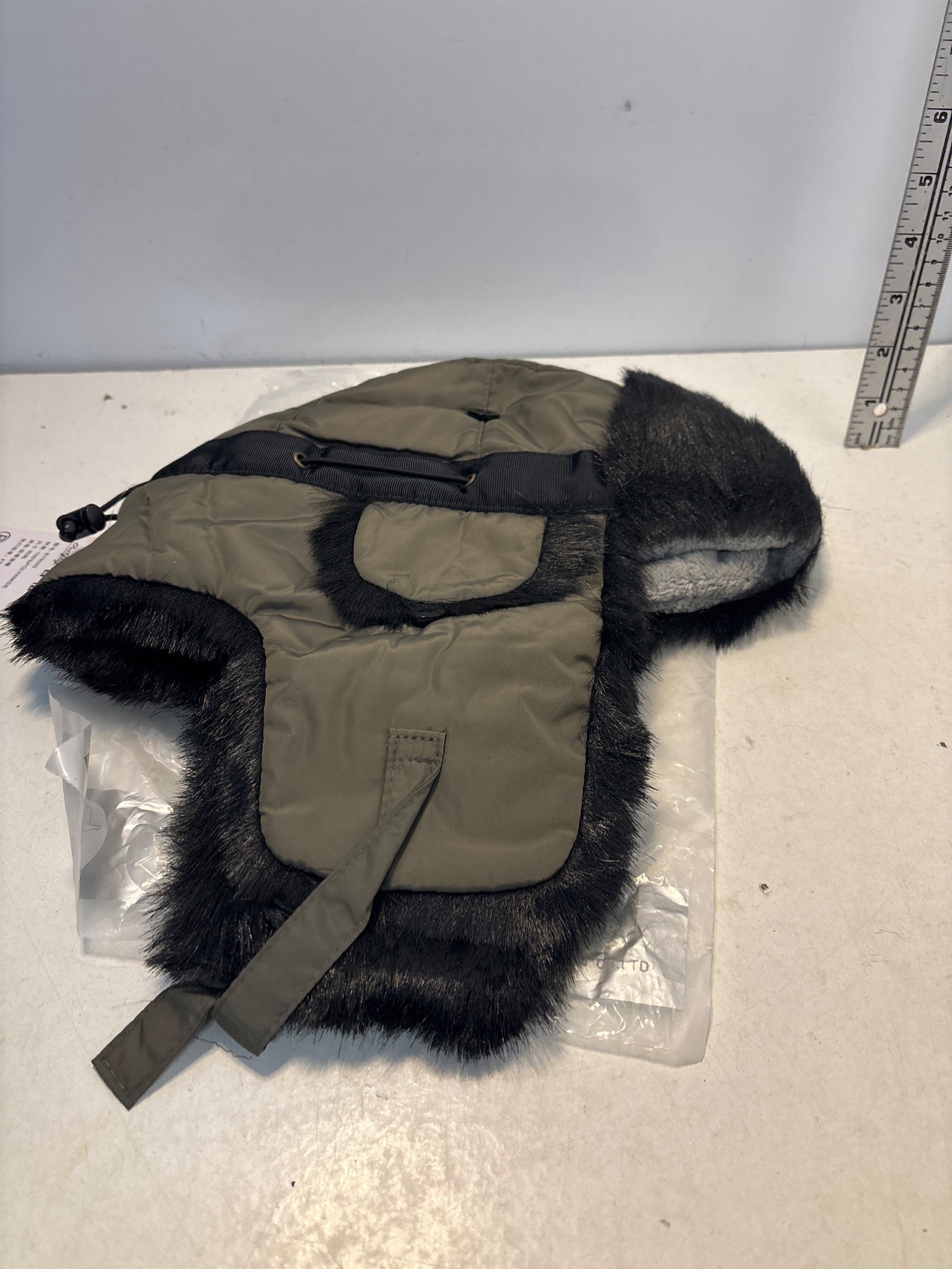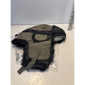 Green hat with black faux fur trim and adjustable straps.