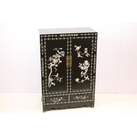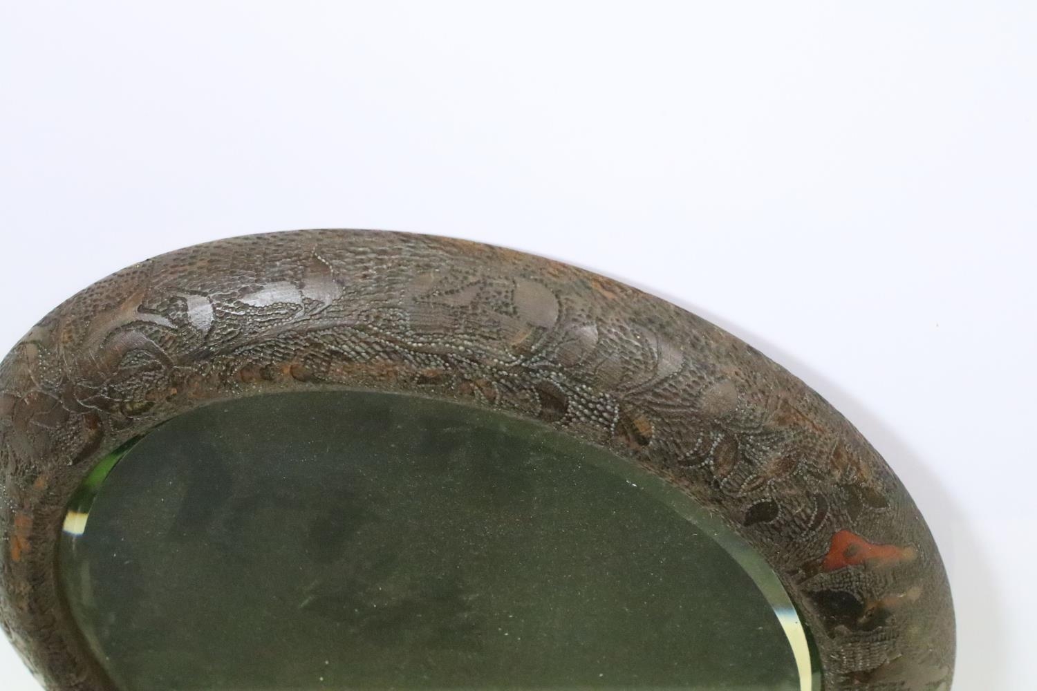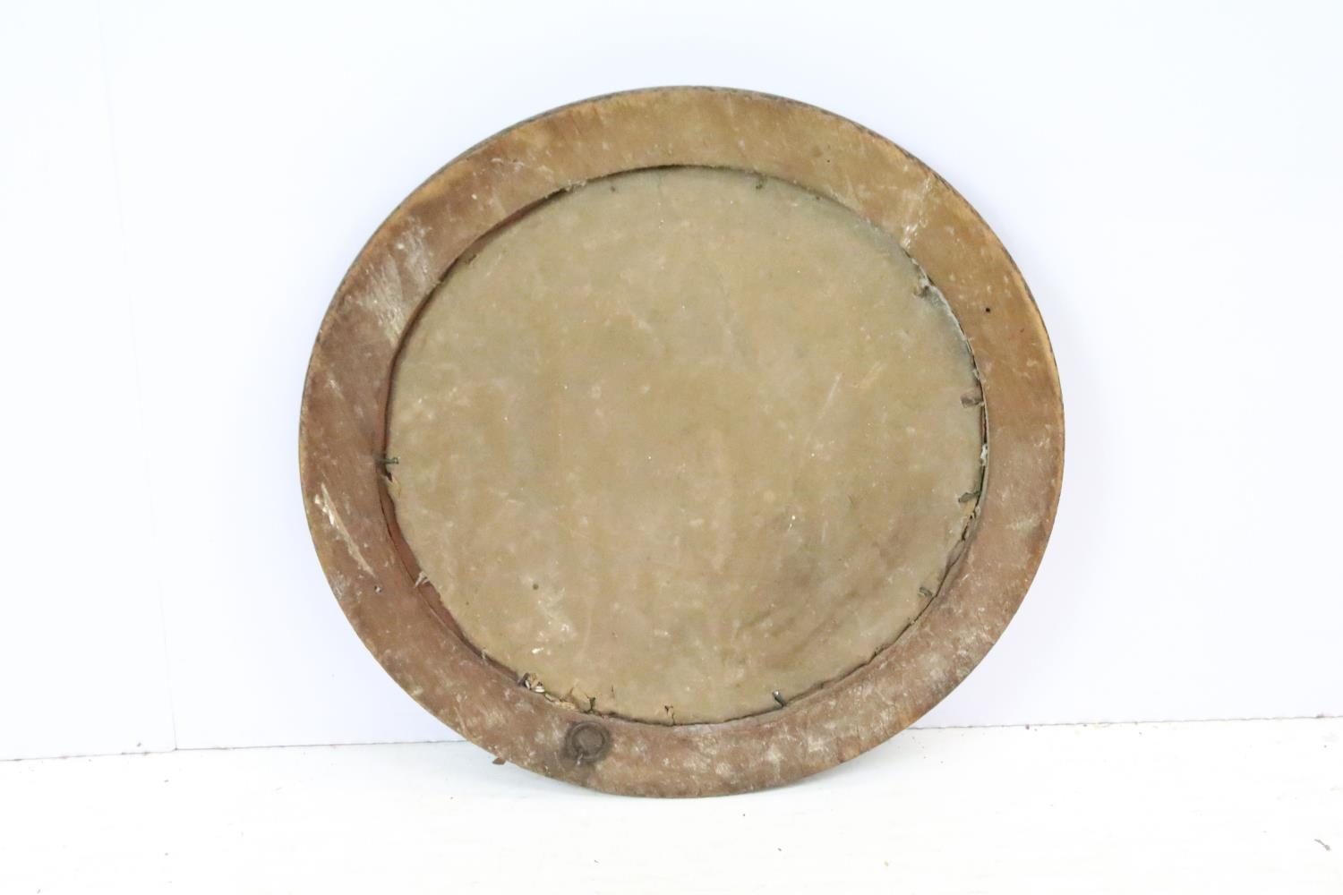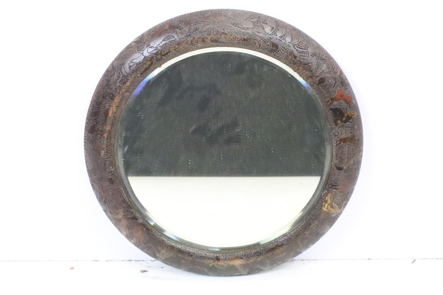 Antique poker work circular wall mirror, the glass with bevelled edge, approx 38cm diameter