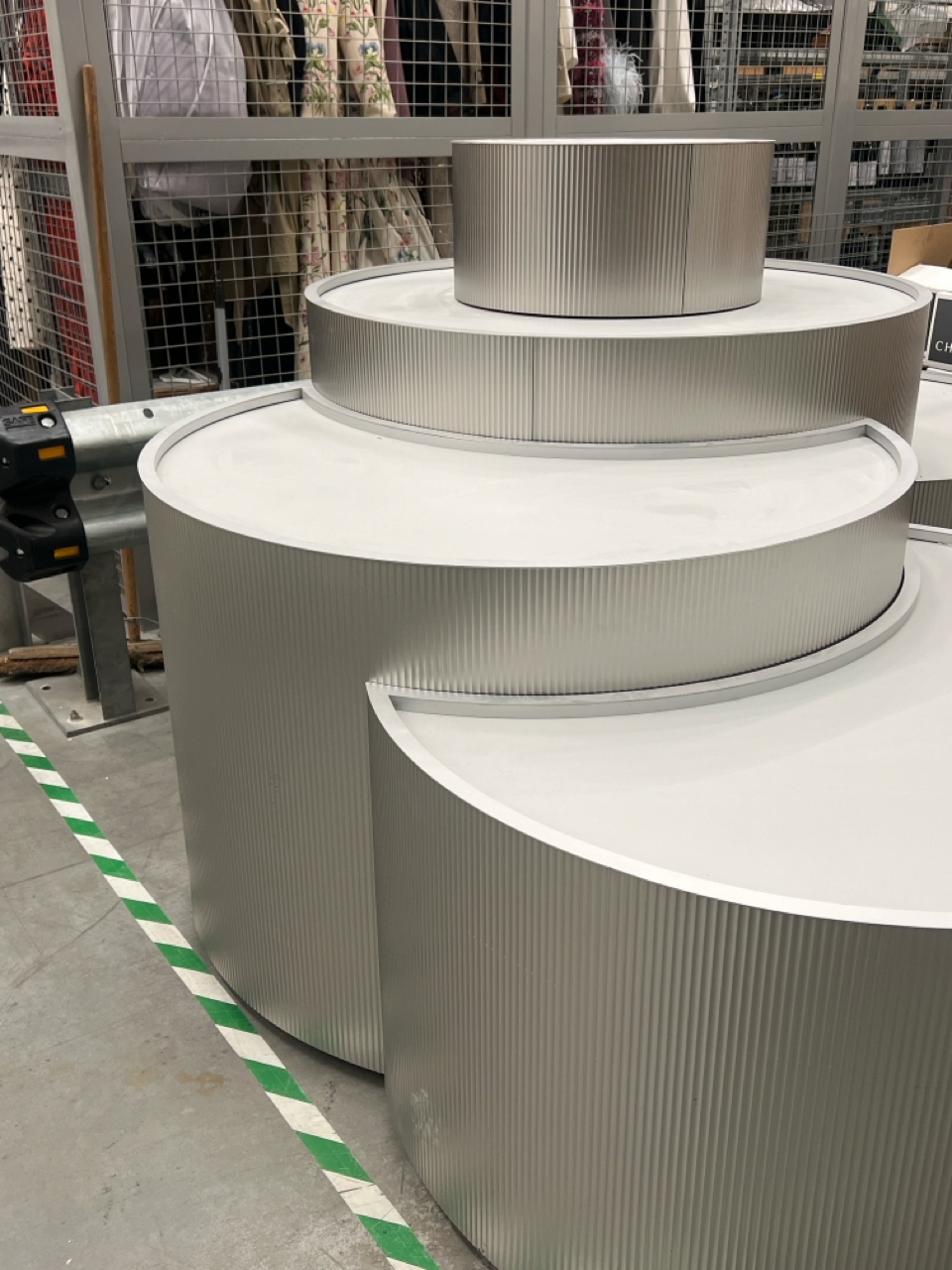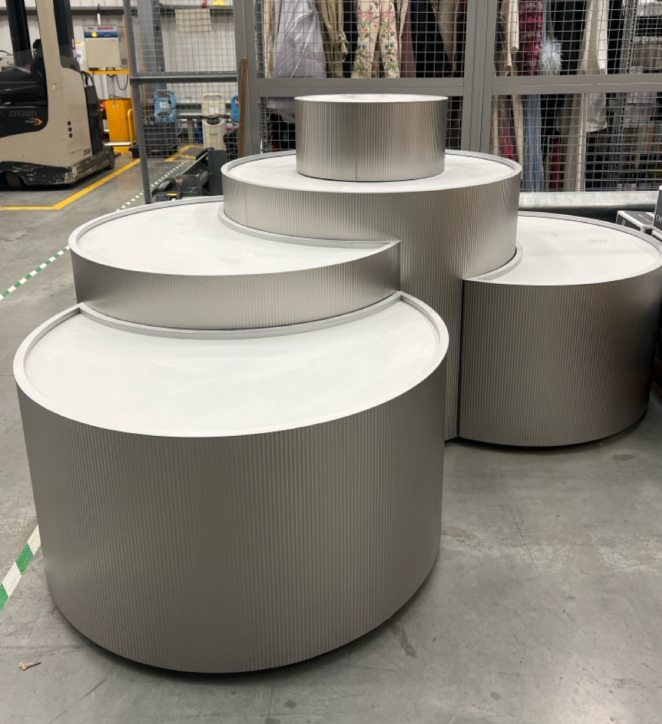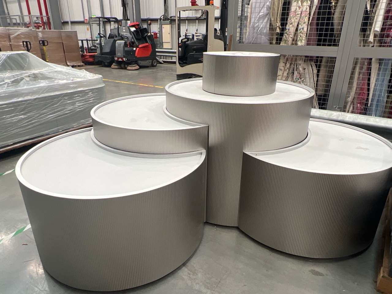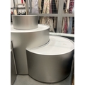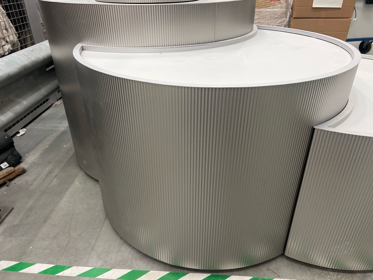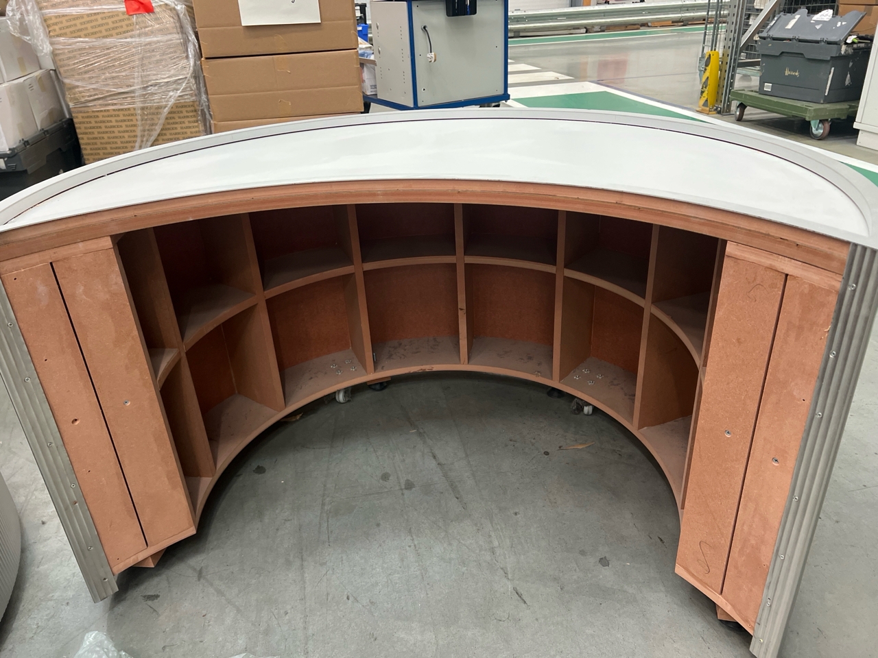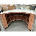 Large curved five-part display unit with internal storage / Approx. 1.3m h x 2.3m w x 2.2m d / See images for example condition