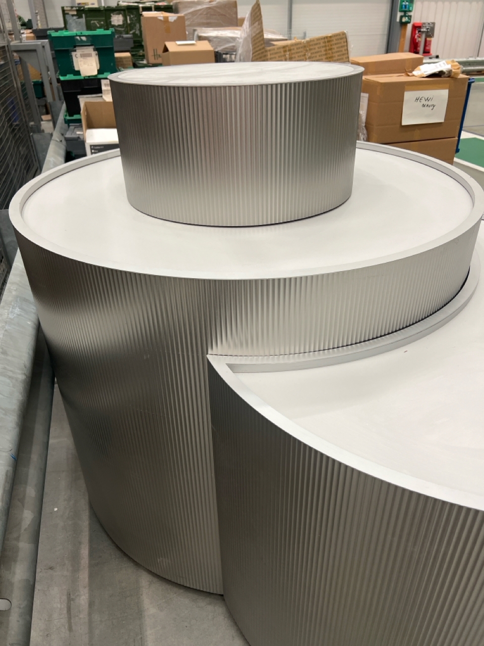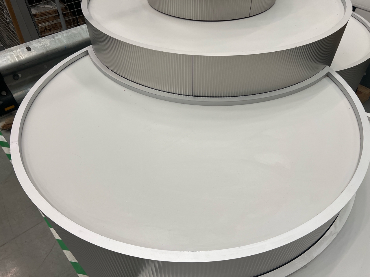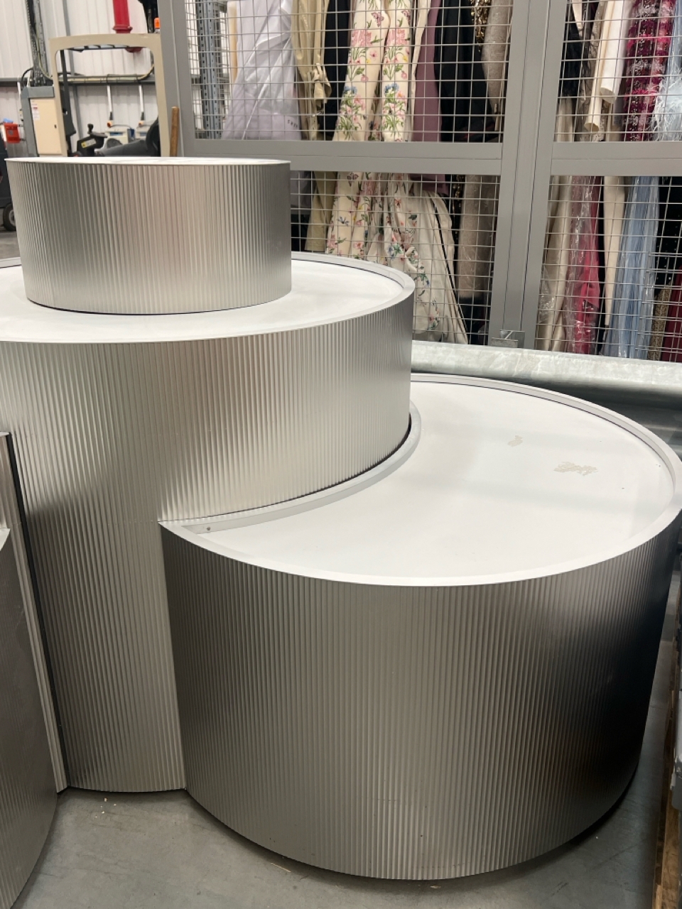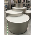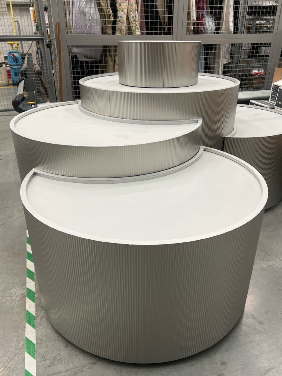 Large curved five-part display unit with internal storage / Approx. 1.3m h x 2.3m w x 2.2m d / See images for example condition