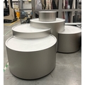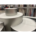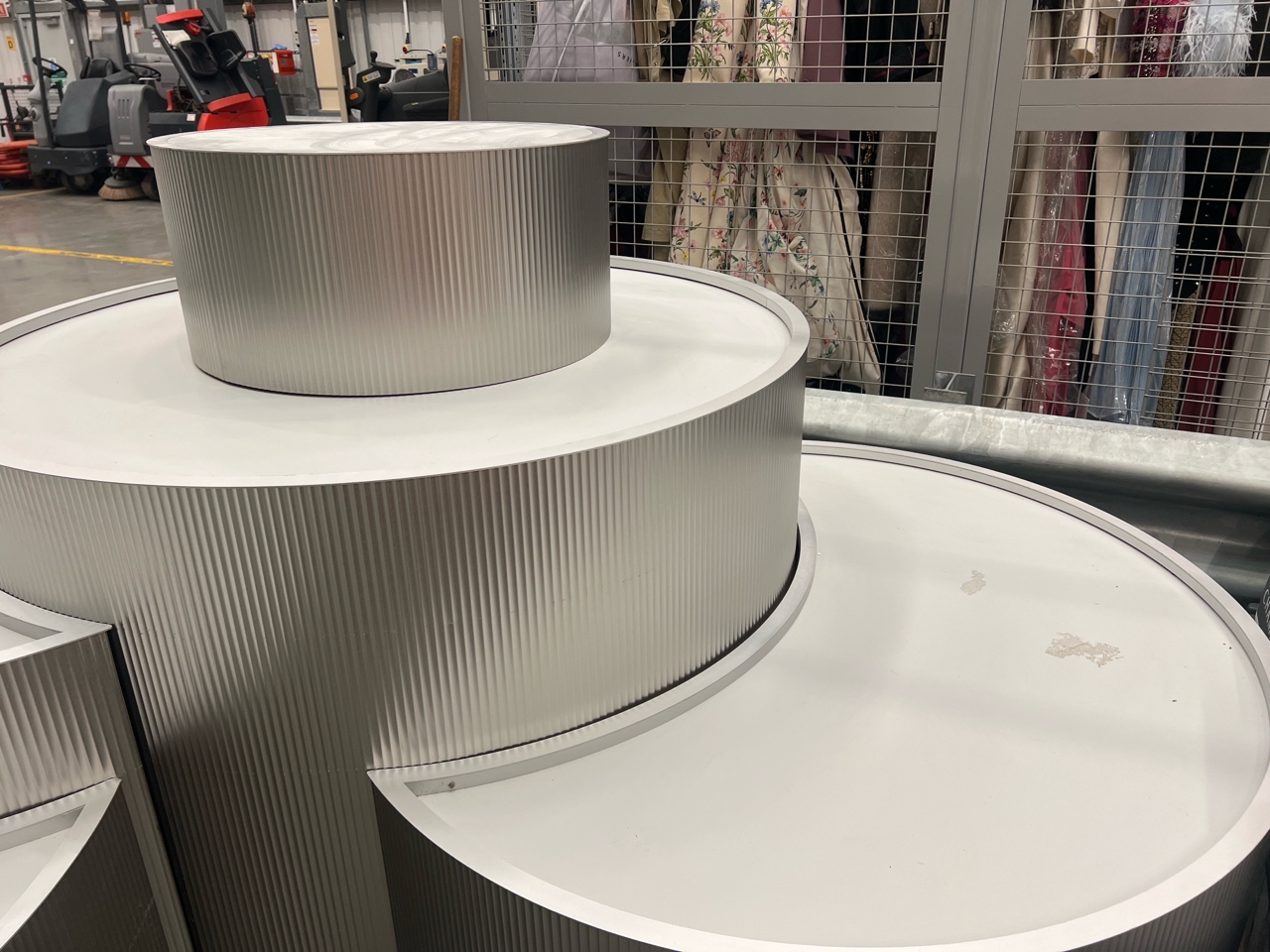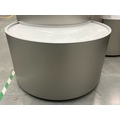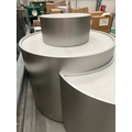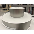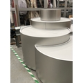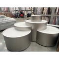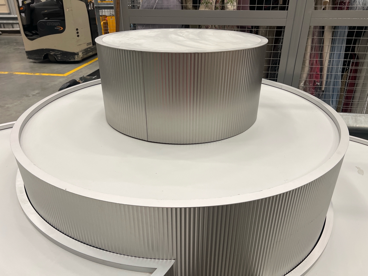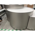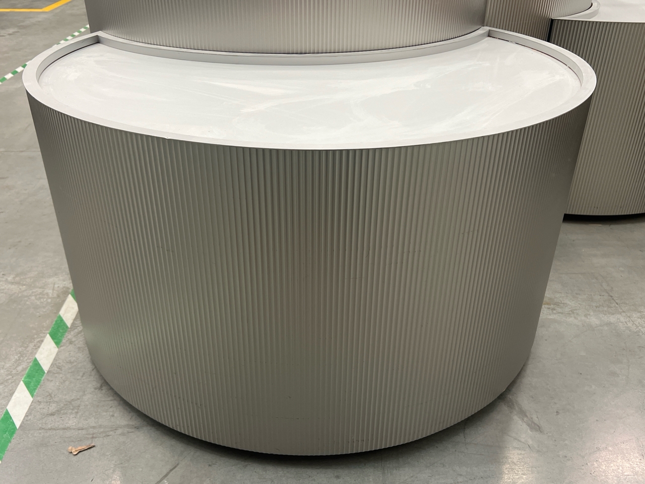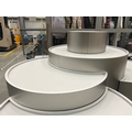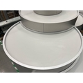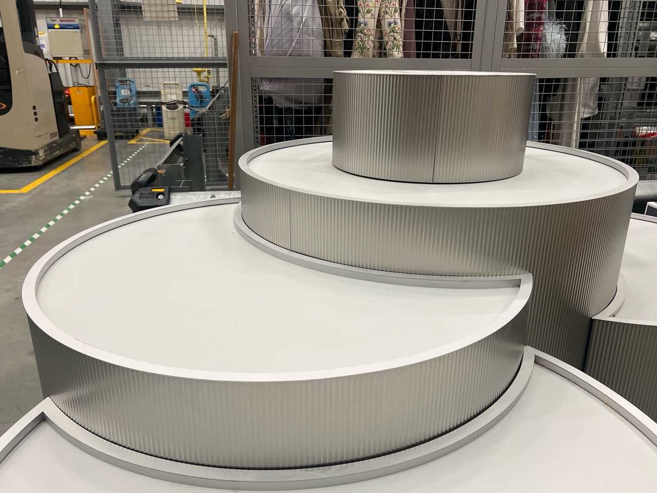 Large curved five-part display unit with internal storage / Approx. 1.3m h x 2.3m w x 2.2m d / See images for example condition