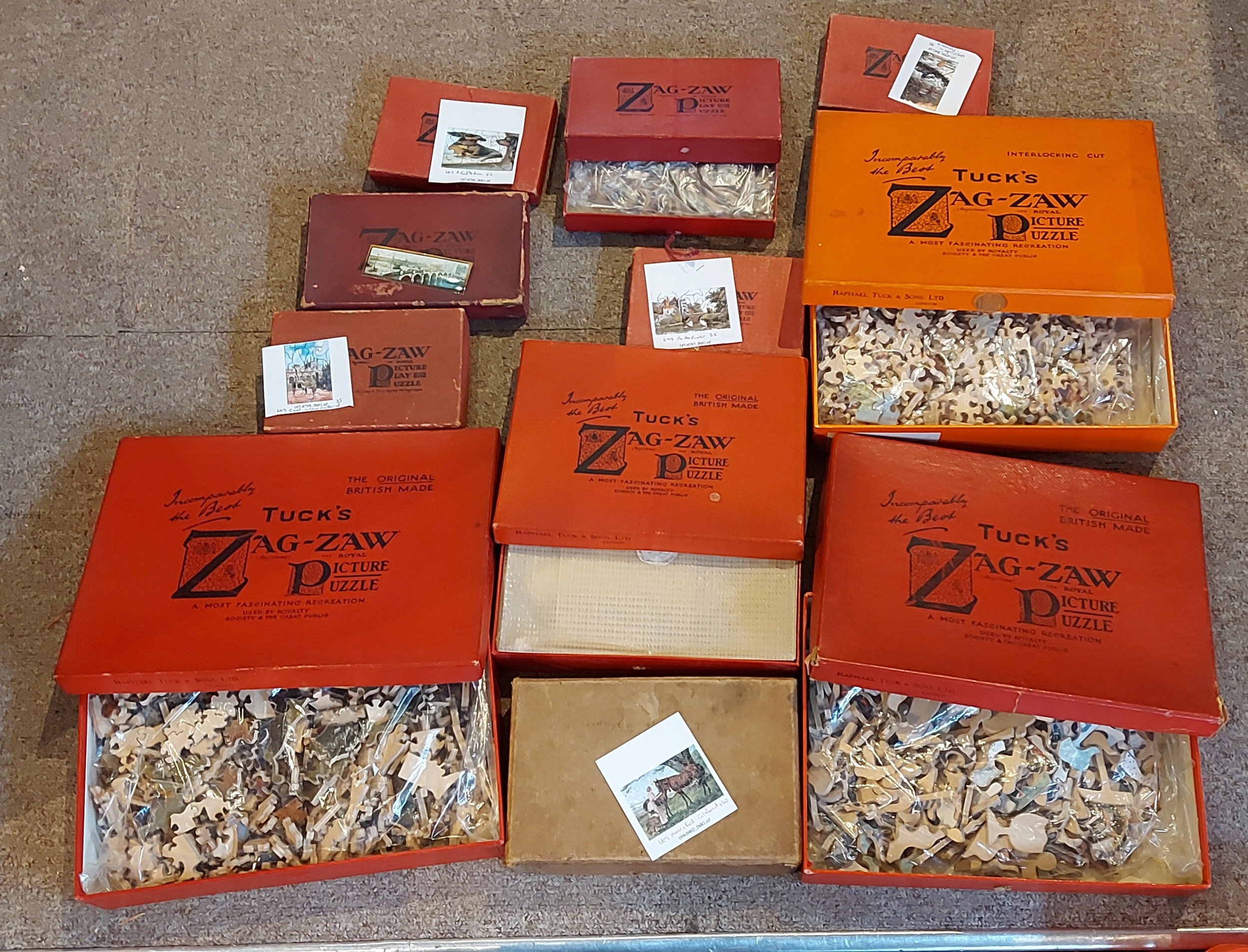 A Raphael Tuck and Sons Zag-Zaw Jigsaw A Country Bouquet together with another A Rural Post Office and nine other Jigsaws by Zag-Zaw, one unboxed