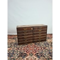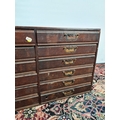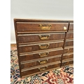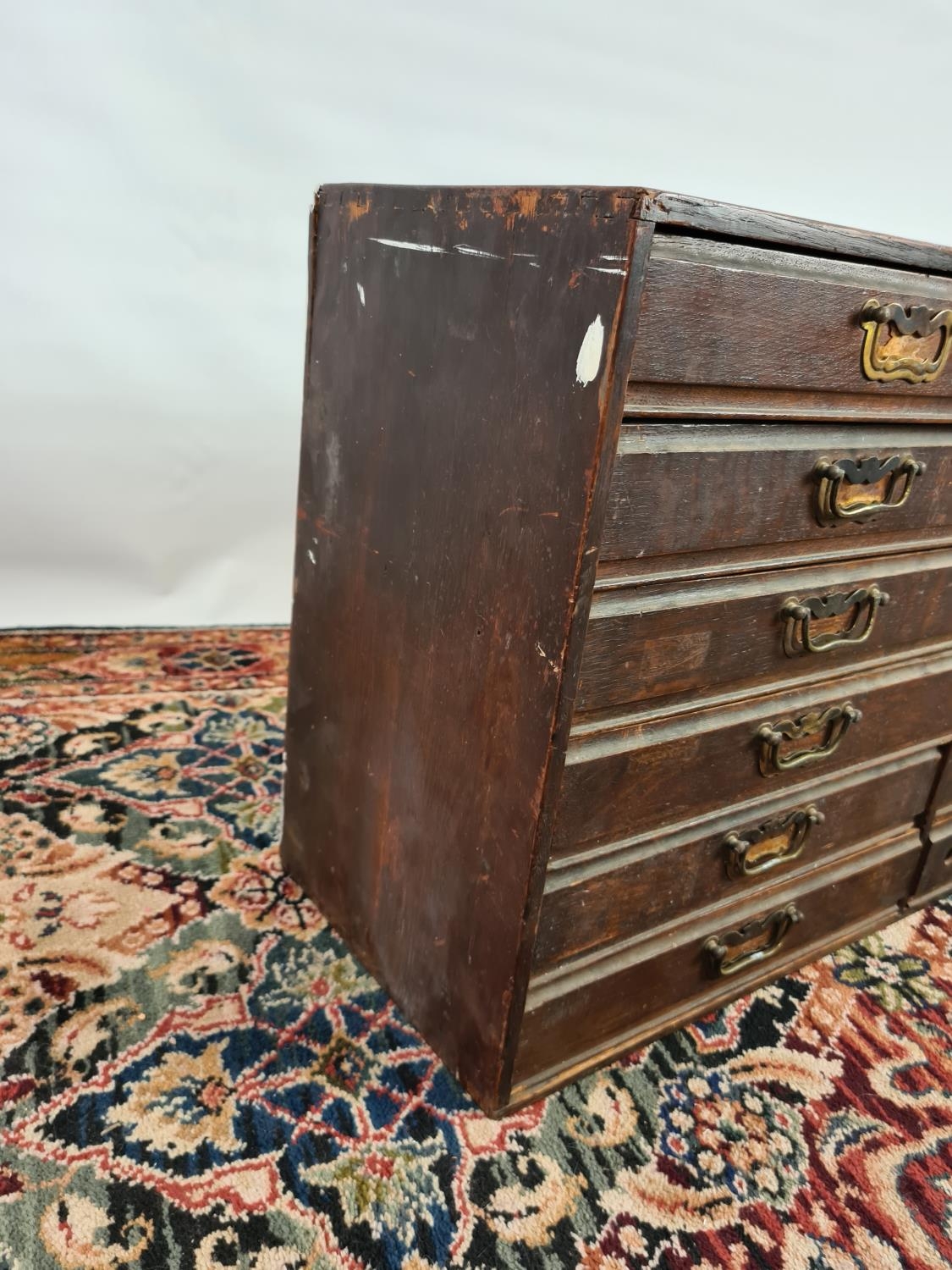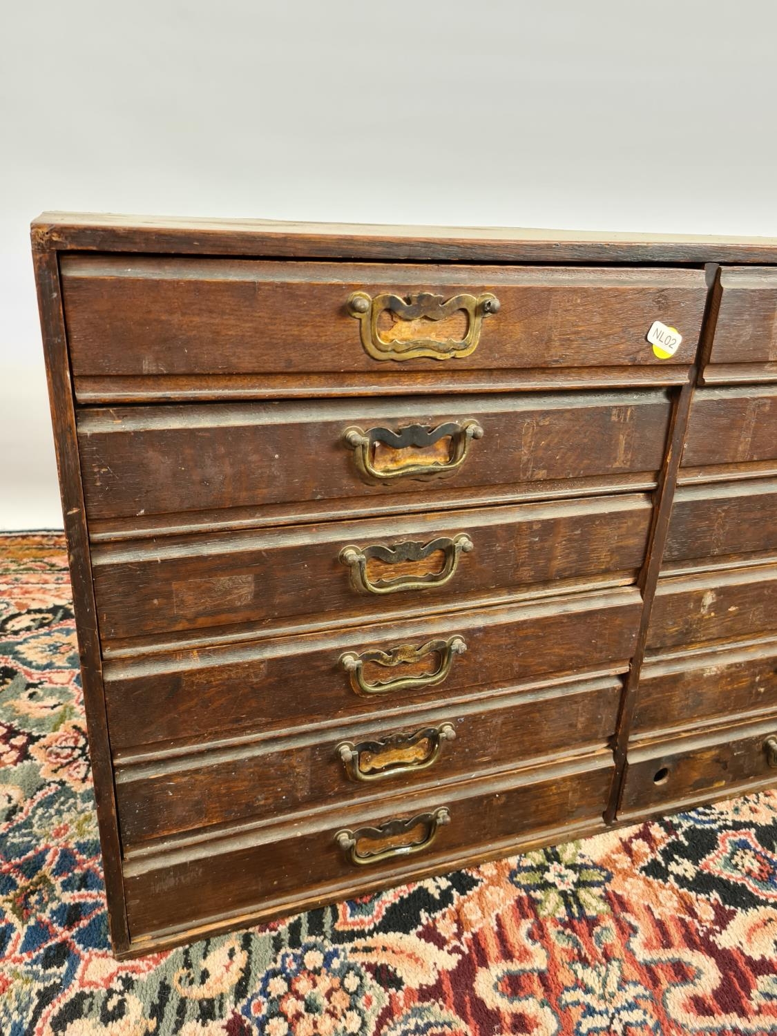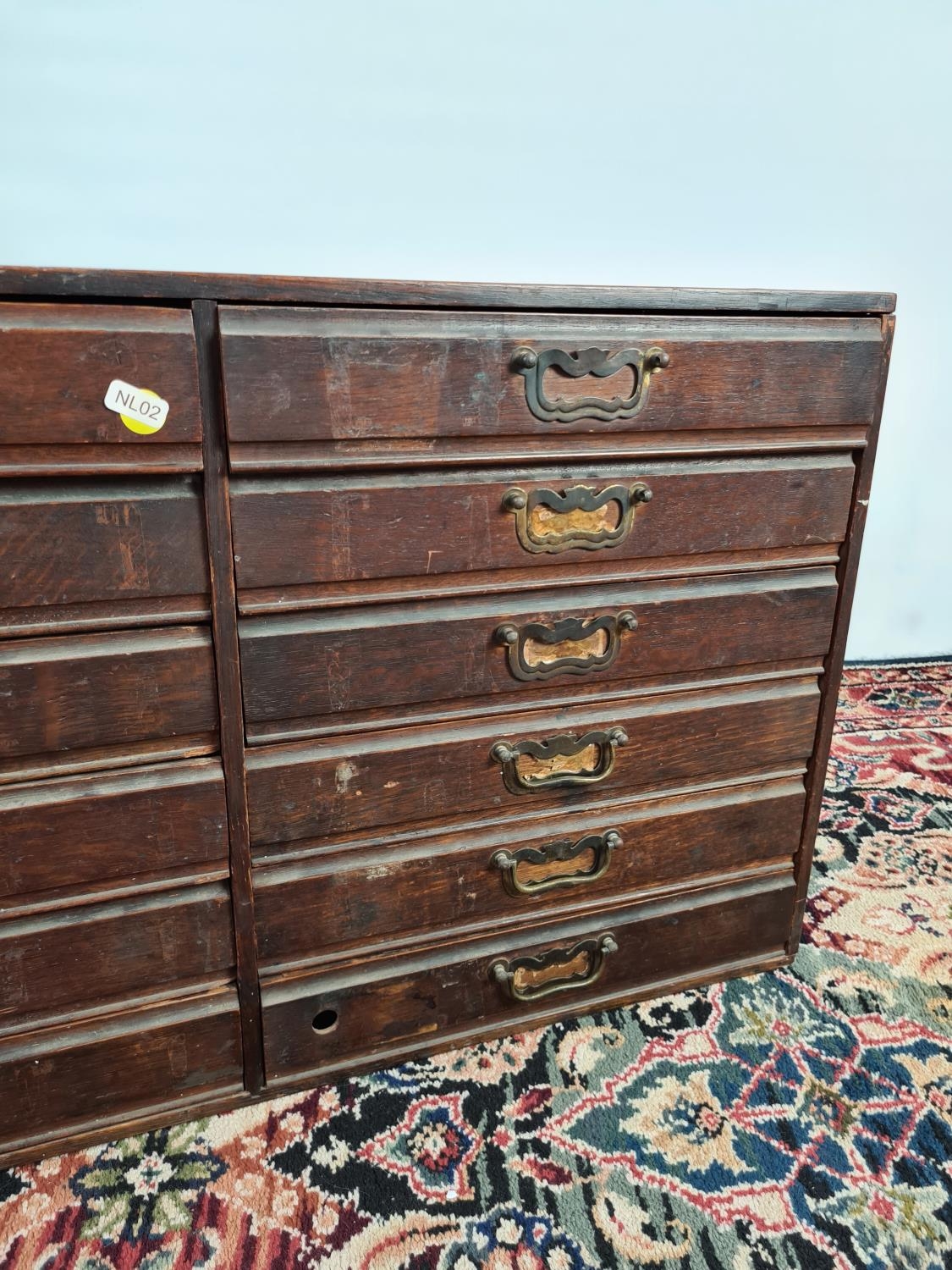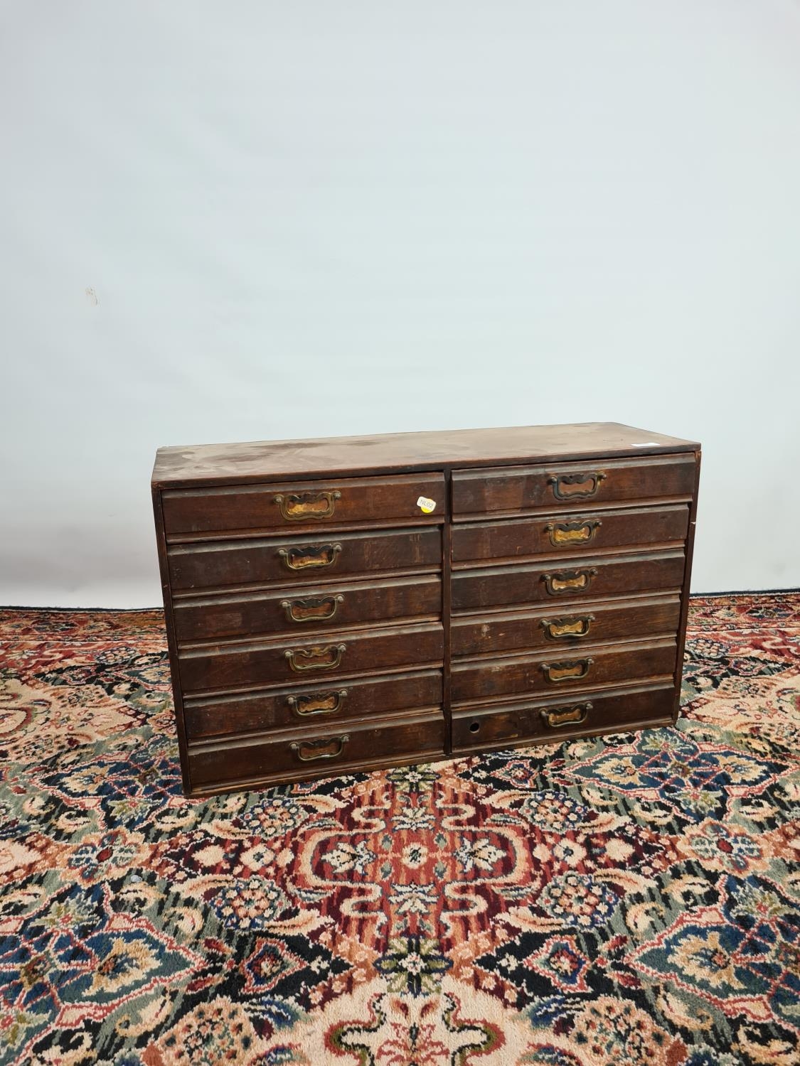 An early 20th century oak twelve drawer index cabinet with brass handles - measuring approx. 78cm in width, 46cm in height and 27cm in depth