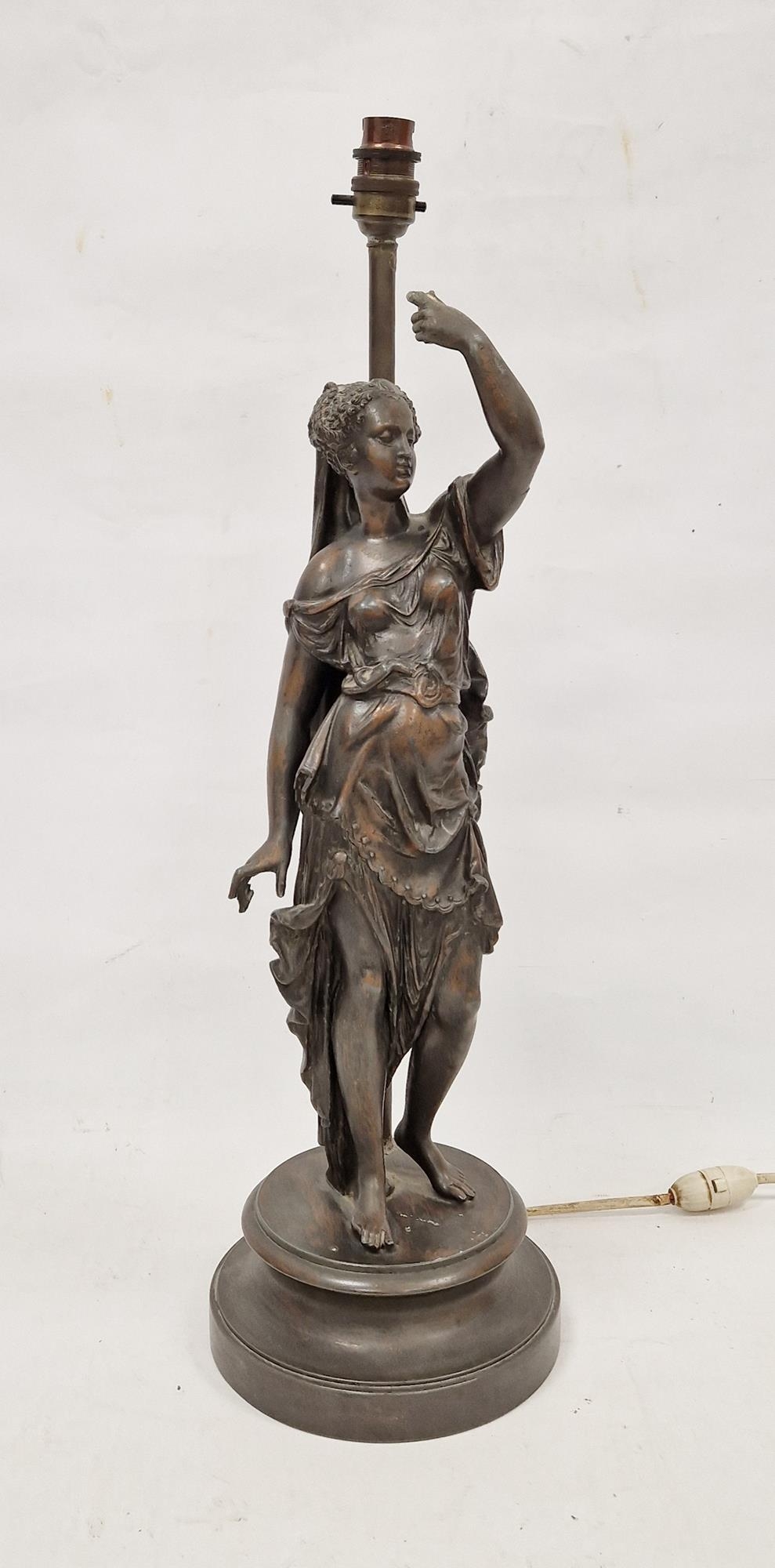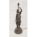 20th century bronzed metal figural table lamp, cast with a scantily-draped woman raising her left hand, before column light, on socle base, electrified, 57.5cm high including attachments (adapted for electricity, the column light a later edition)