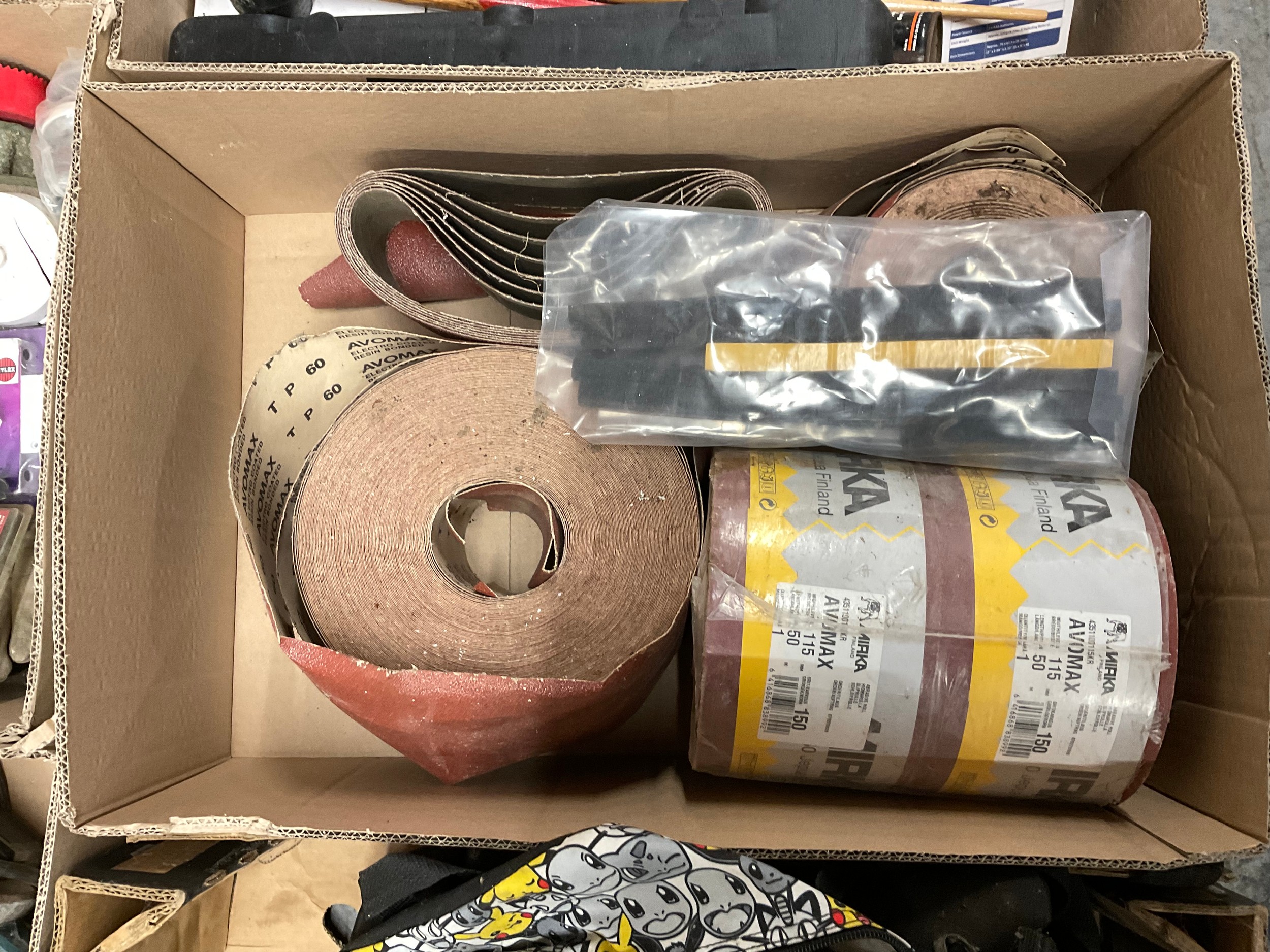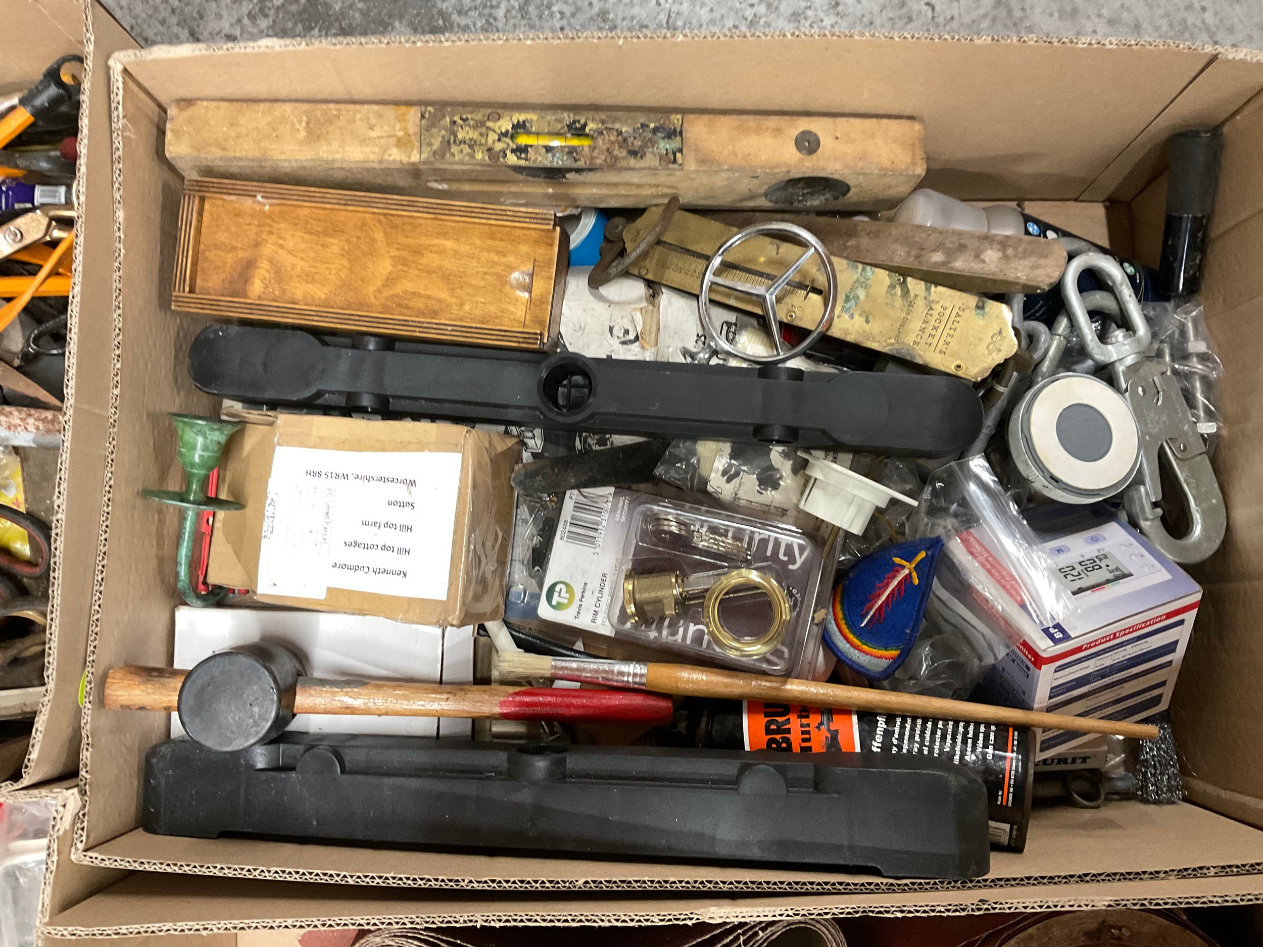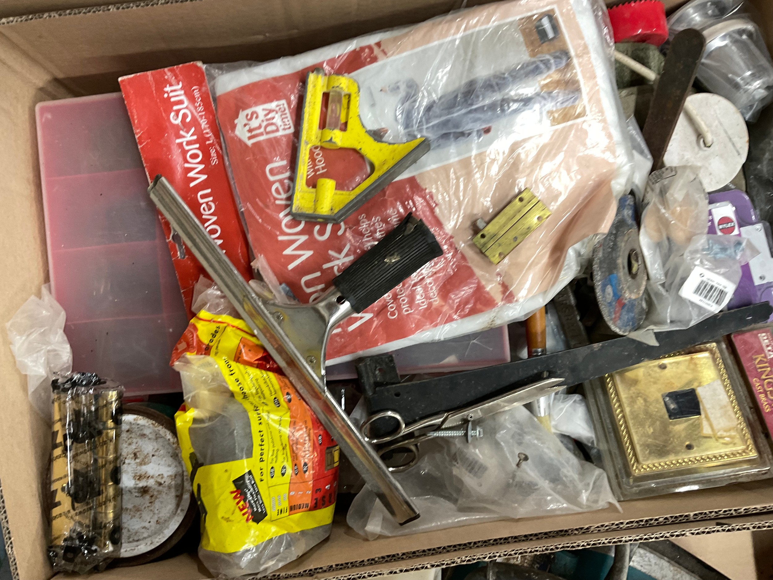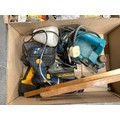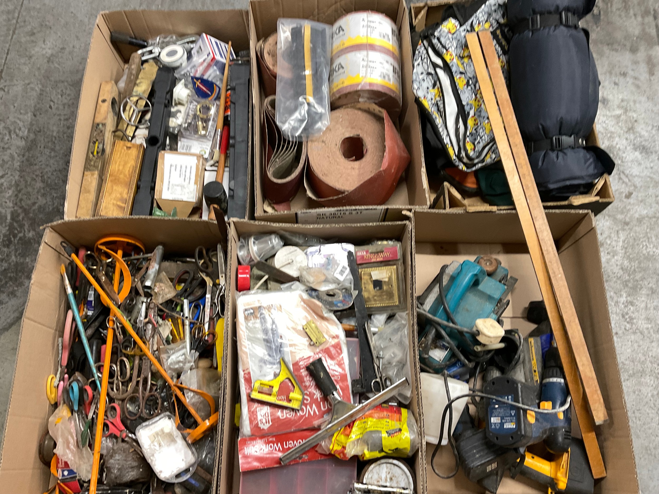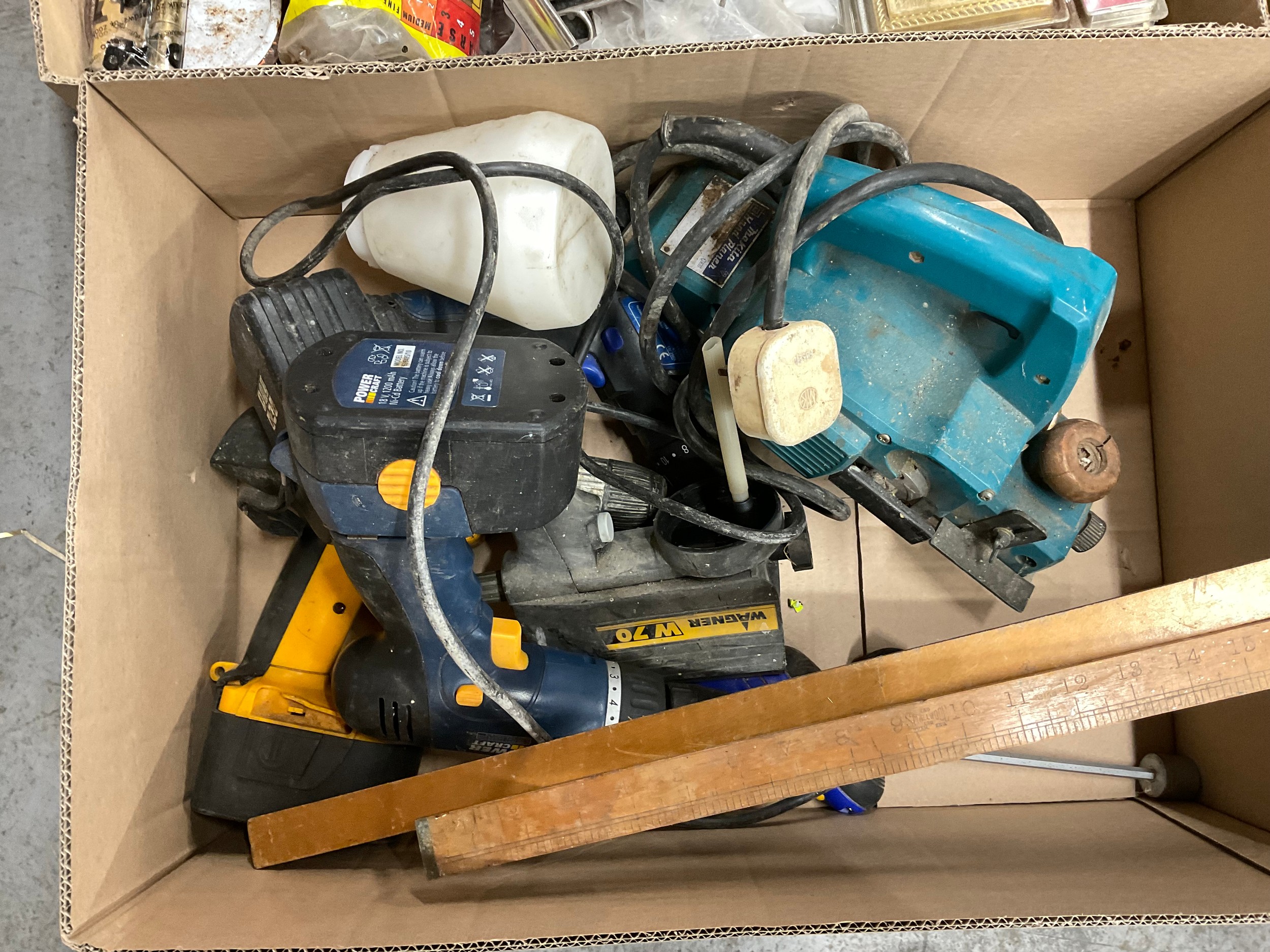 6 BOXES OF WORKSHOP ITEMS TO INCLUDE MAKITA ELECTRIC PLANER, CORDLESS DRILL, HAND TOOLS, HARDWARE ETC