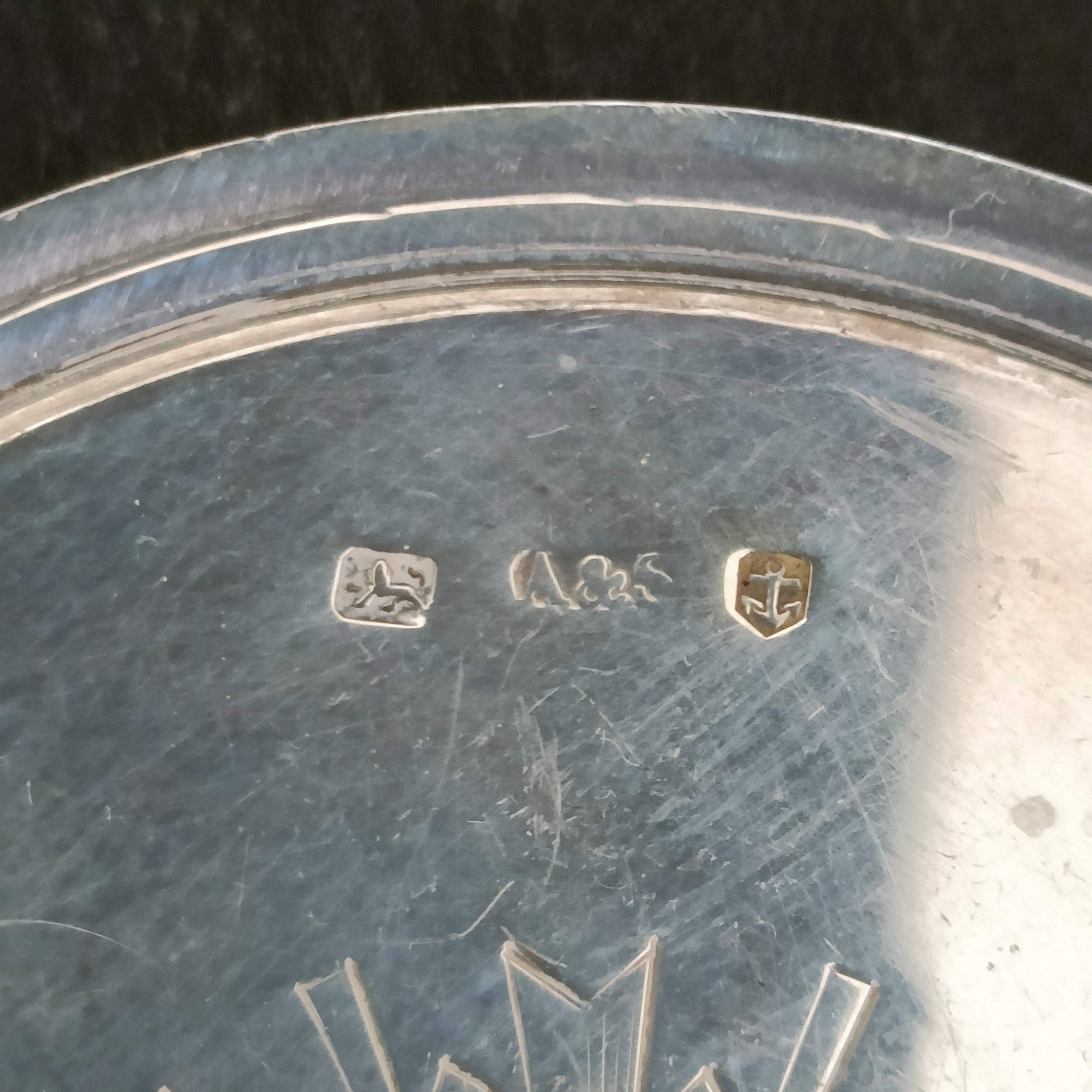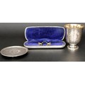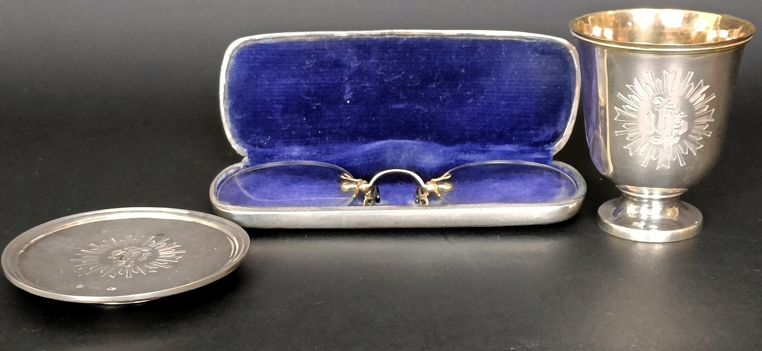 A Victorian silver communion cup and tray, 1.9 ozt, 6 cm high, a George V silver spectacle case, and a pair of spectacles