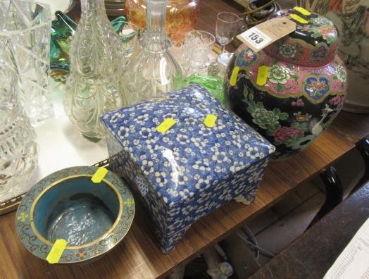 ORIENTAL FOOTED DISH, VASE WITH LID AND CLOISONNE DISH