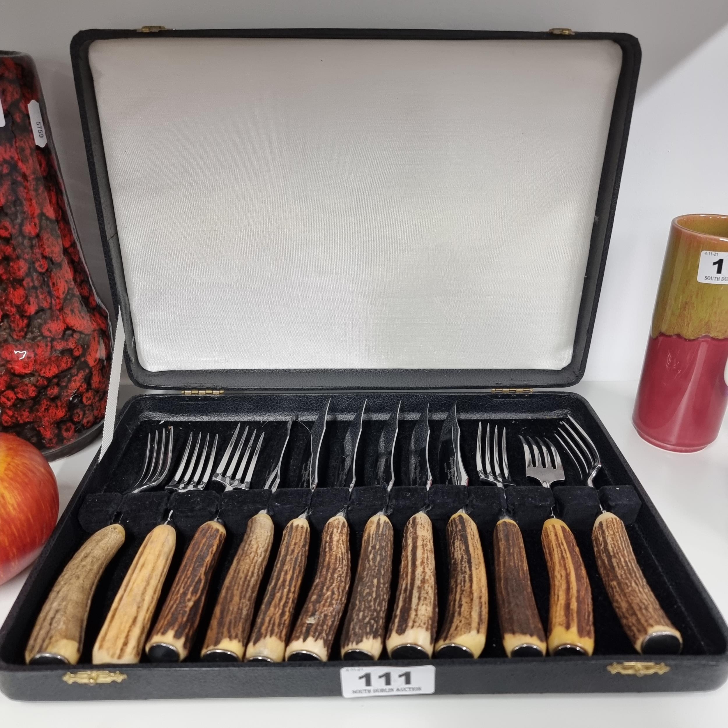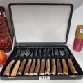 A vintage set of Brucut cutlery comprising of six pairs of steak knives and forks with stag antler handles presented in a luxury case. Made in Sheffield. Selling on Etsy for €240.