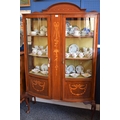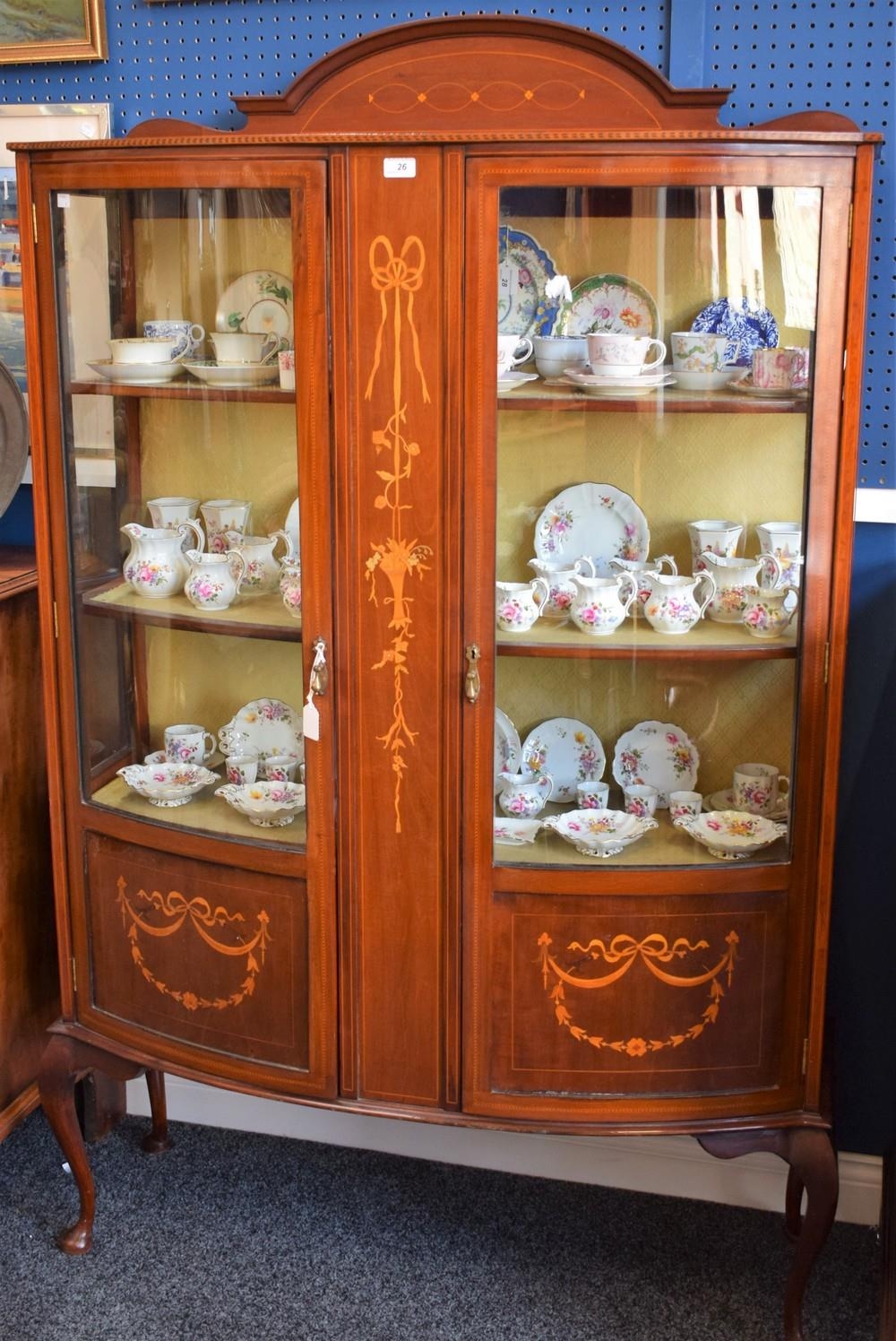 A Sheraton Revival mahogany and marquetry bow-front display cabinet, arched half gallery above a pair of three-quarter glazed doors outlined with barber-pole stringing enclosing three shelves, the lower panels inlaid with ribbon-tied trailing bell husks, centred by a further panel inlaid with a trailing flowering bouquet, cabriole legs, pad feet, 182cm high